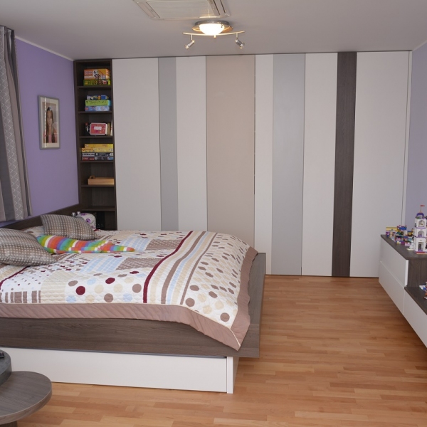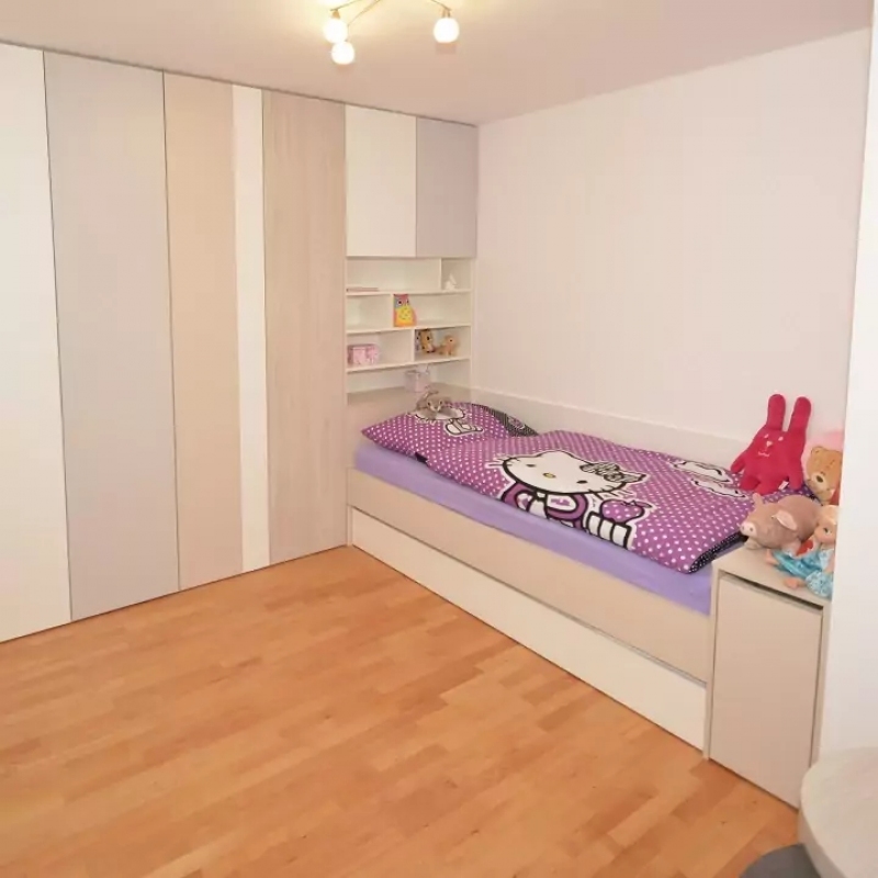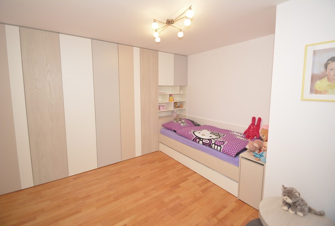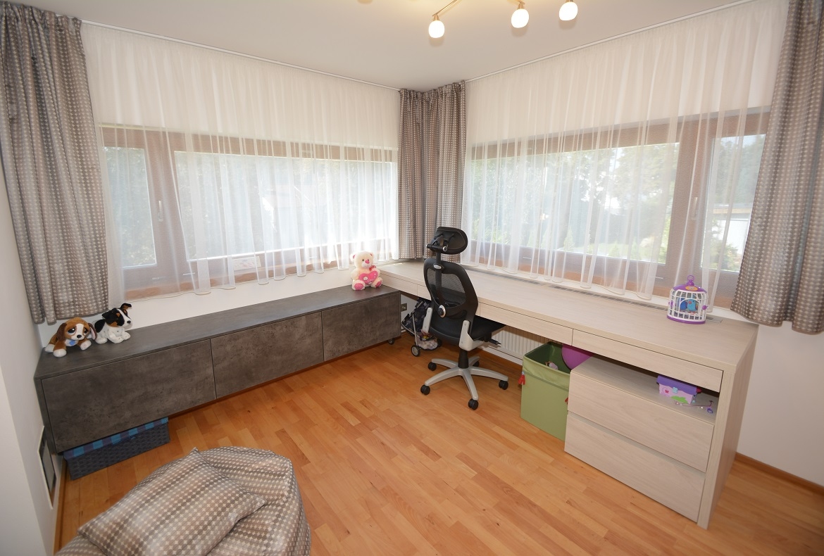 Dětský pokoj s velkým psacím stolem, který je napojený na jednoduchou komodu.