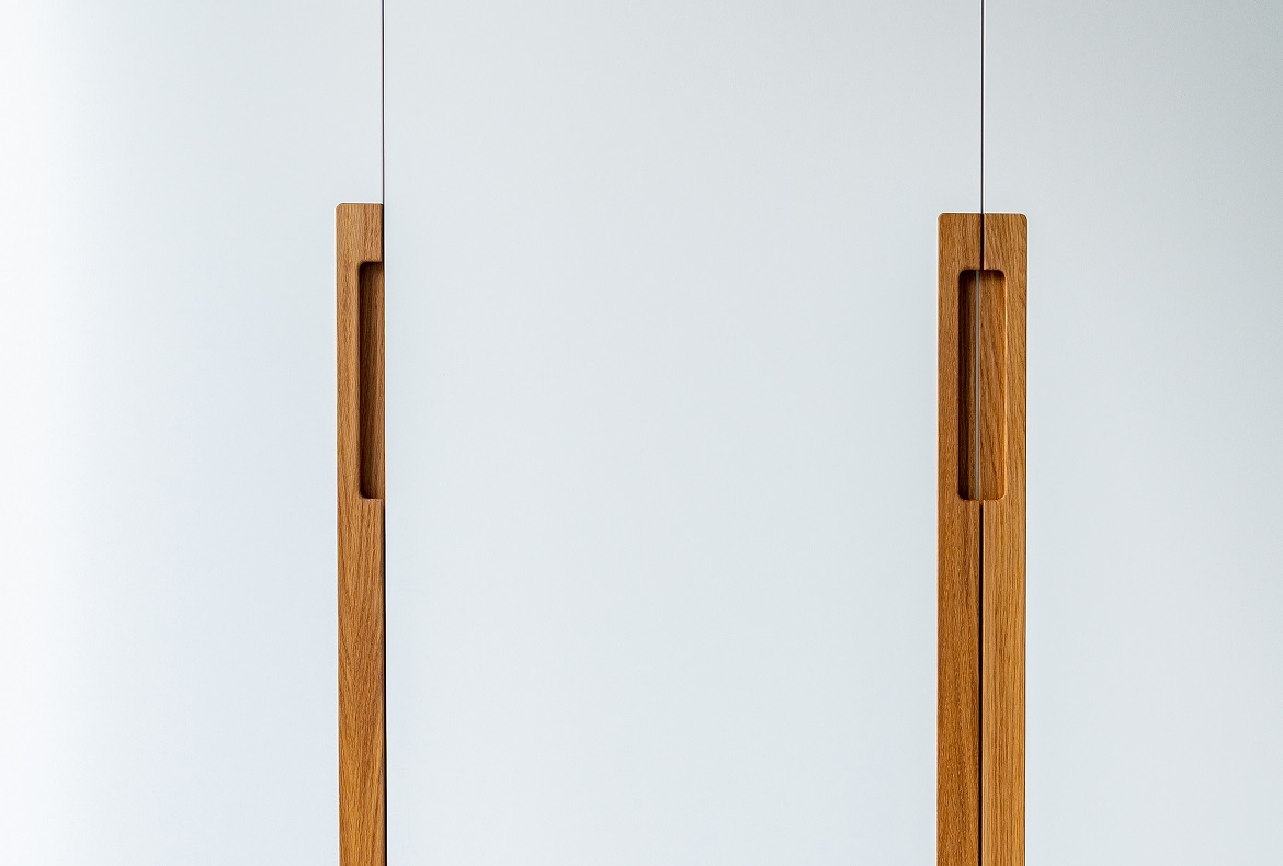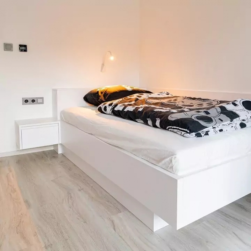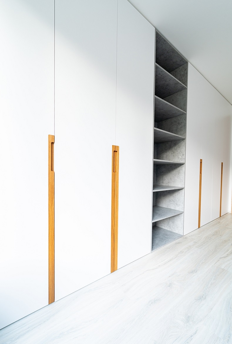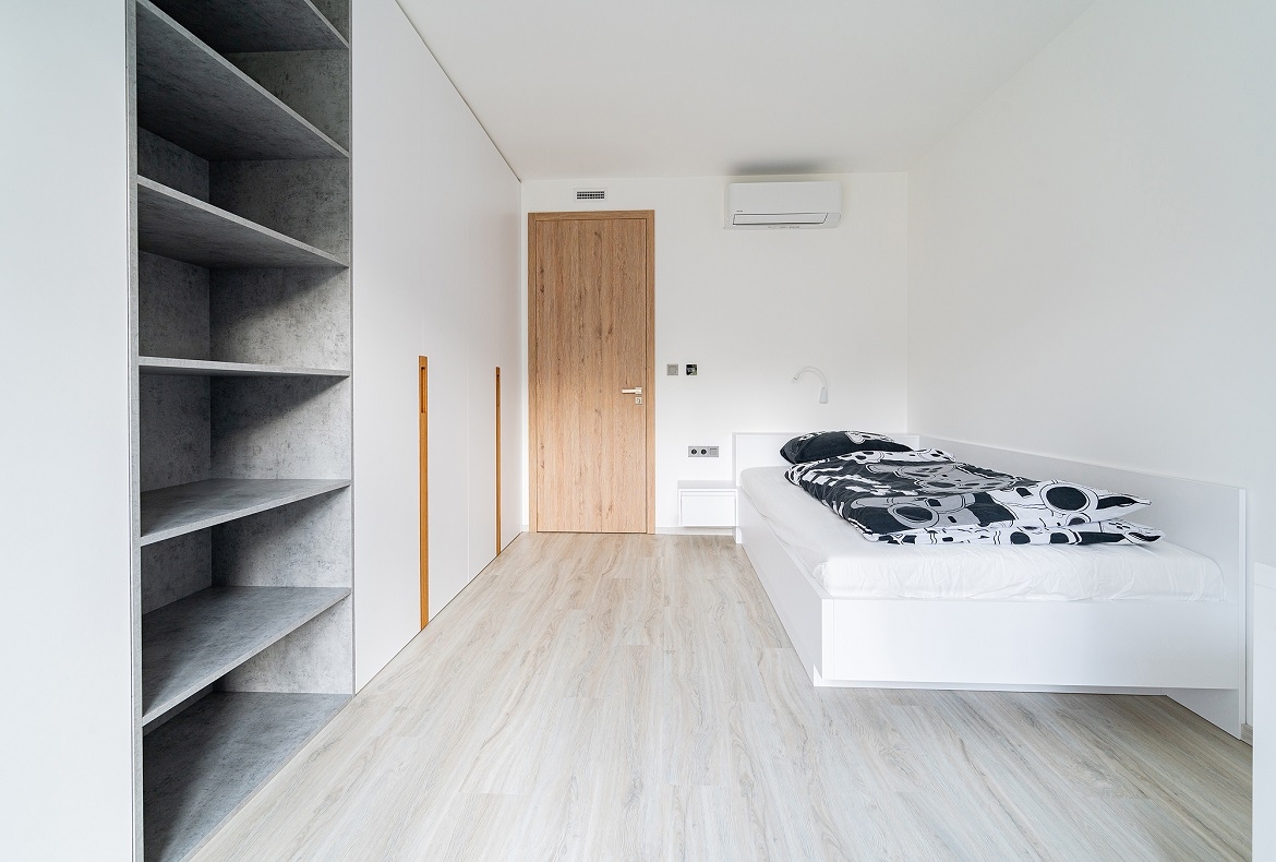 Světlý dětský pokoj s velkou vestavěnou skříní a středovou policí v betonu.