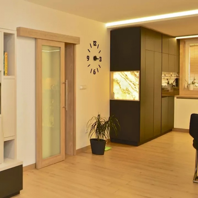 Bezfalcové prosklené a plné dveře, které mohou plynule navazovat na nábytek.