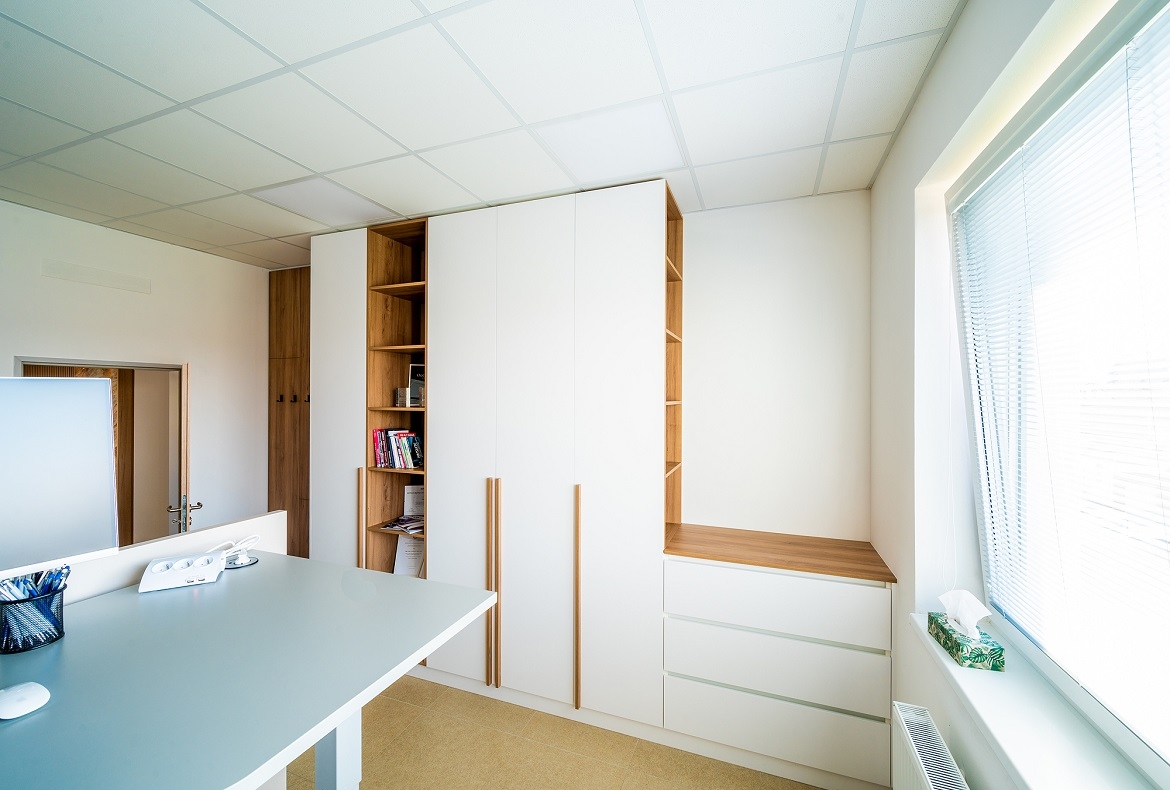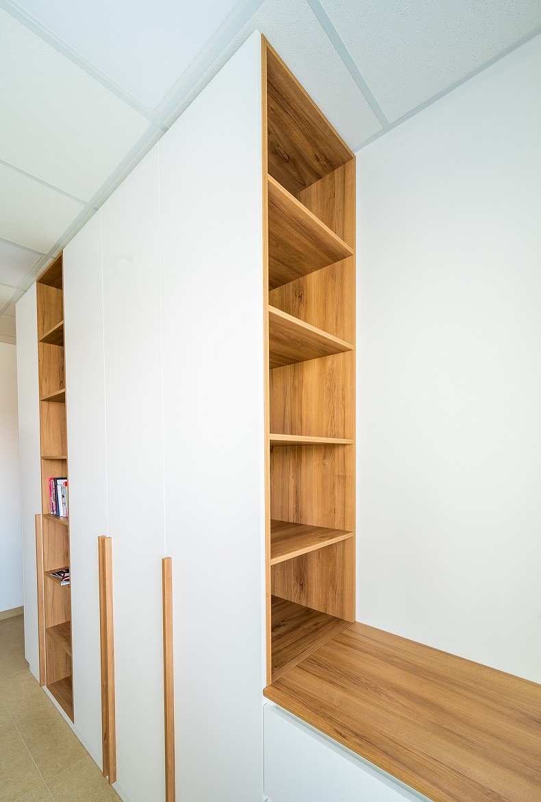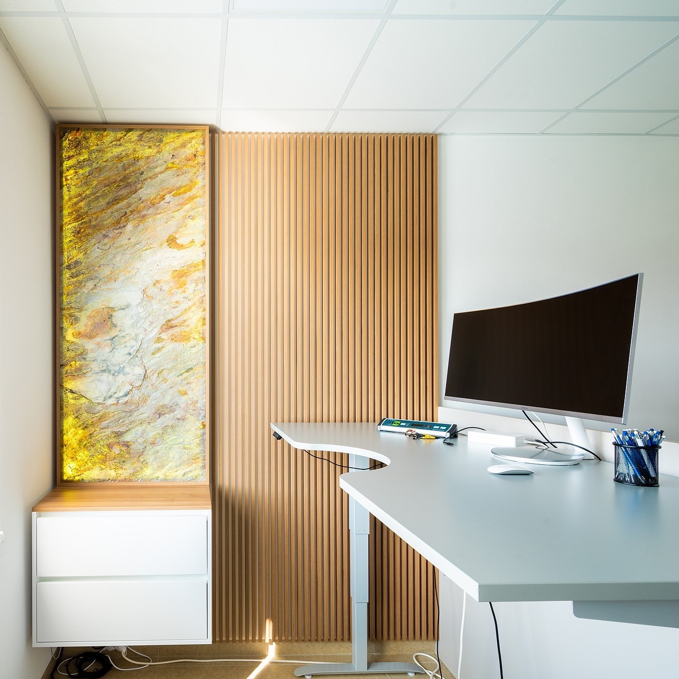 Moderní prostory, kde jsou kombinované nové prvky kamenná dýha, rastry a výraznější dekor ořechu.