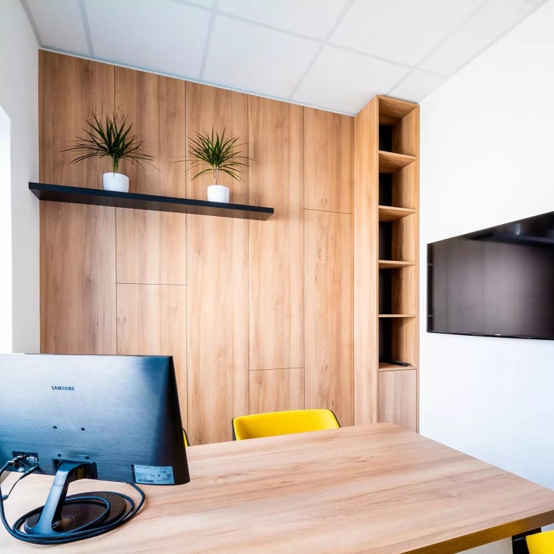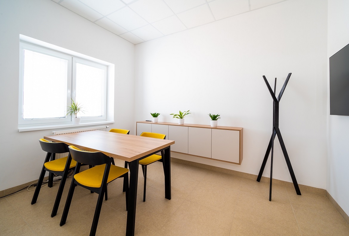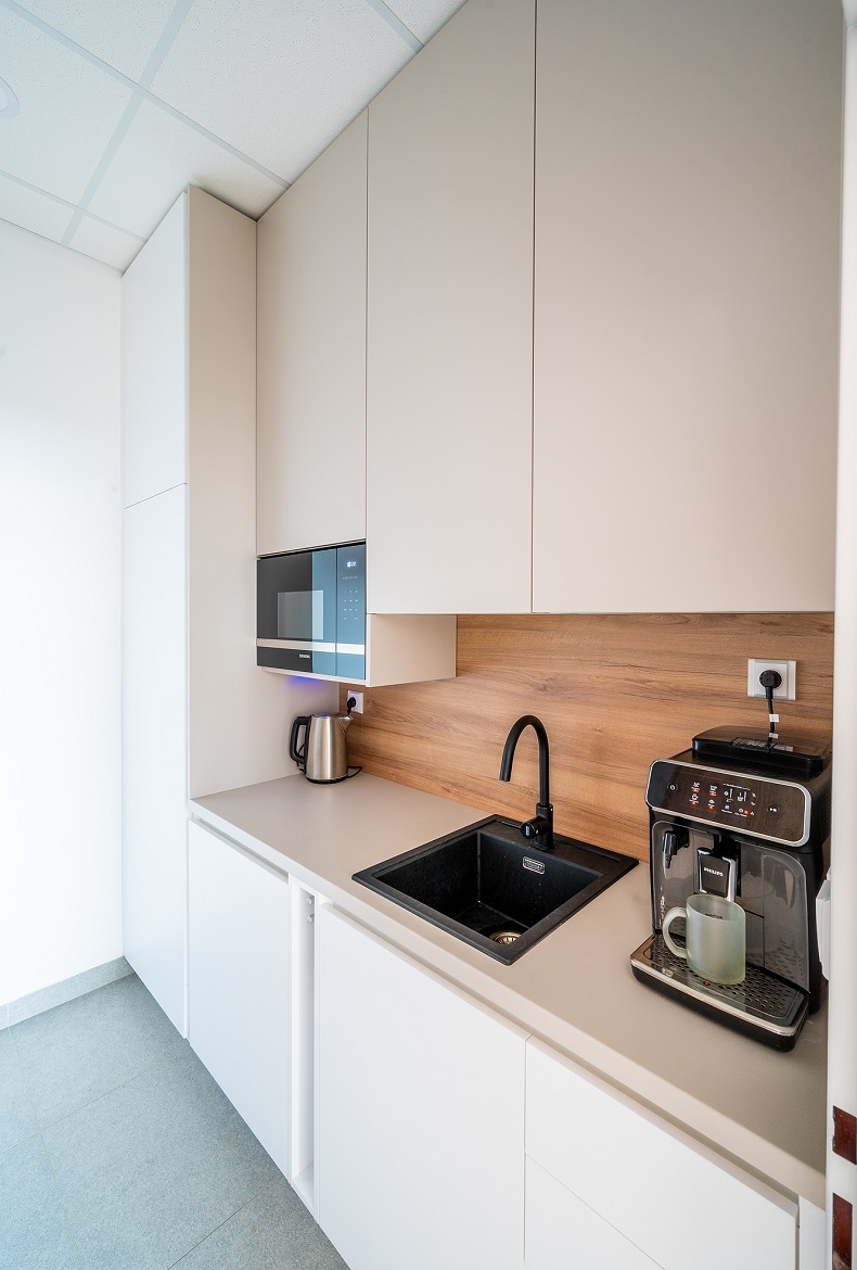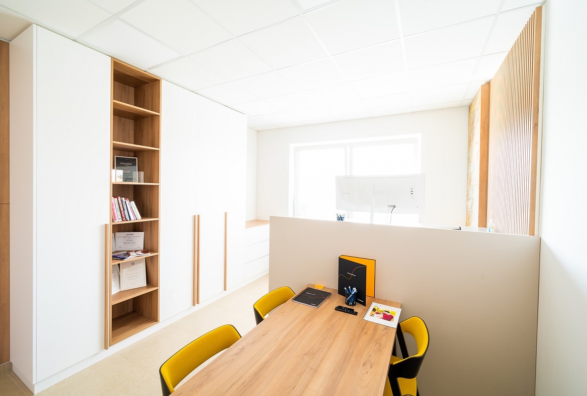 Moderní prostory, kde jsou kombinované nové prvky kamenná dýha, rastry a výraznější dekor ořechu.