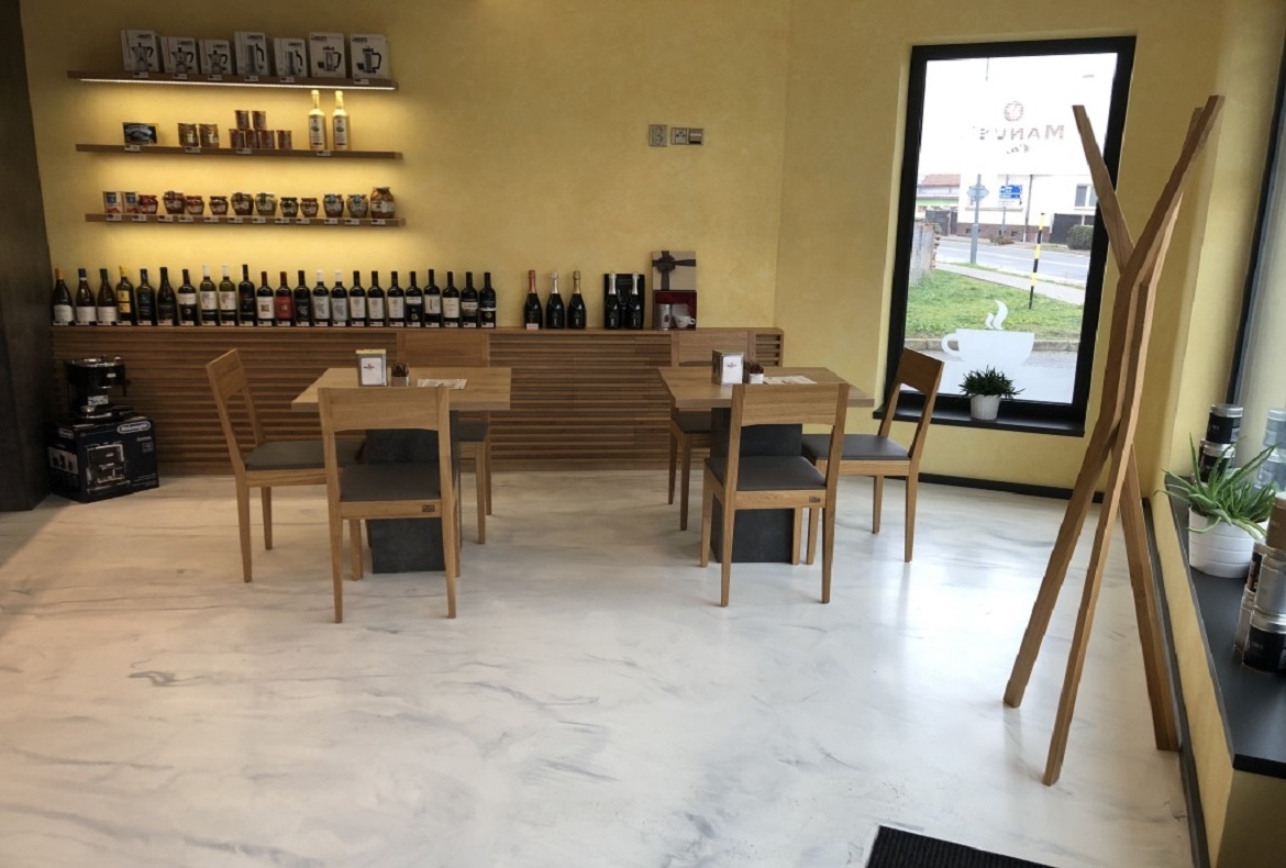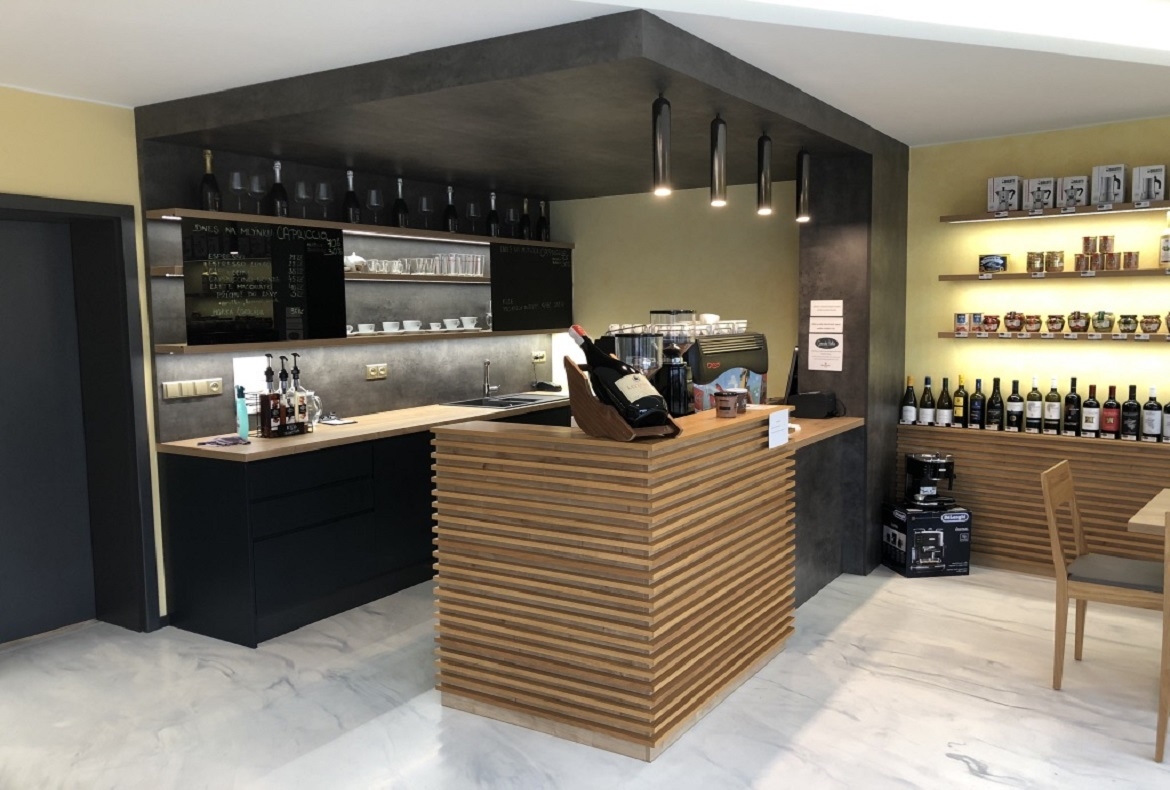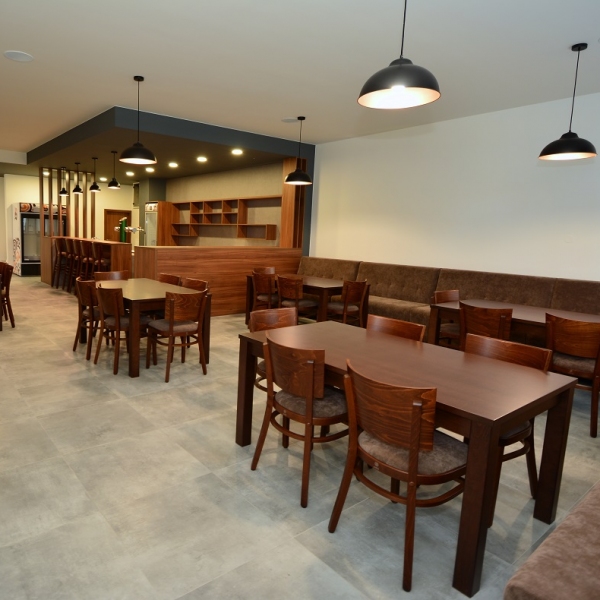 Menší kavárna s černým pohledem doplněná masivním dubem a rastry. Do kavárny jsme také vyráběli stoly, jídelní židle a věšák.
