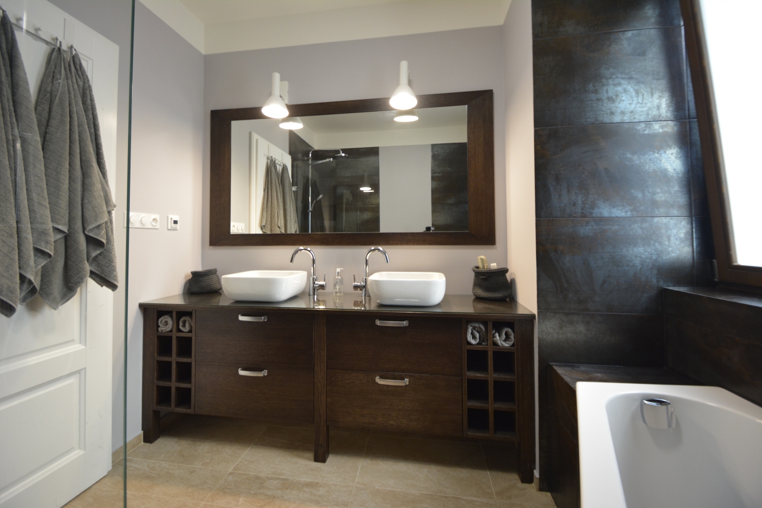 Koupelna v anglickém stylu v přírodních materiálech a typickými prvky pro tento styl.
