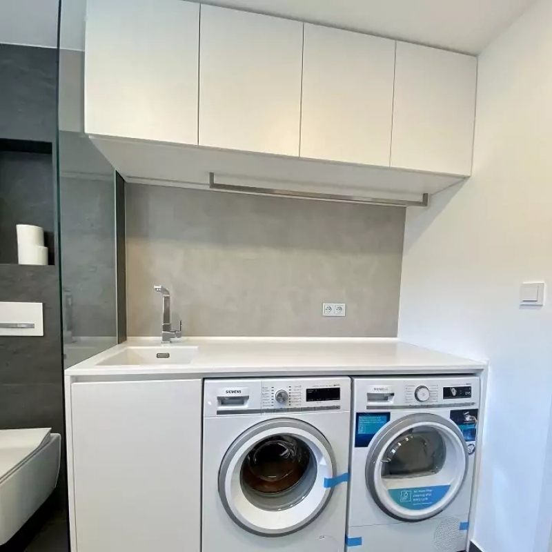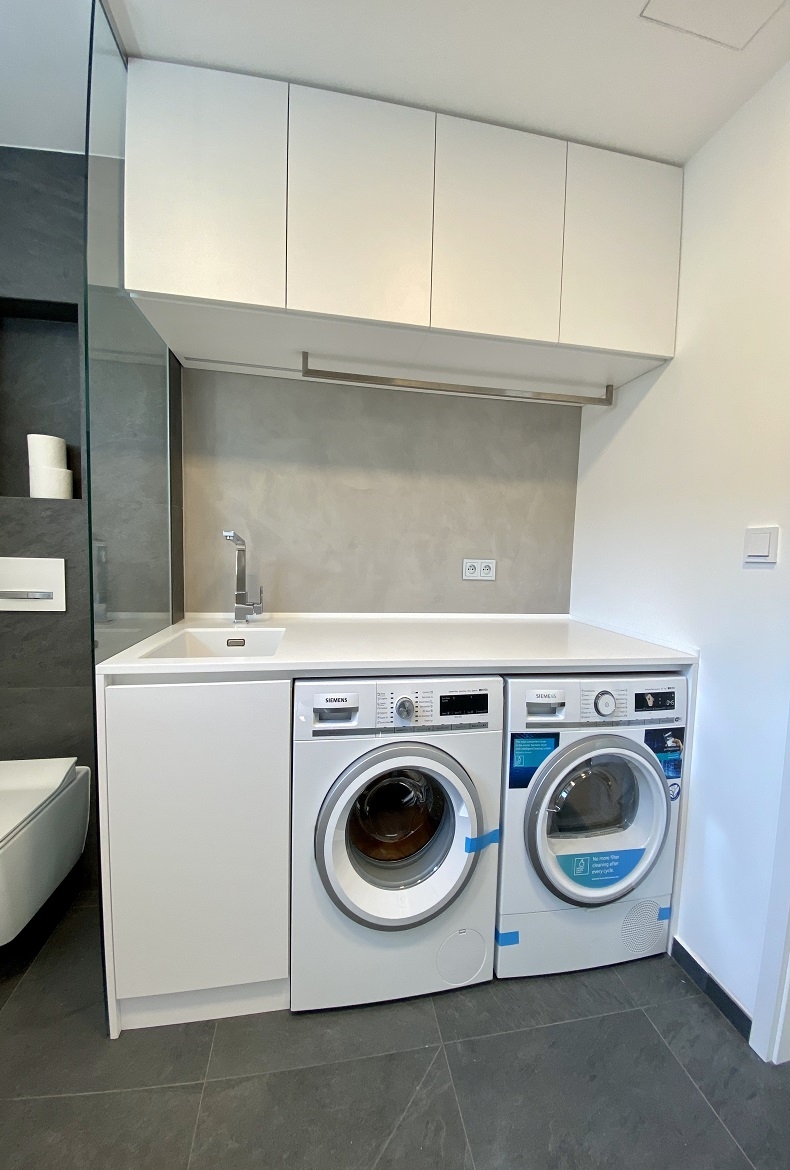 Koupelna v bílém lesku doplněná masivní deskou pro dvě umyvadla.