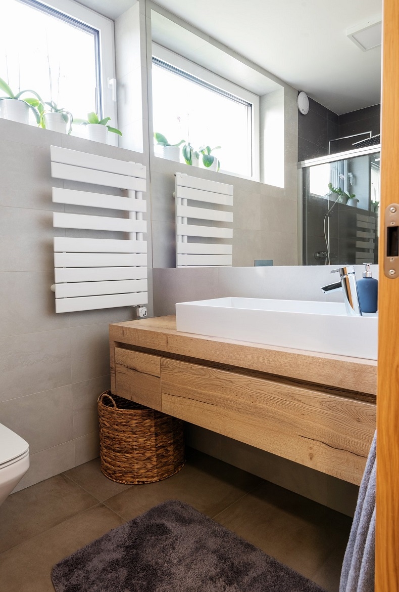 Čistý design koupelny, který je doplněn dubem a umyvadlem na desku.