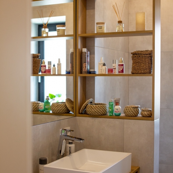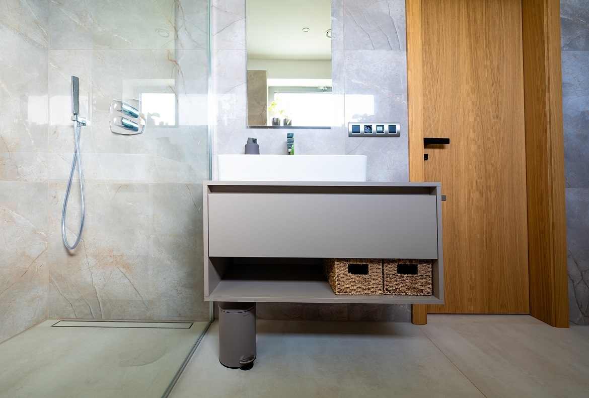 Jednoduchá koupelna v kašmírově šedé. Místo realizace: Vlkoš