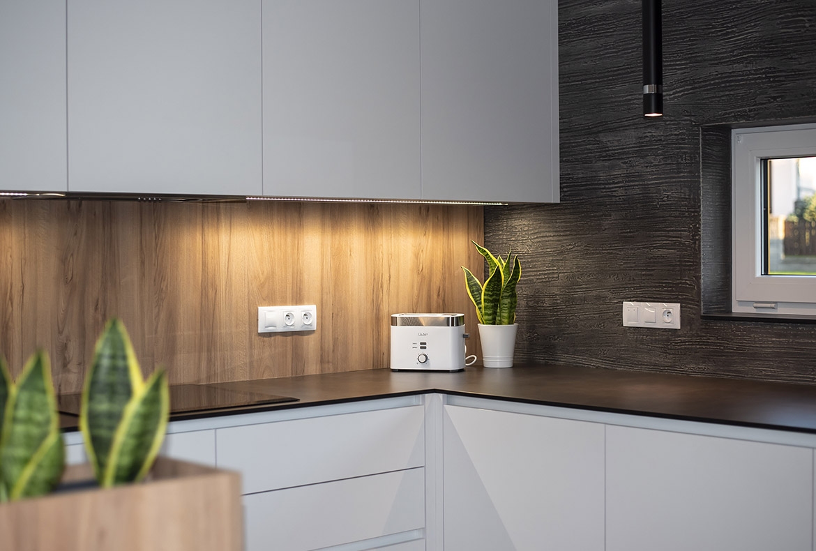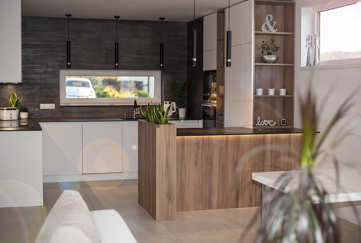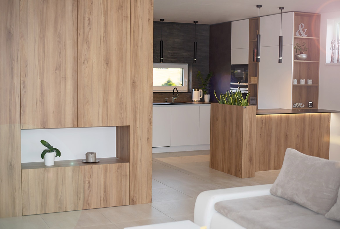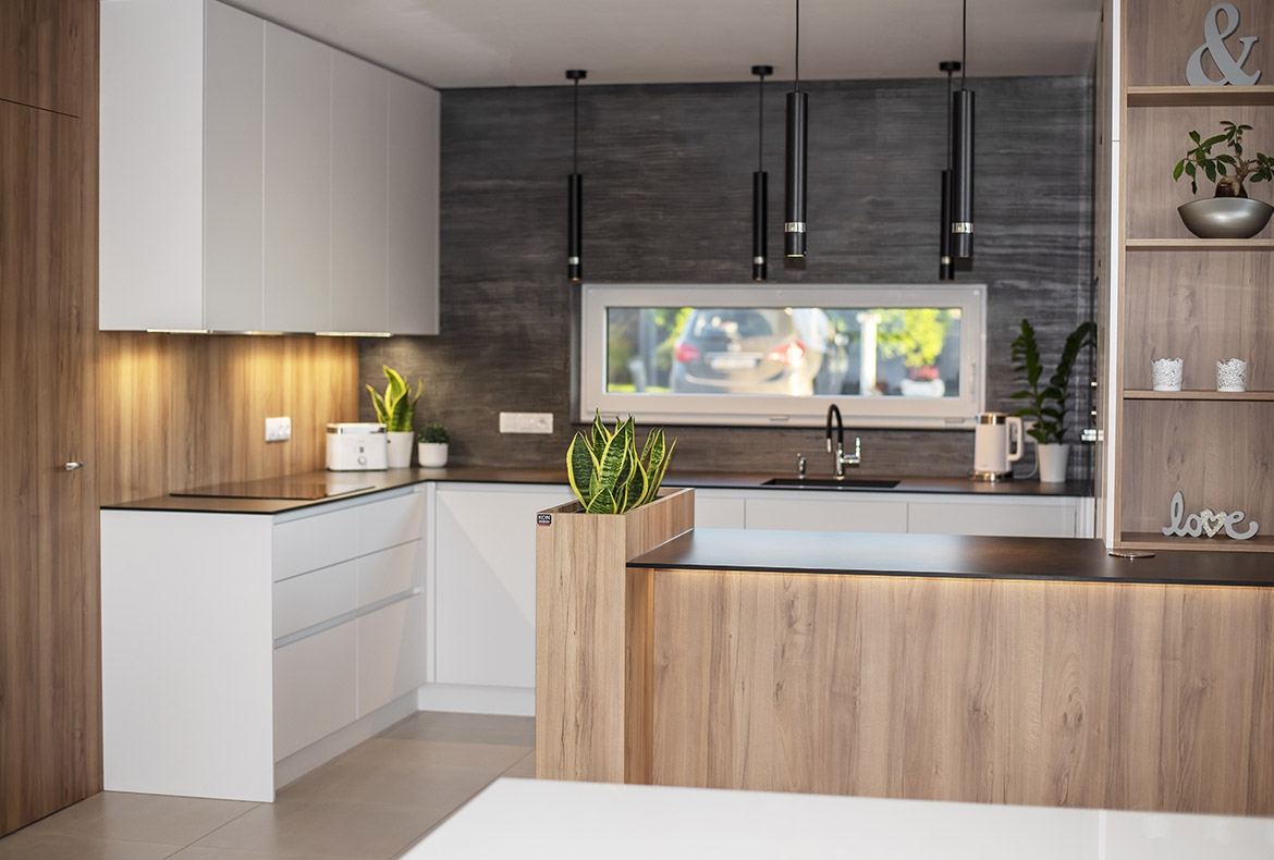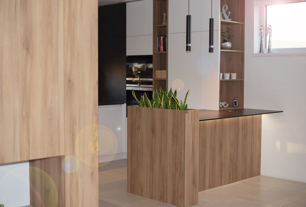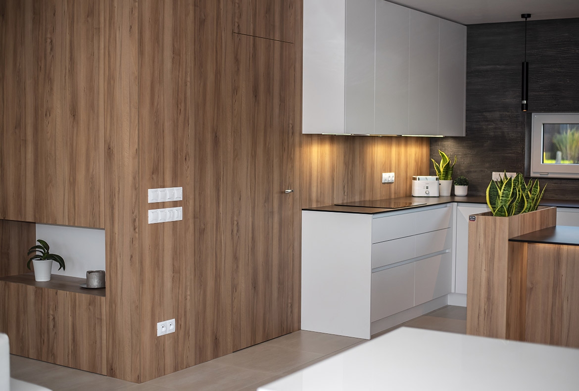Netradiční ořech jsme realizovali s kompaktní pracovní desku se spodní montáží dřezu. Vstup do spíže je přes naše vyladěné bezfalcové dveře.