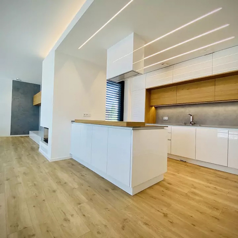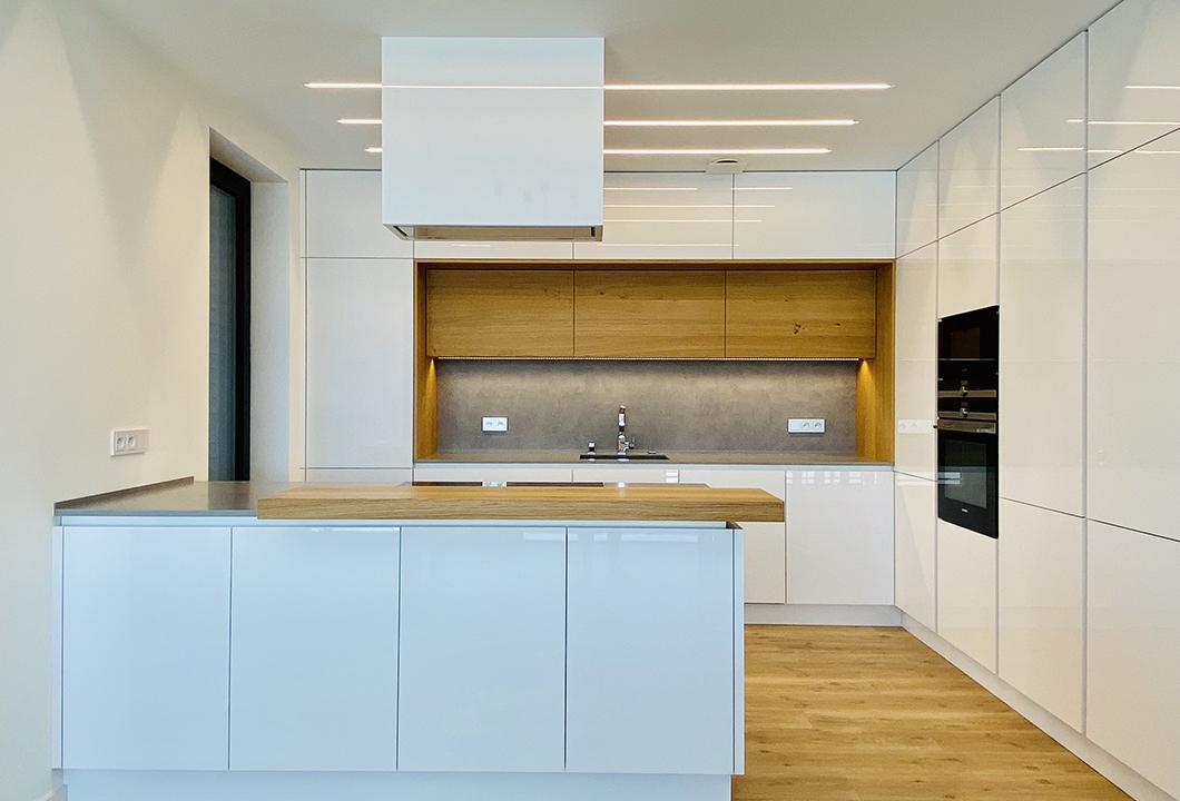 Bílá lesklá kuchyně s přírodní dýhou, stěrkou a pracovní deskou z umělého kamene.