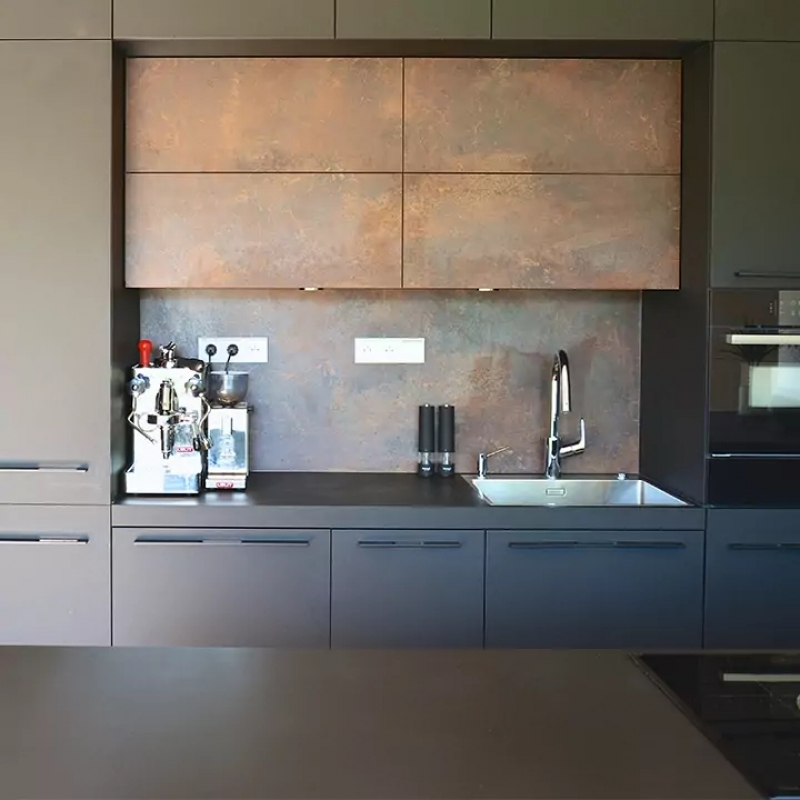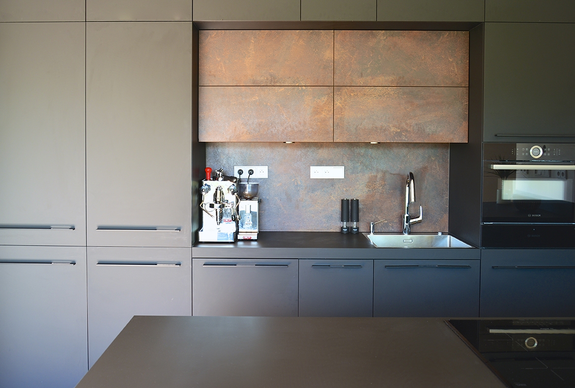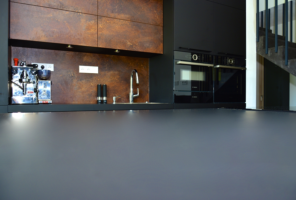 Černá kuchyně s bronzem a velkým ostrůvkem.