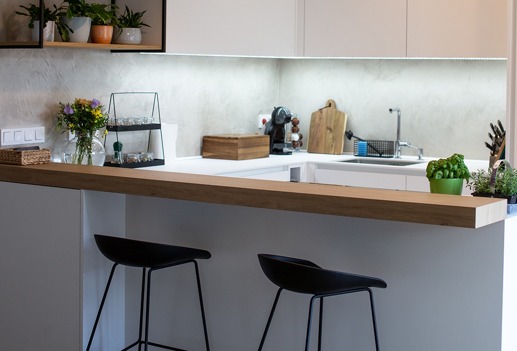 Bílá jednoduchá kuchyně na míru s barovým pultem a vhodnými doplňky.