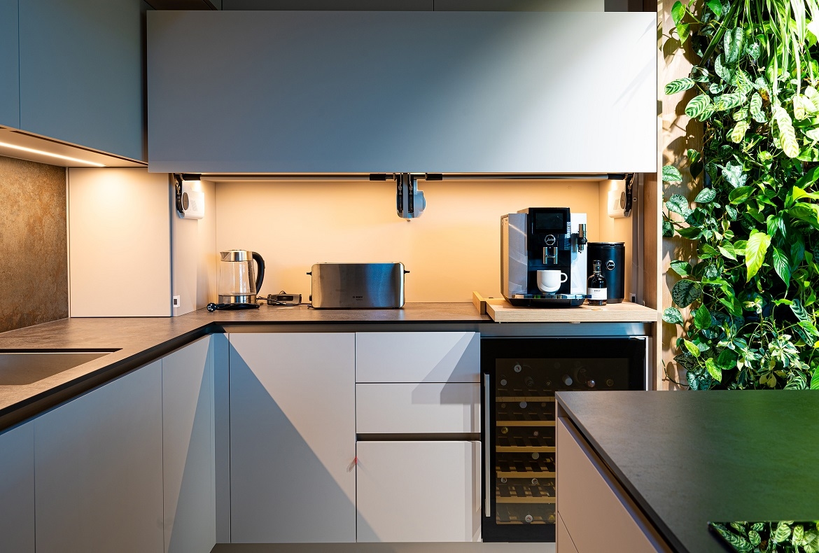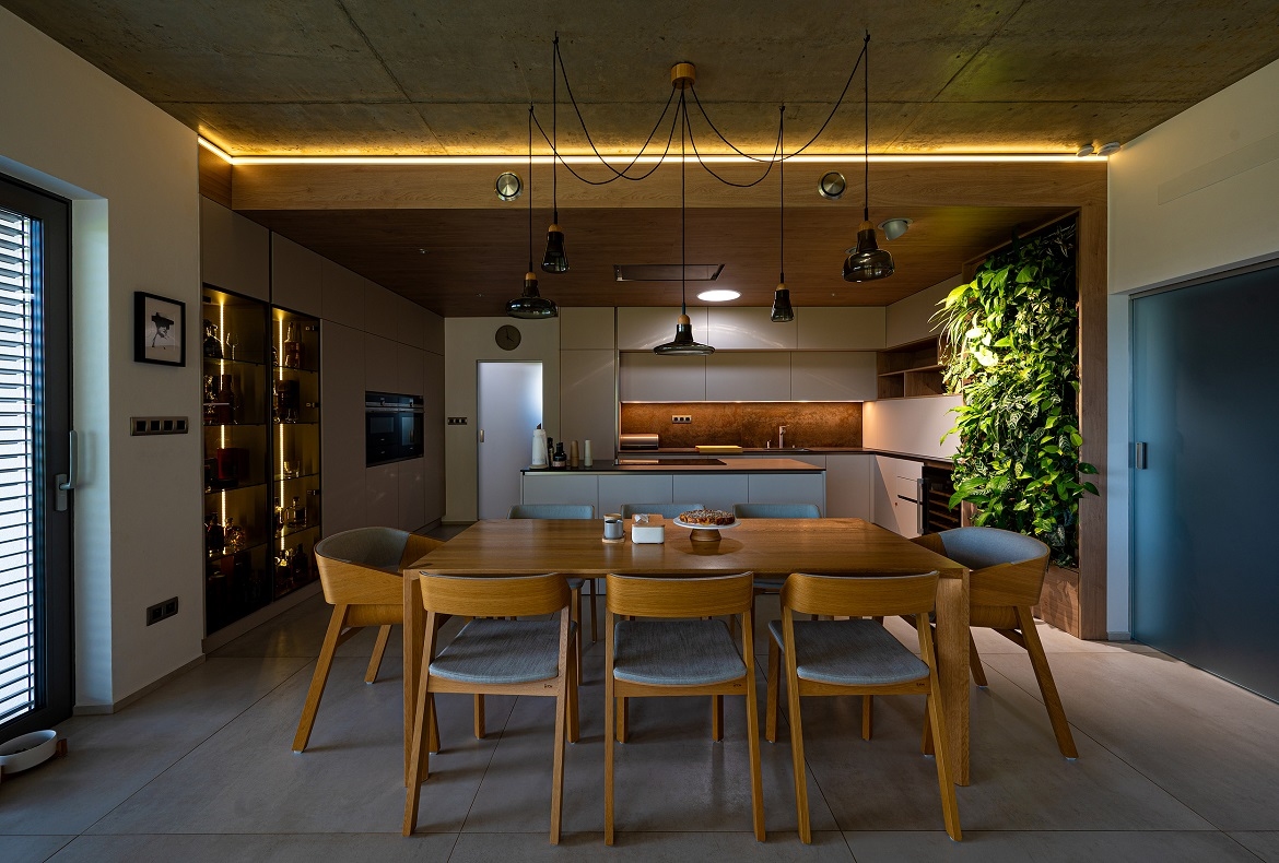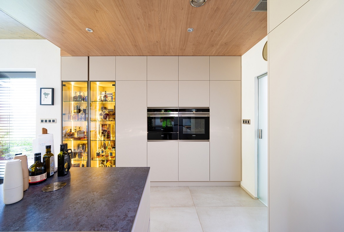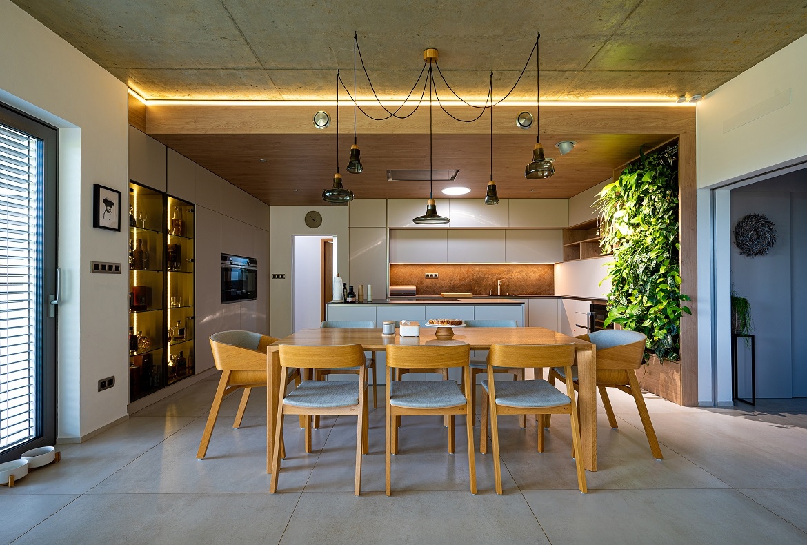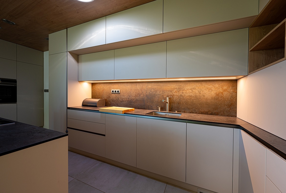 Prostorná jednoduchá kuchyně se zajímavými detaily - obloženým stropem, zelenou stěnou a schovaným snídaňovým koutkem.