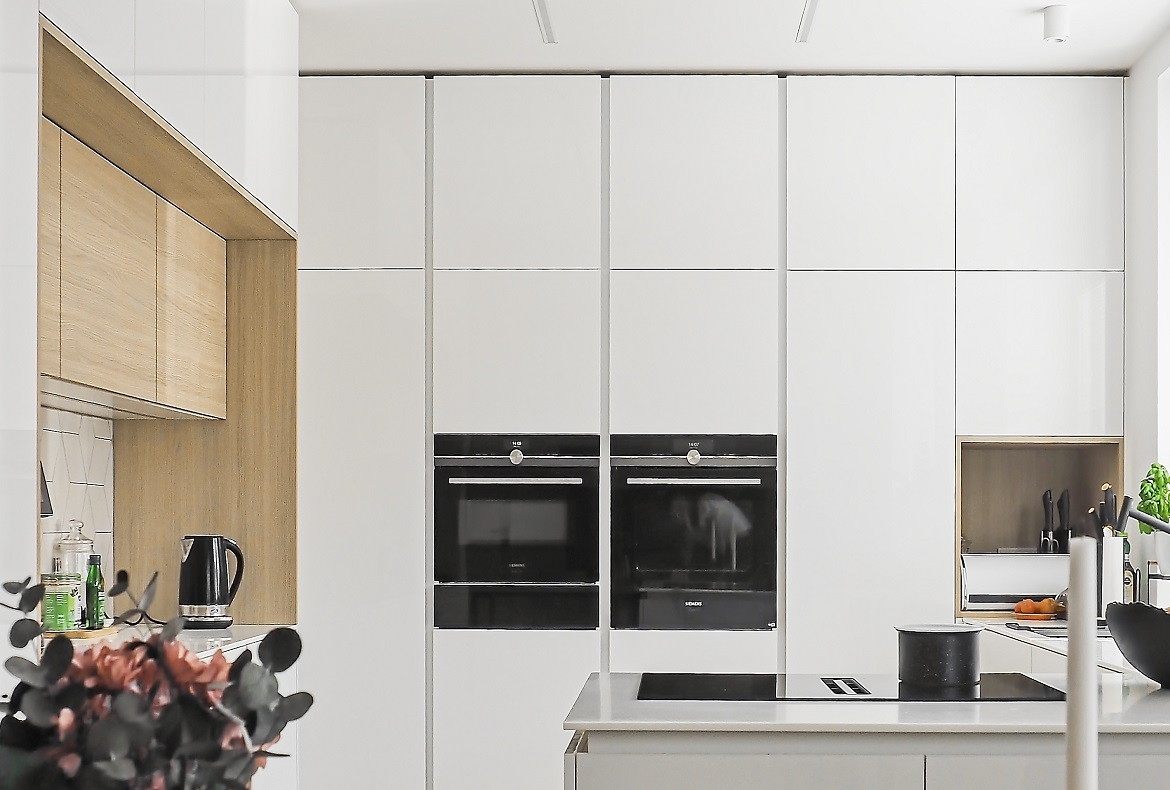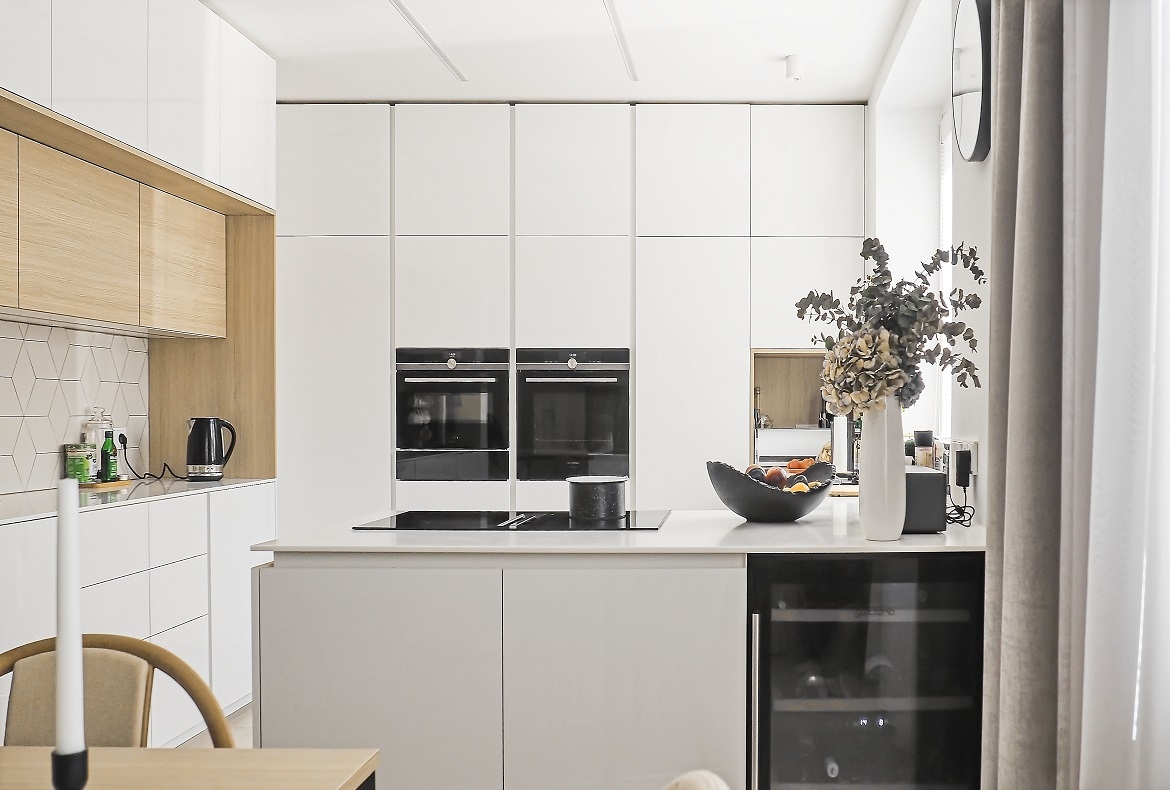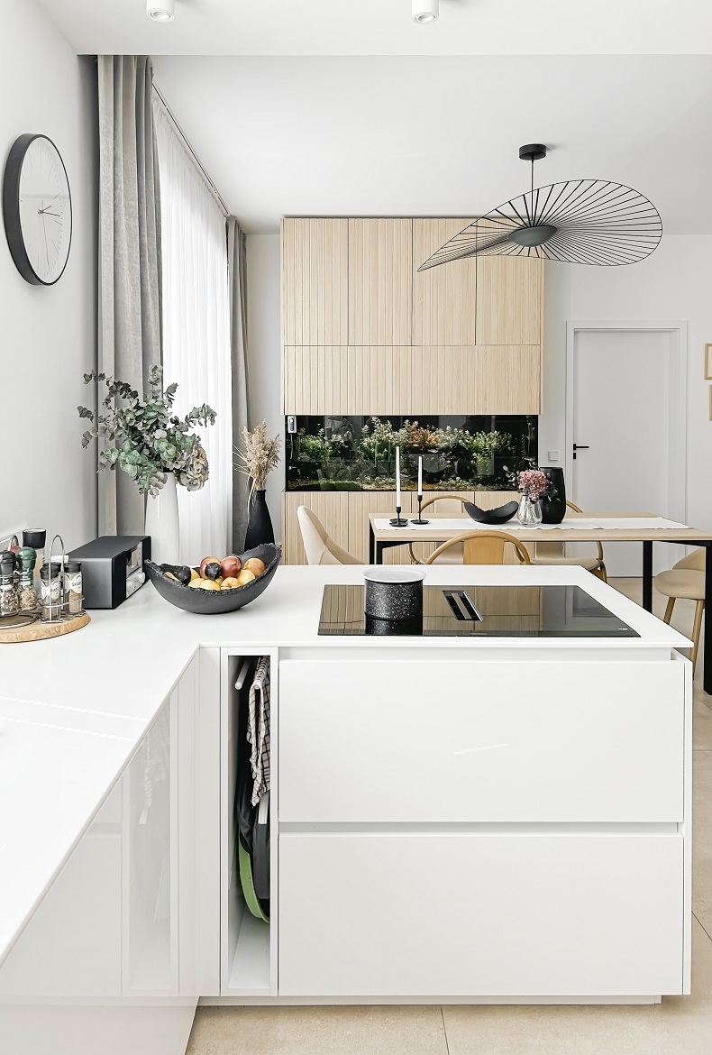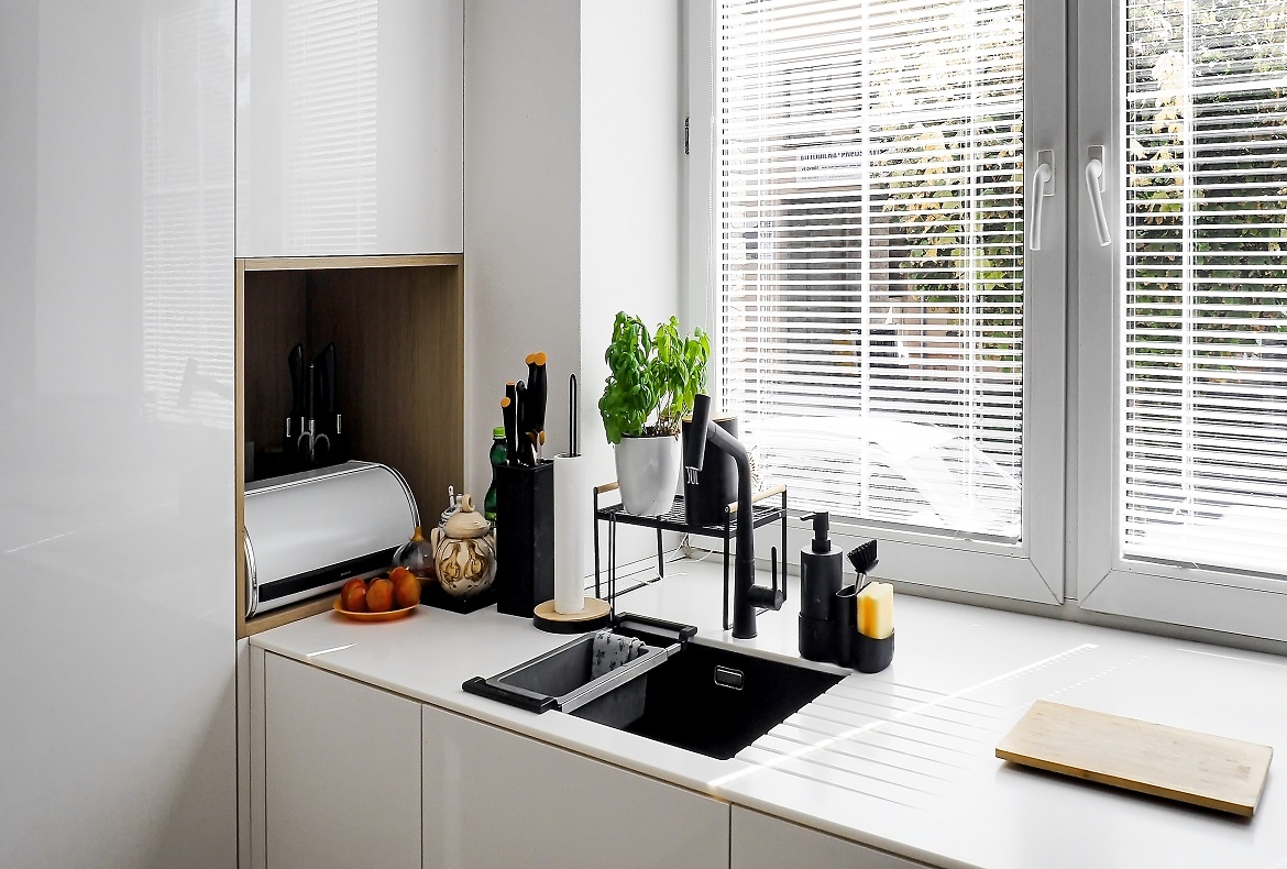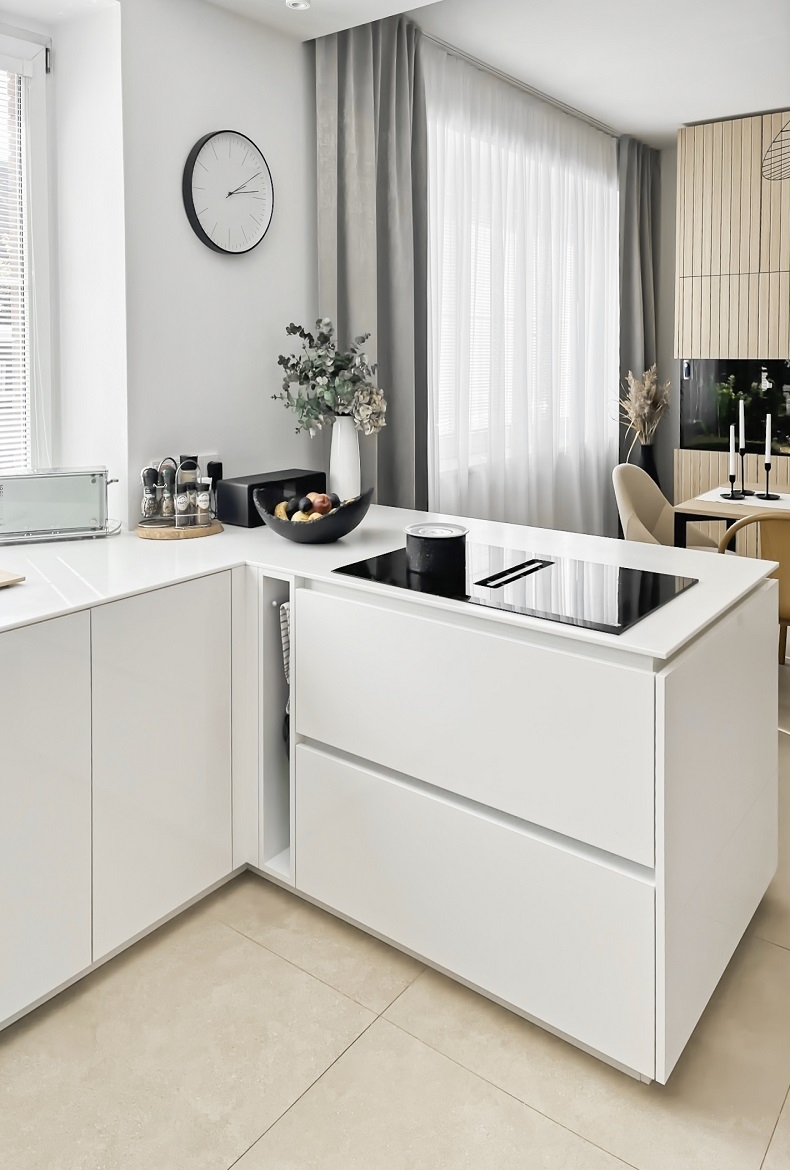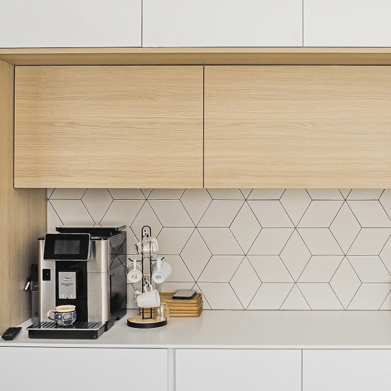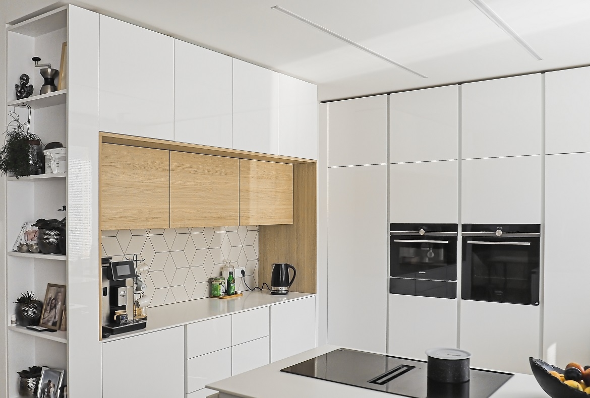 Kuchyně bílá s geometrickým obkladem.