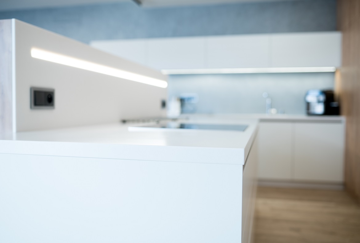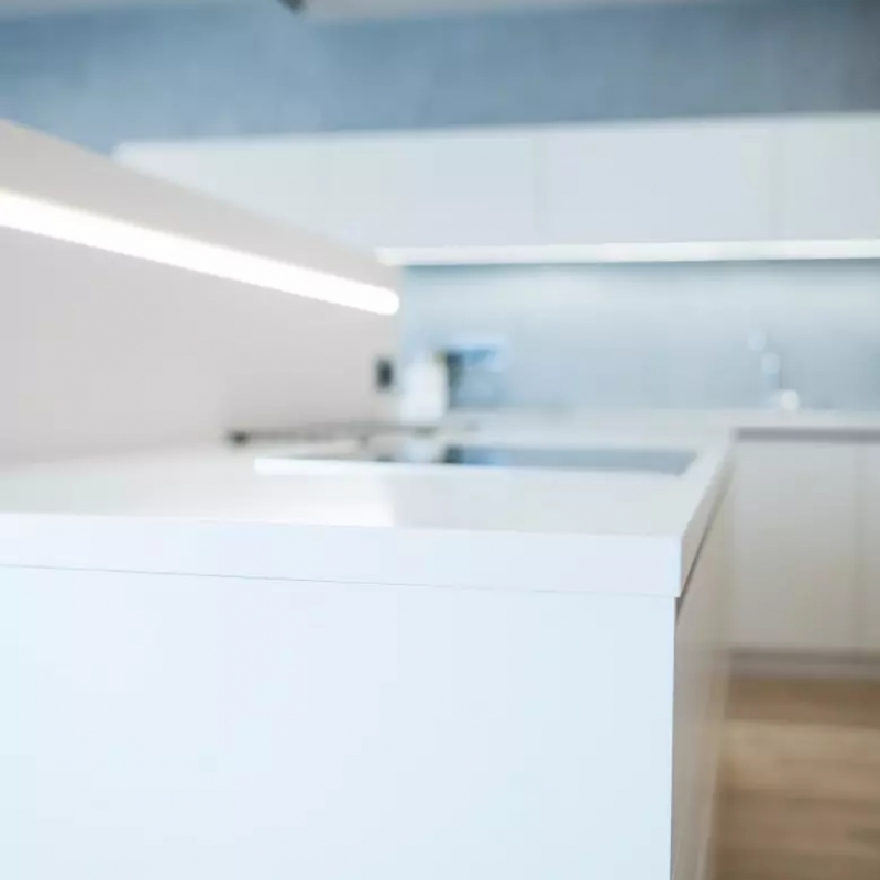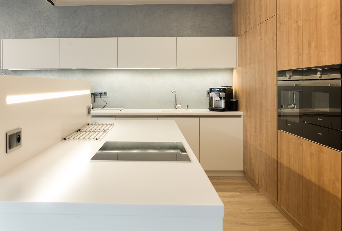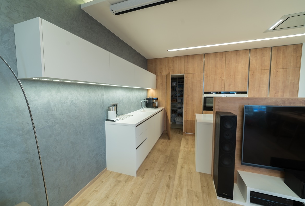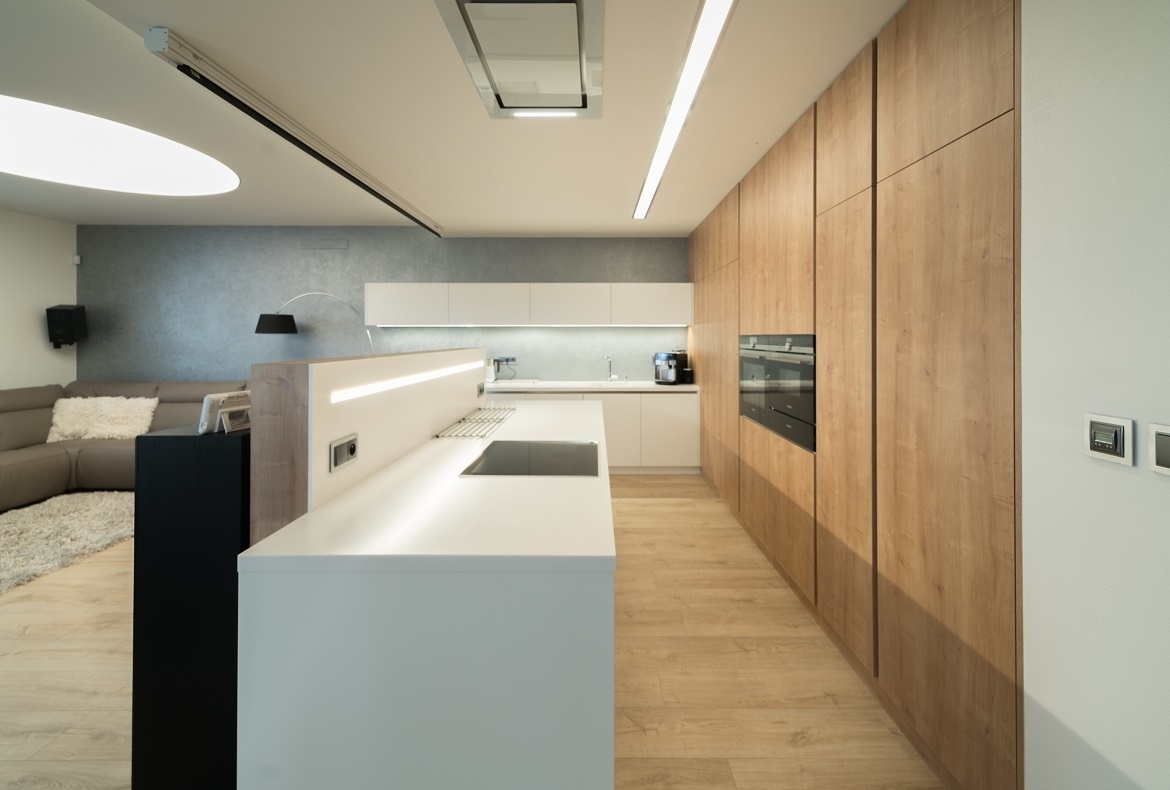 Kuchyně s ostrůvkem a podhledem se vstupem do spíže, pracovní deskou z umělého kamene a skvělým řešením osvětlení ostrůvku.