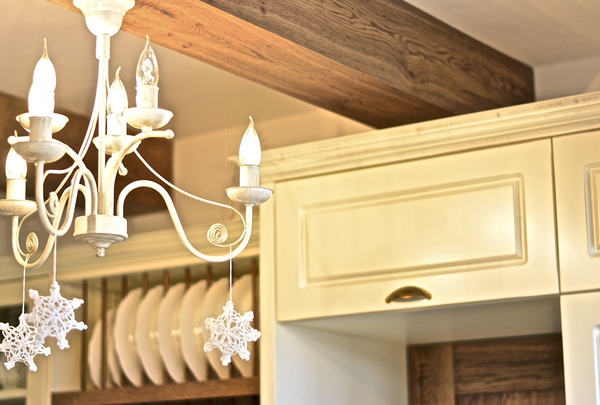 Kuchyně s patinou ve Vintage stylu, kterou jsme realizovali včetně trámů, obložek a dveří do spíže.