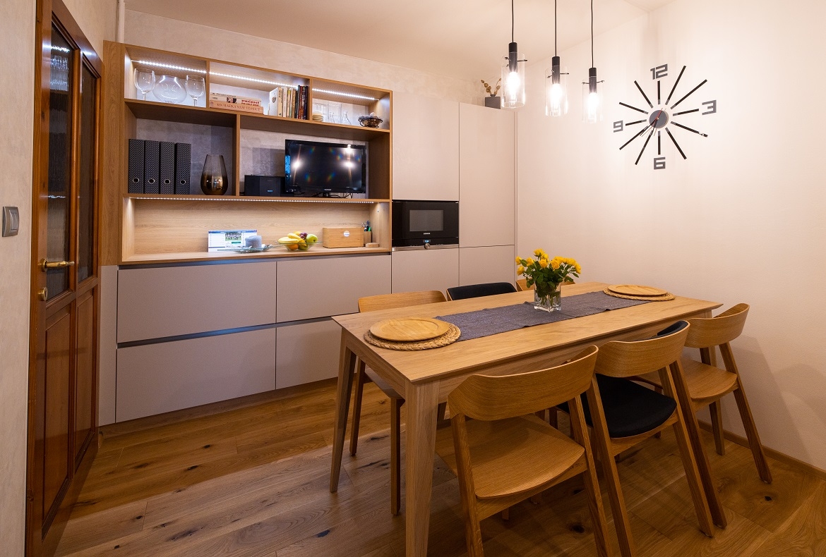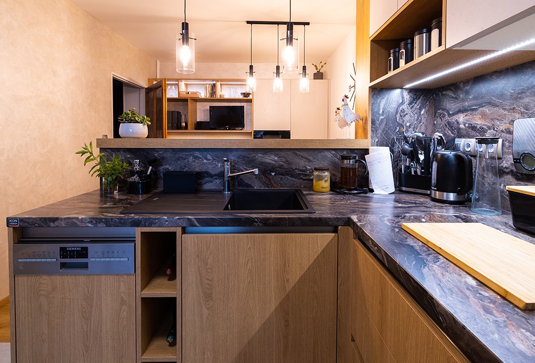 Praktická kuchyň s dominantní pracovní deskou a zástěnou.