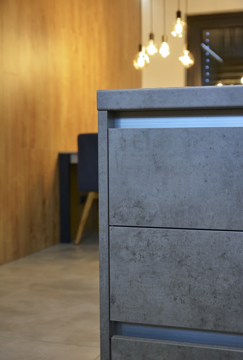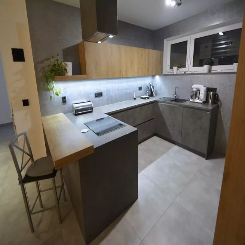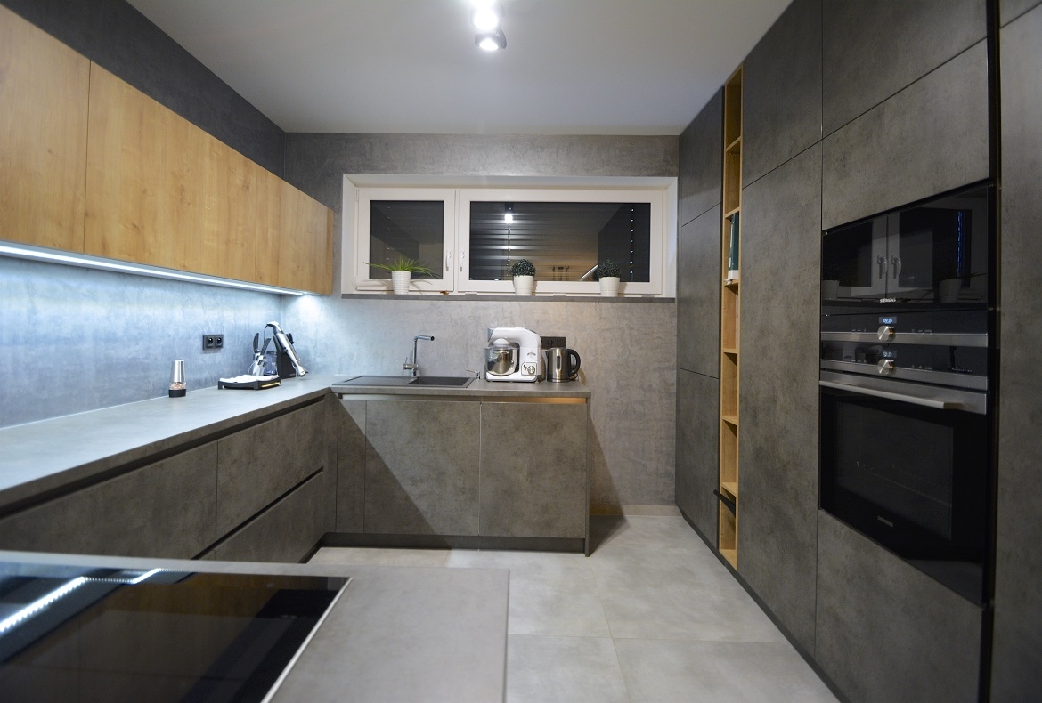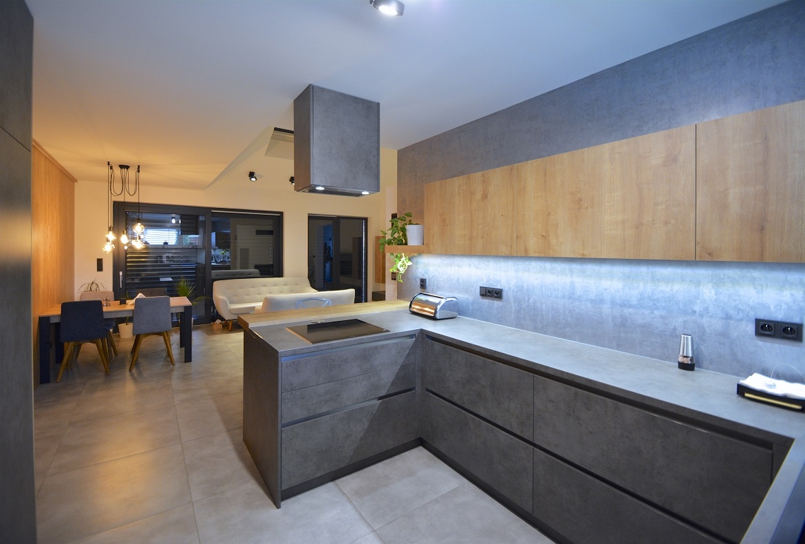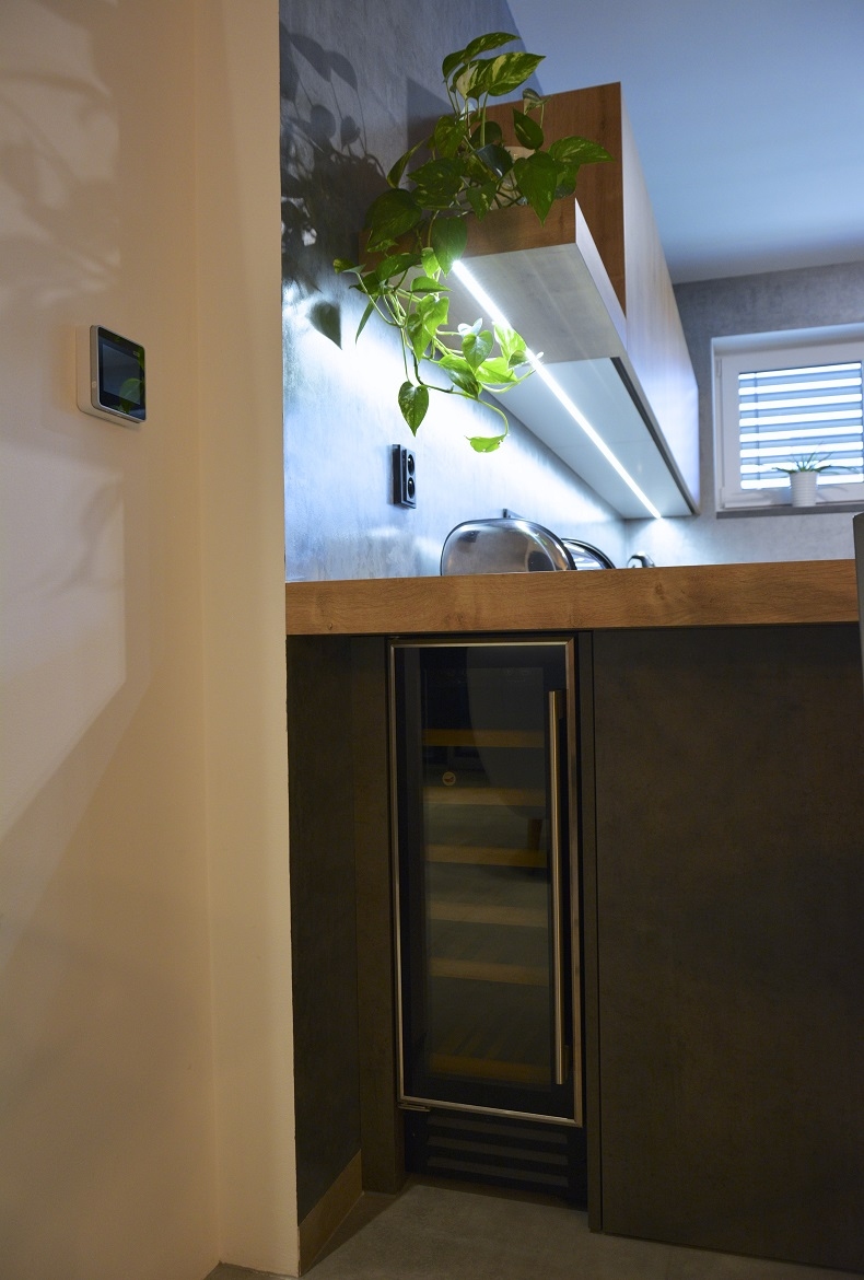 Kuchyně v dekoru betonu s barovým pultem a vinotékou.
