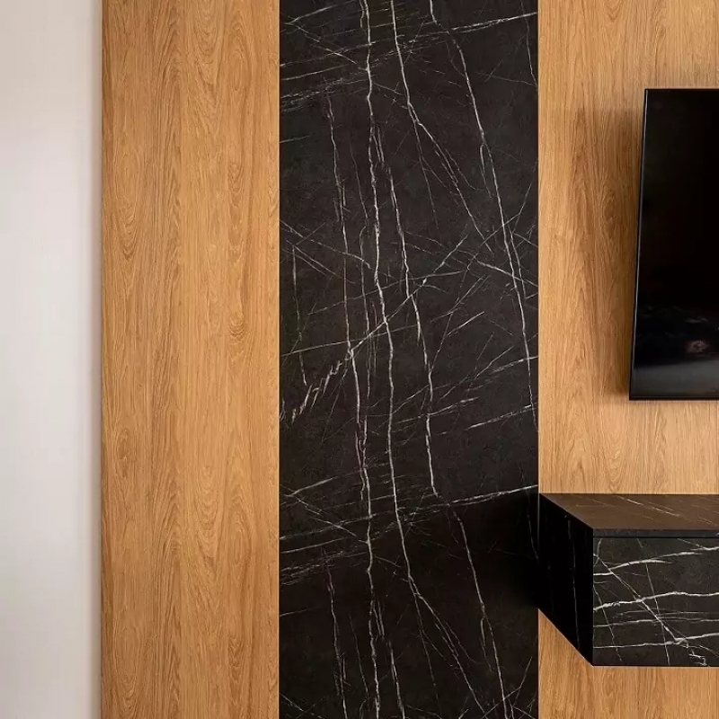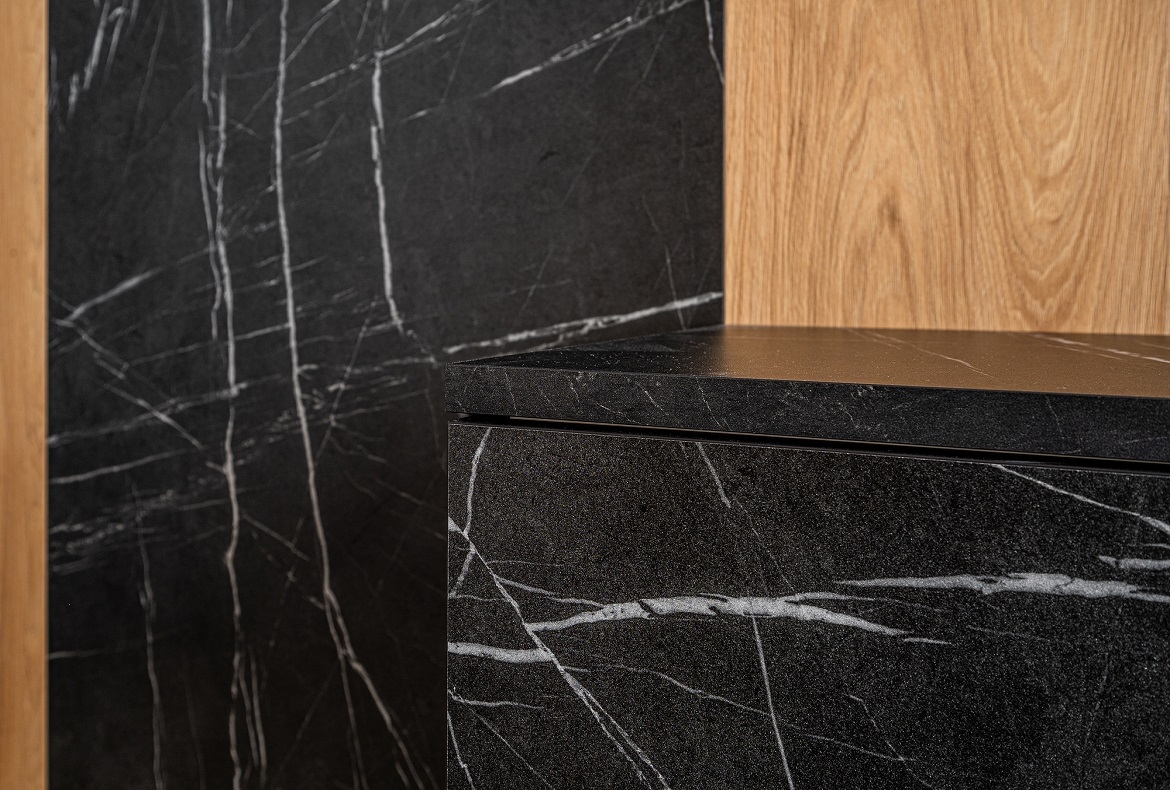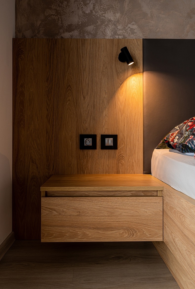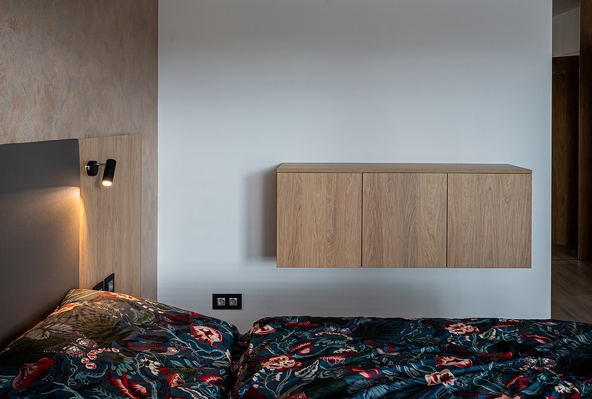 Ložnice s obložením v imitací mramoru a přírodním dubu do kterého jsme zakomponovali TV, komodu a velké zrcadlo.