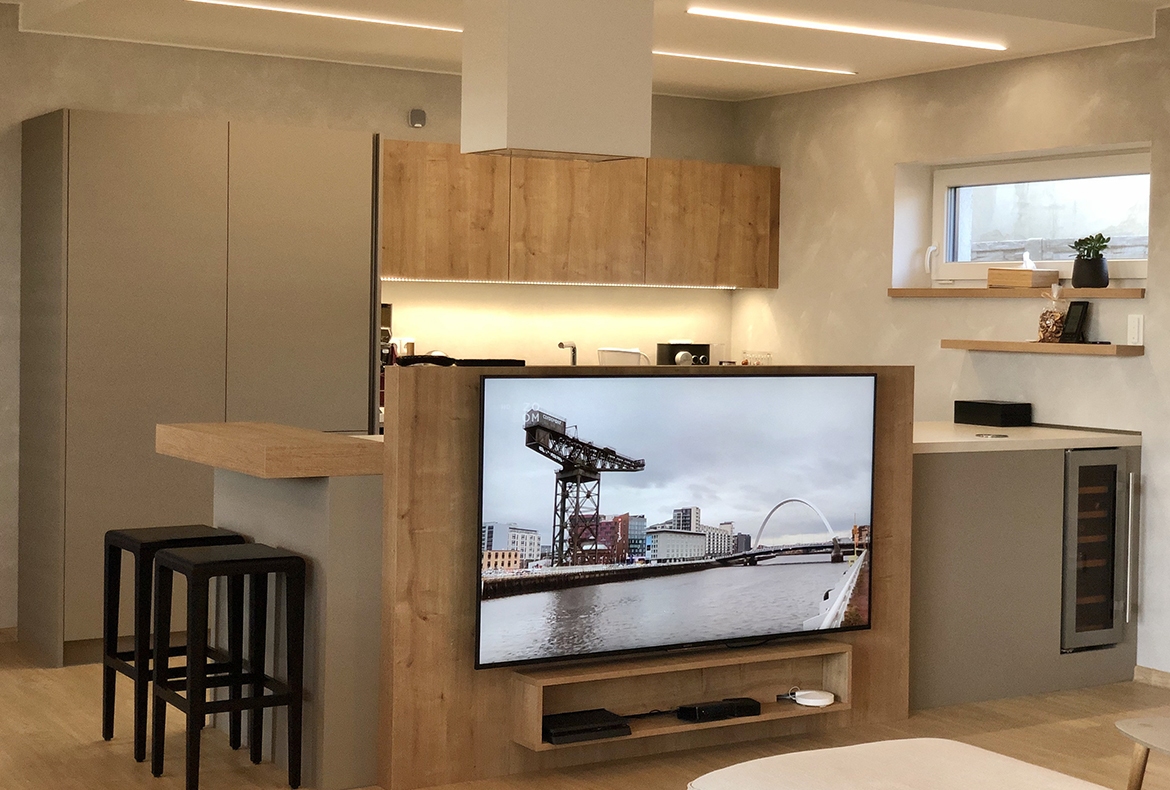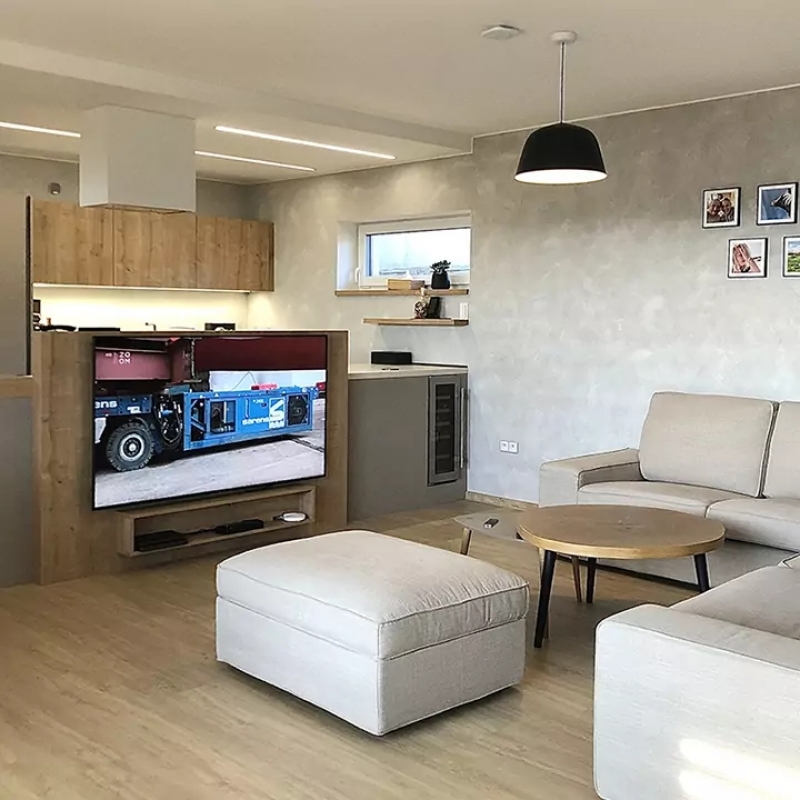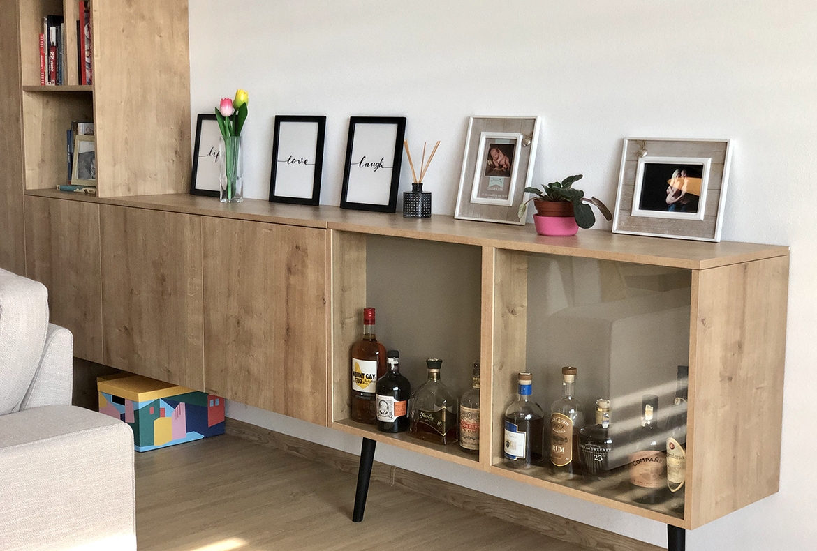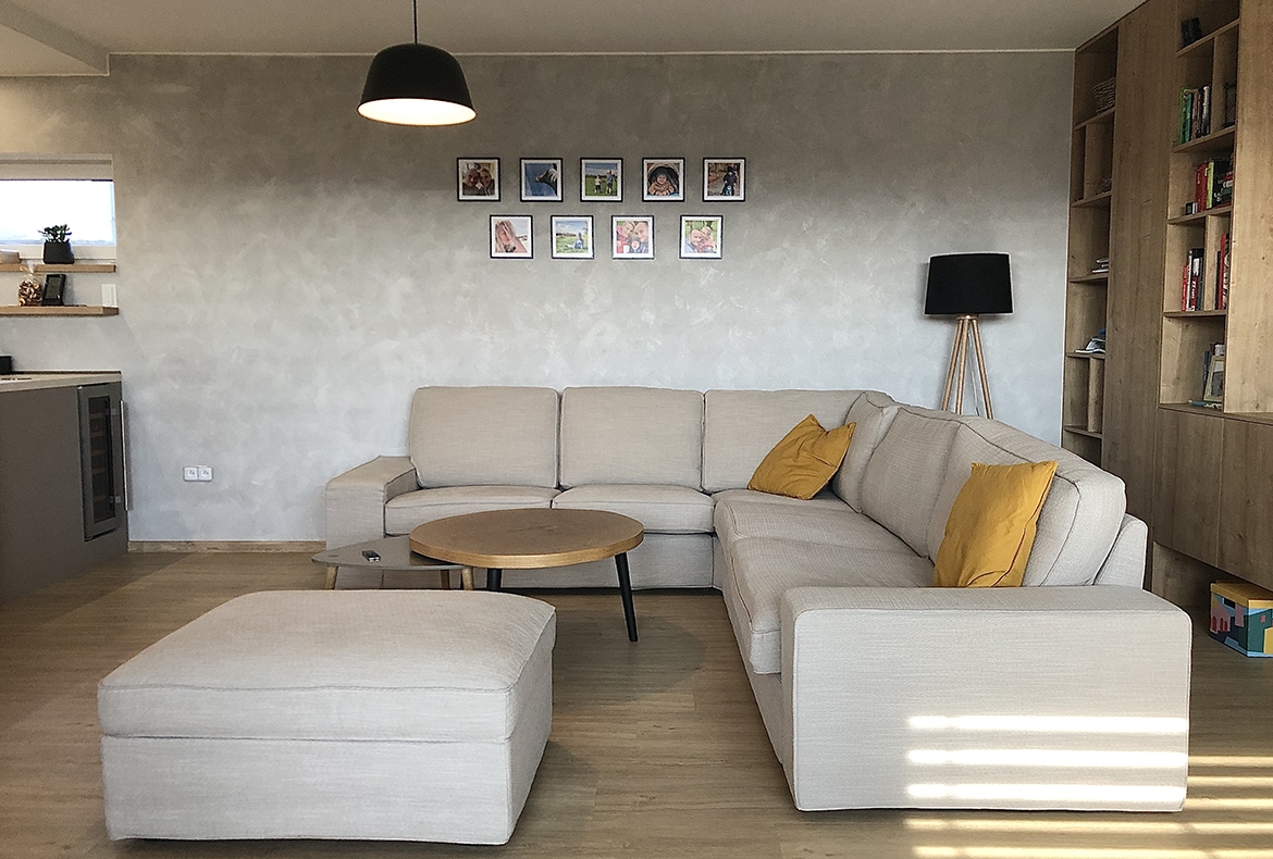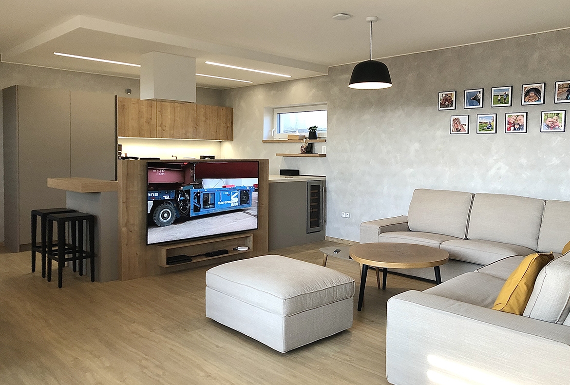 Obývací pokoj s knihovnou a barem