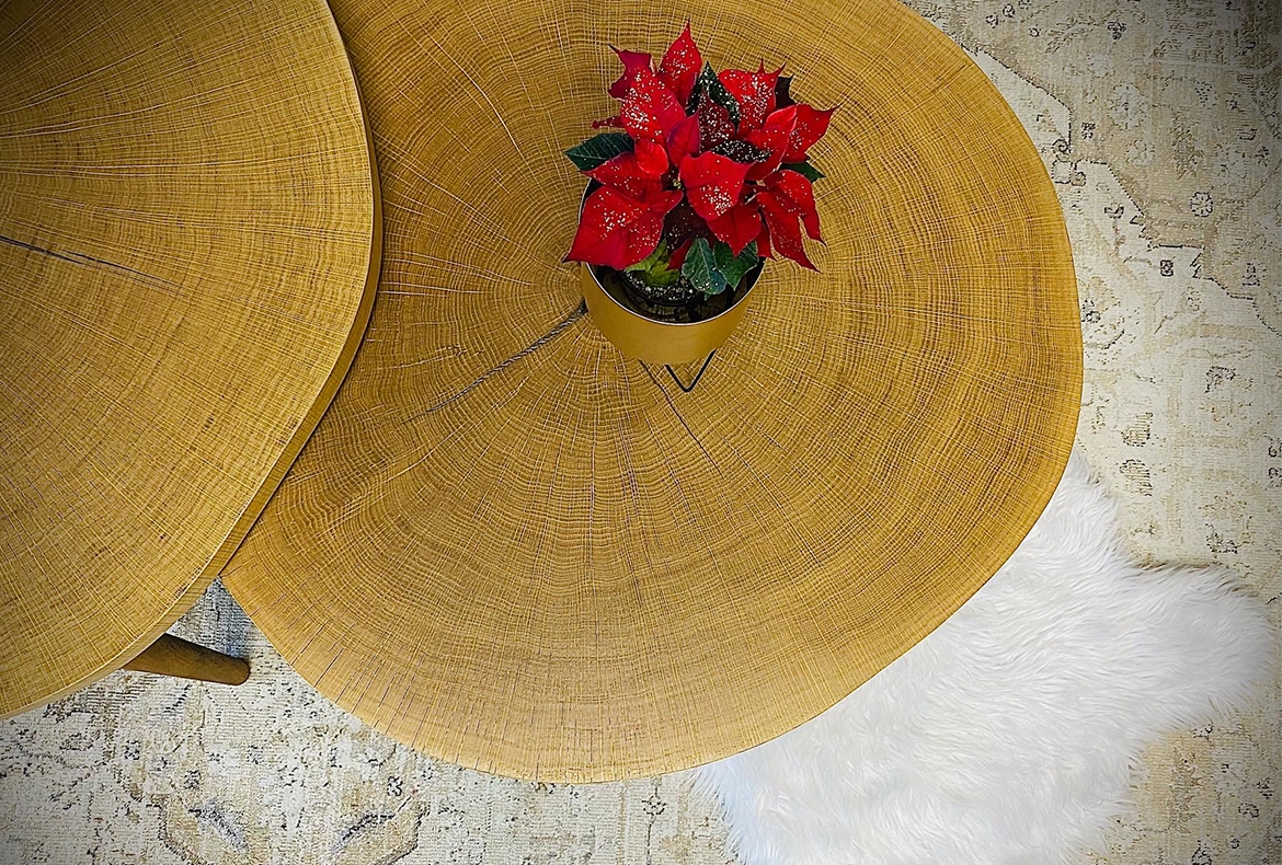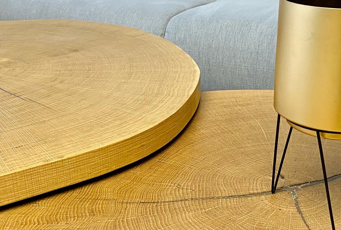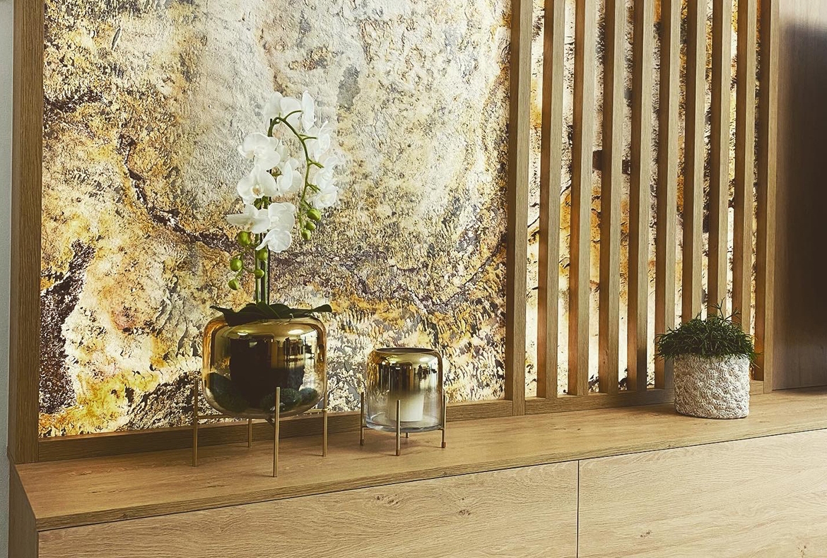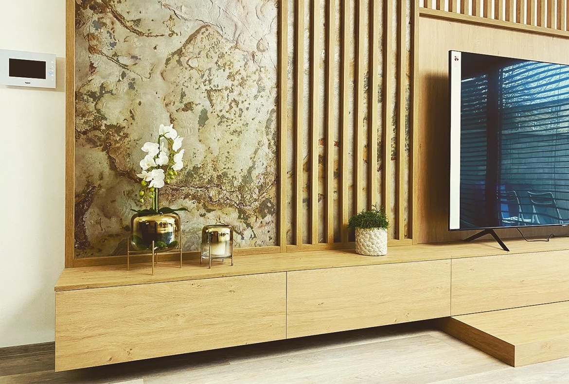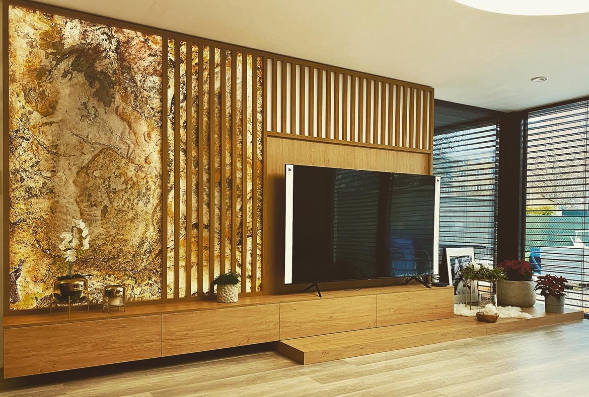 Velký obývací pokoj v přírodním dubu, rastrem a kamennou dýhou. Součástí je také prostor pro květiny, nebo vánoční stromeček.