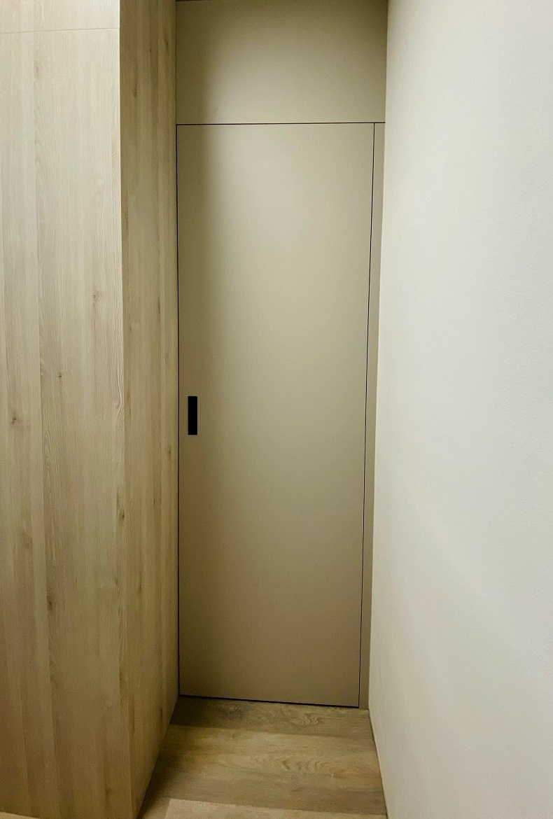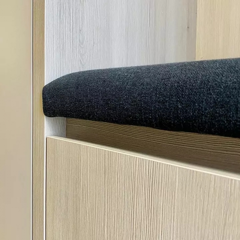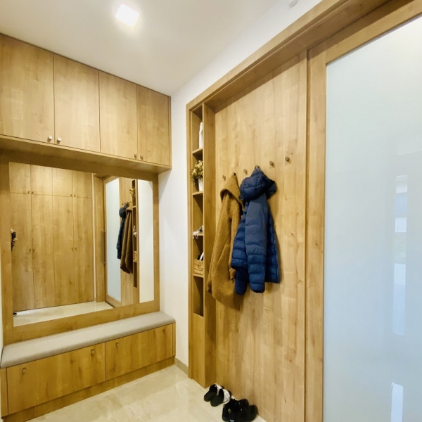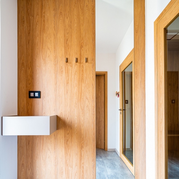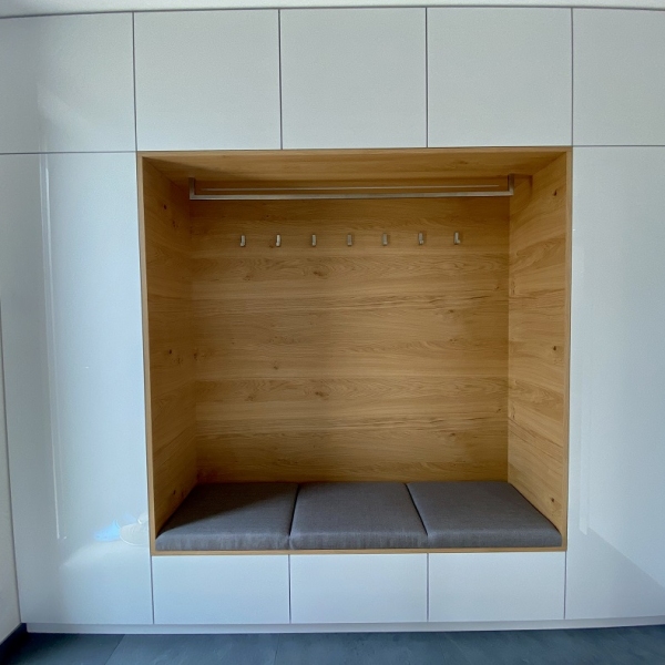 Jednoduchá předsíň v bílém lesku a dubové dýze. Součástí skříně jsou velké zrcadla.