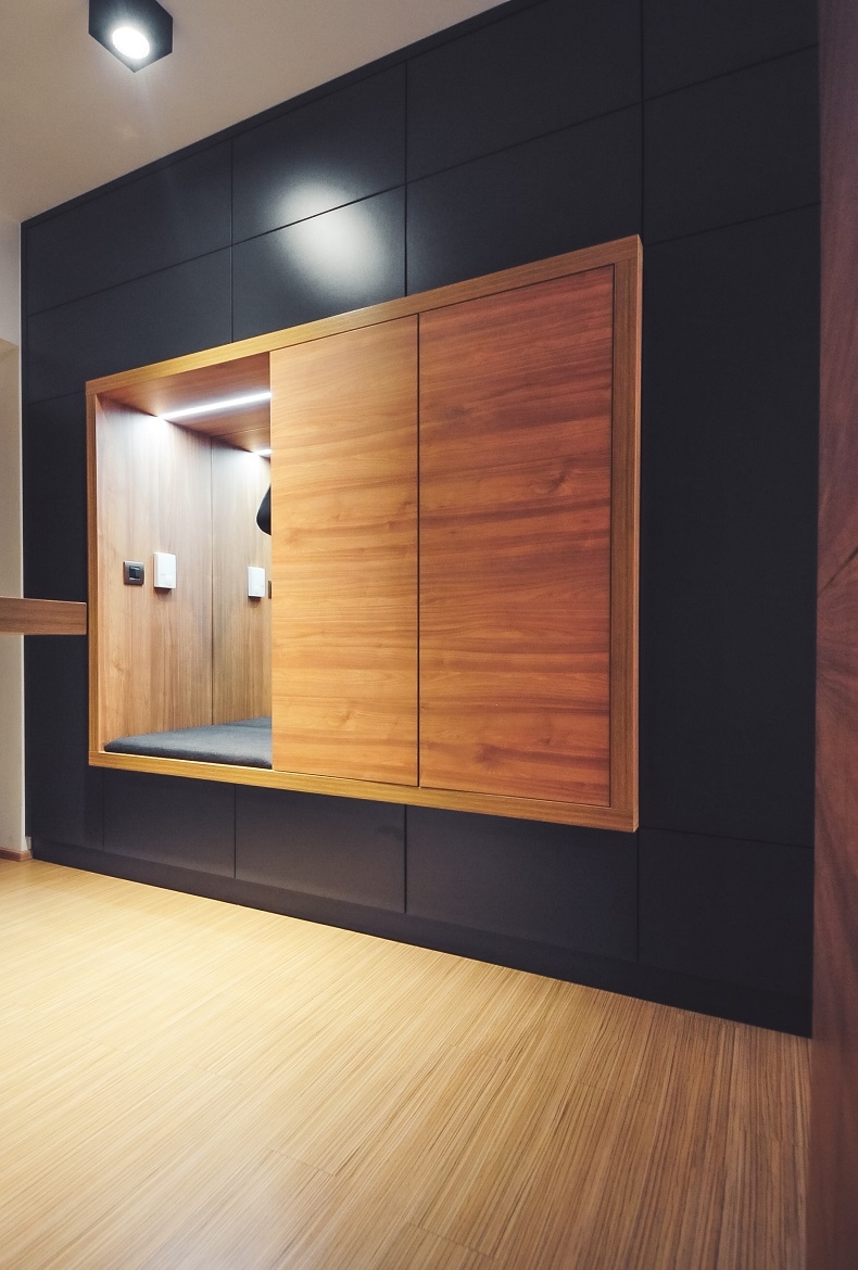 Vestavná skříň s velkým úložným prostorem a místem k sezení vytváří jednotný a elegantní vzhled.