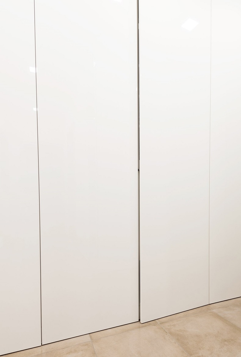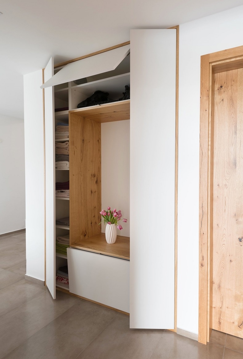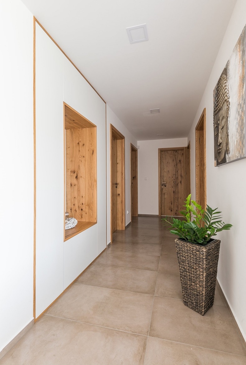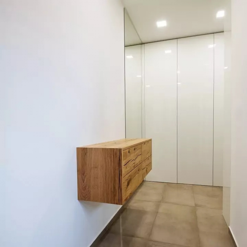 Jednoduchá předsíň s vestavěnými skříněmi a komodou ozvláštněná praskaným dubem.
