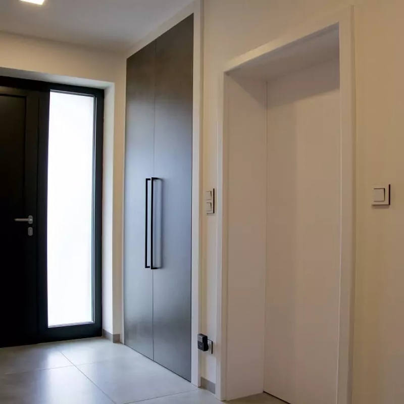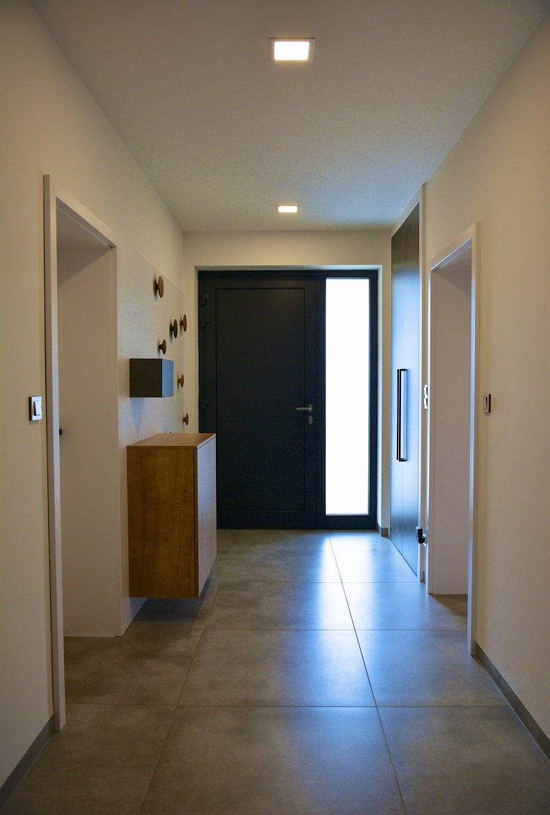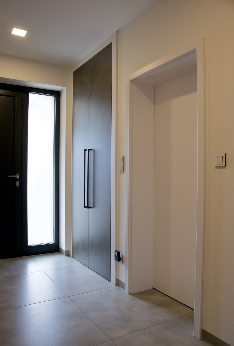 Vzdušná předsíň s vestavnou skříní, komodou a designovými kulatými věšáky.
