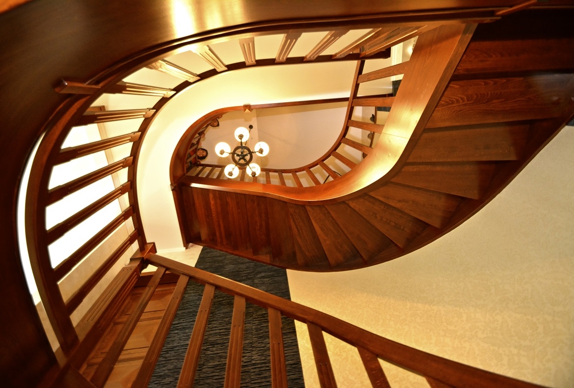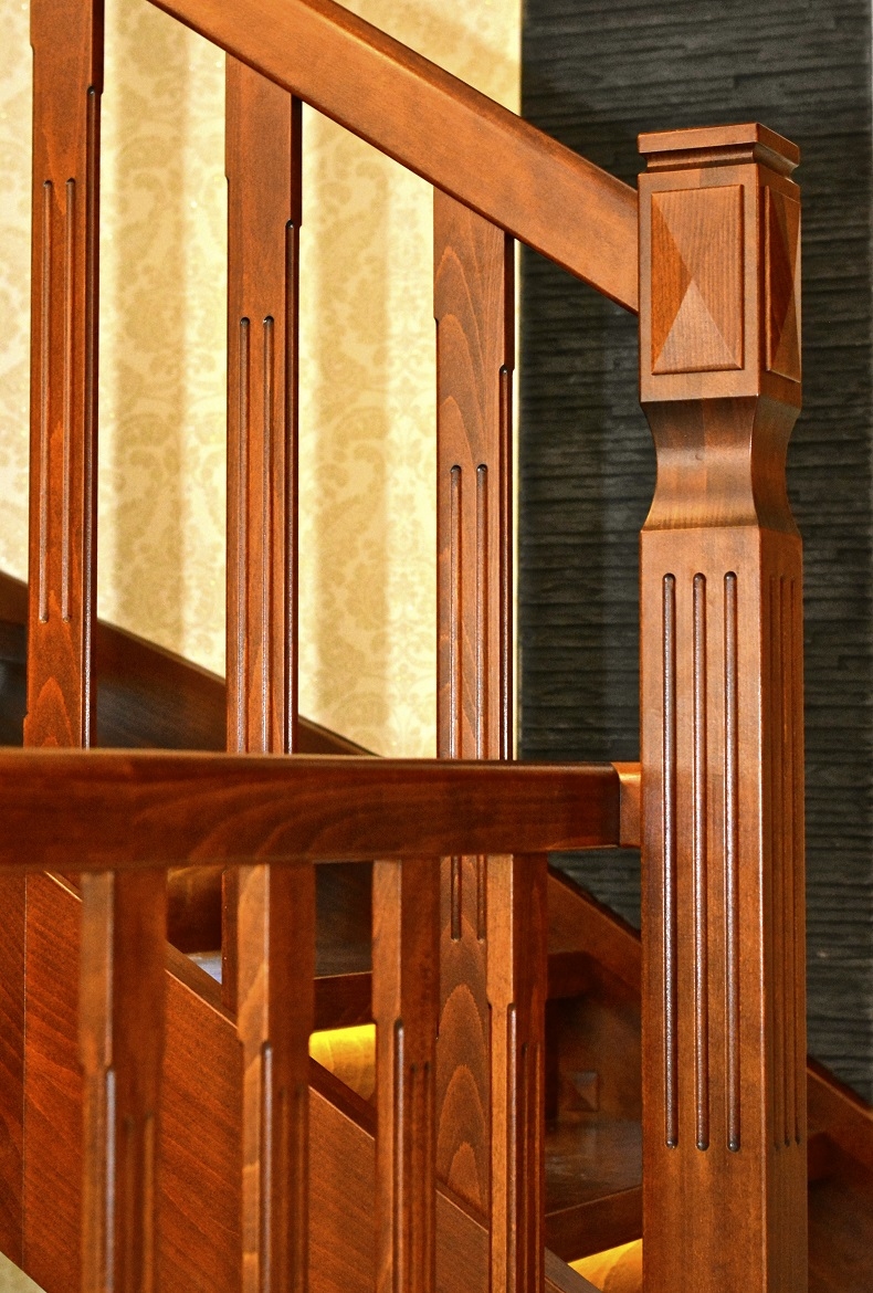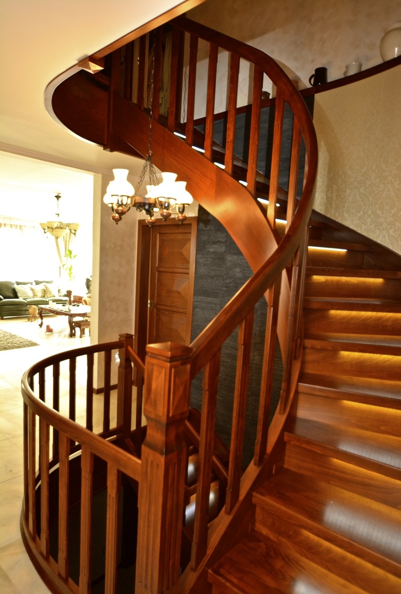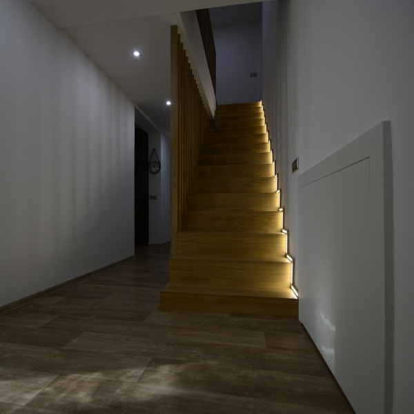 Samonosné schodiště byla výzva - je vyrobeno z kvalitního masivního bukového dřeva, dýhy a truhlářské překližky. Povrchovou úpravu tvoří moření a lakování odolným podlahovým lakem s protiskluzným atestem. Každý nášlap je osvětlen led páskem a celé schodiště je napojeno na stmívající čidlo, které automaticky řídí osvětlení schodiště.