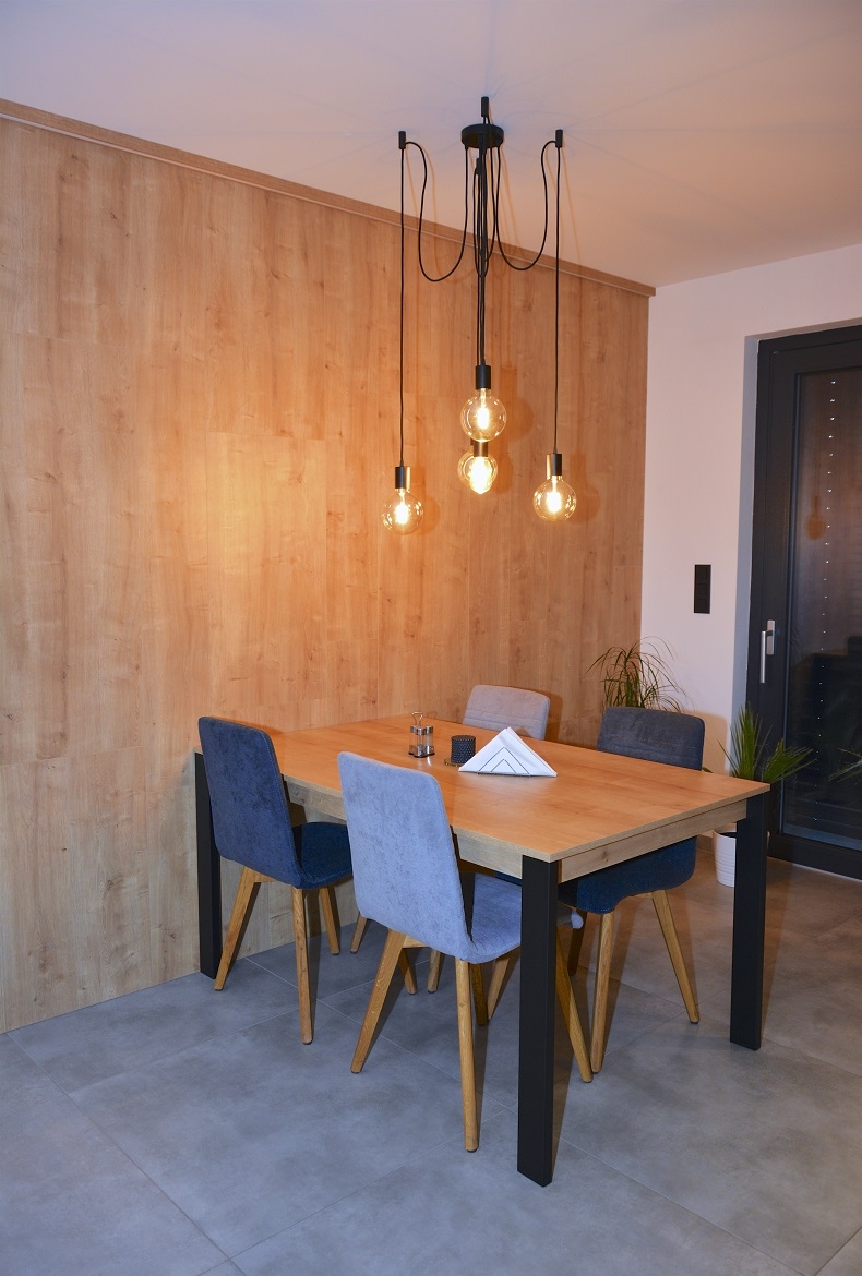 Jídelní část s obložením stěny a rozkládacím jídelním stolem na míru až pro 10 osob.