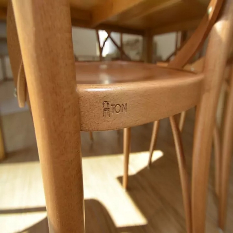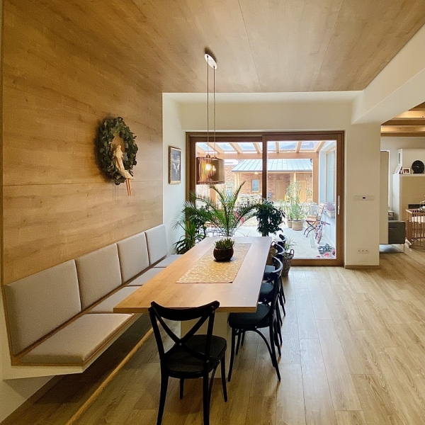 Jídelna s TV sestavou v masivním dubu s bílým matným lakem vytváří útulný, domácí interiér. Jídelní židle od firmy TON 150.