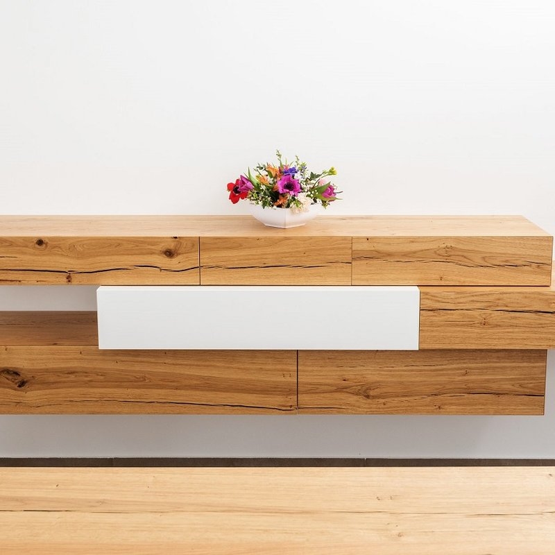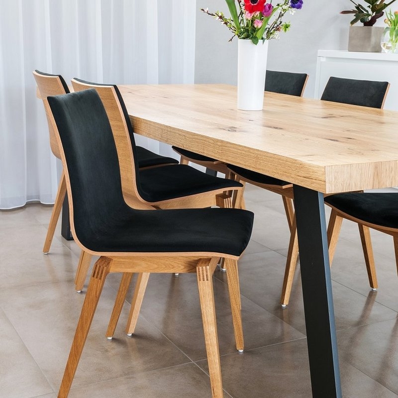 Jednoduchá nadčasová jídelna s naším jídelním stolem v praskaném dubu a designovou komodou. Doplněná o židle TON Stockholm.