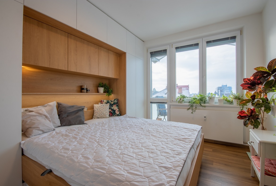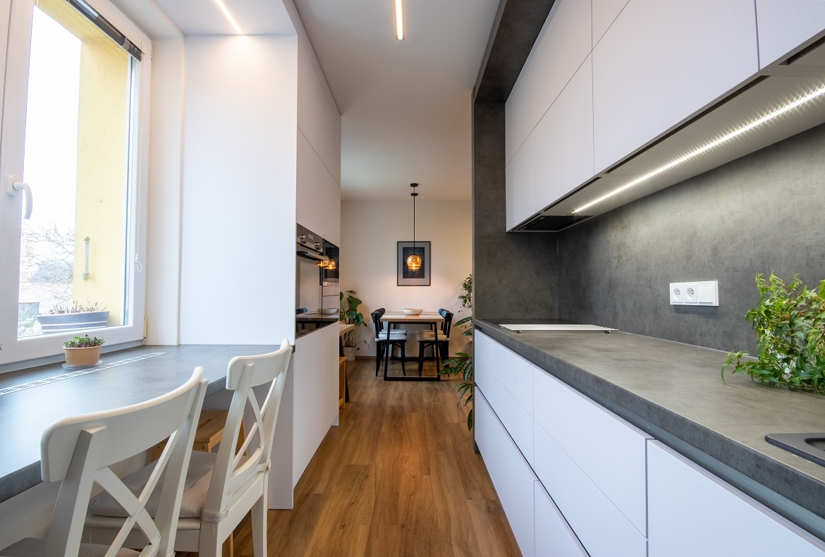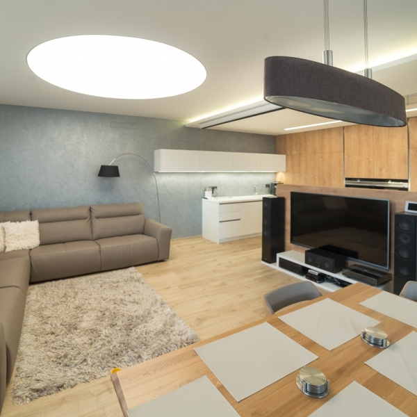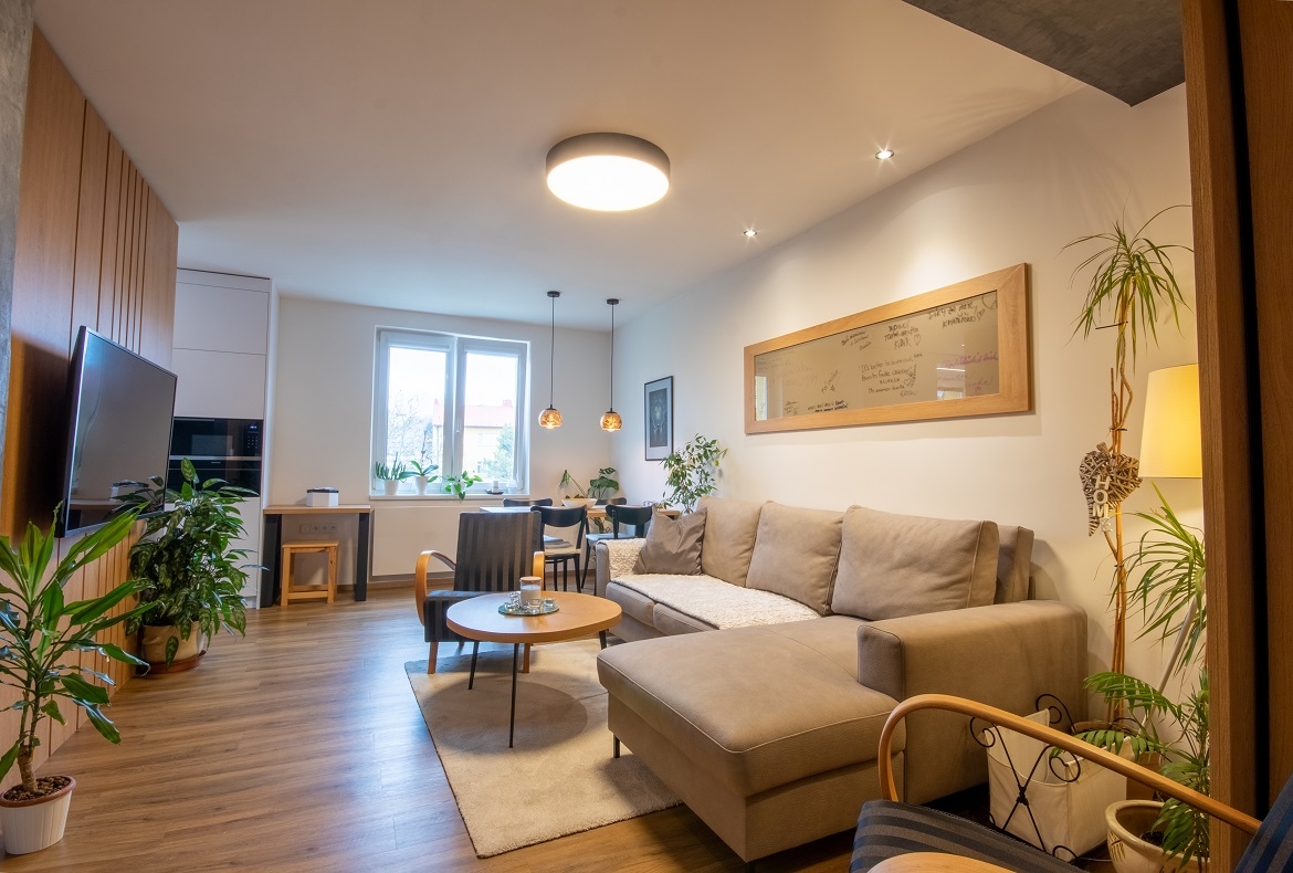 Kompletní útulný interiér bytu s retro kousky nábytku. Místo realizace: Kyjov