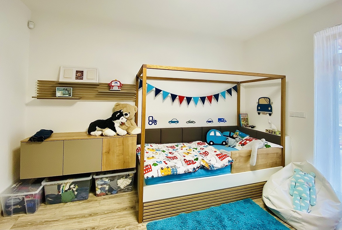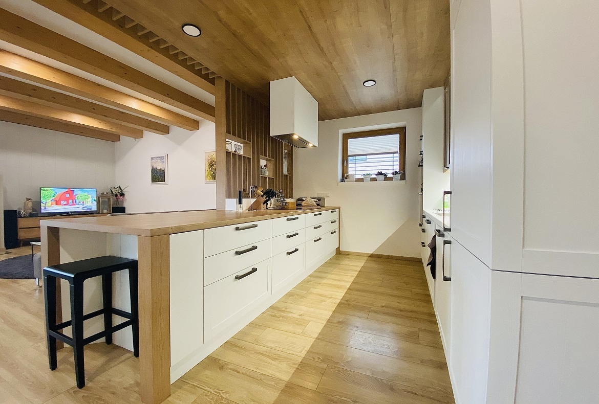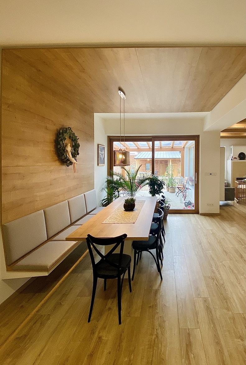 Kompletní interiér v útulném domácím stylu. Zajímavým prvkem je jídelna se zavěšenou lavicí a obložením stěny i stropu.