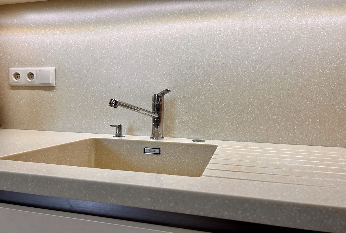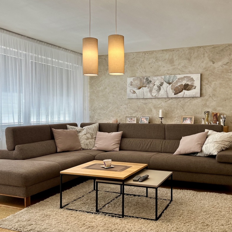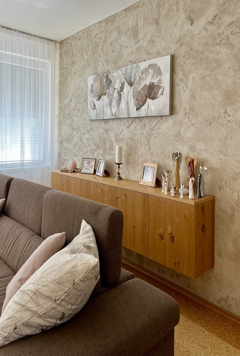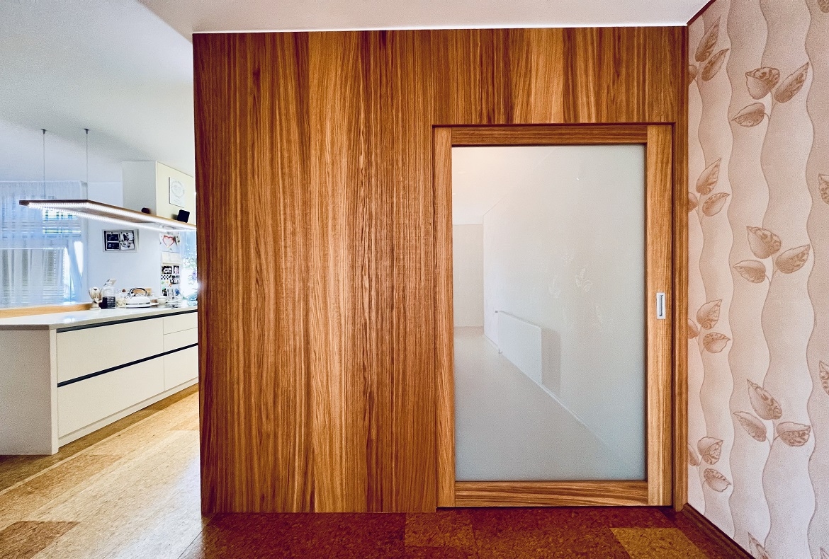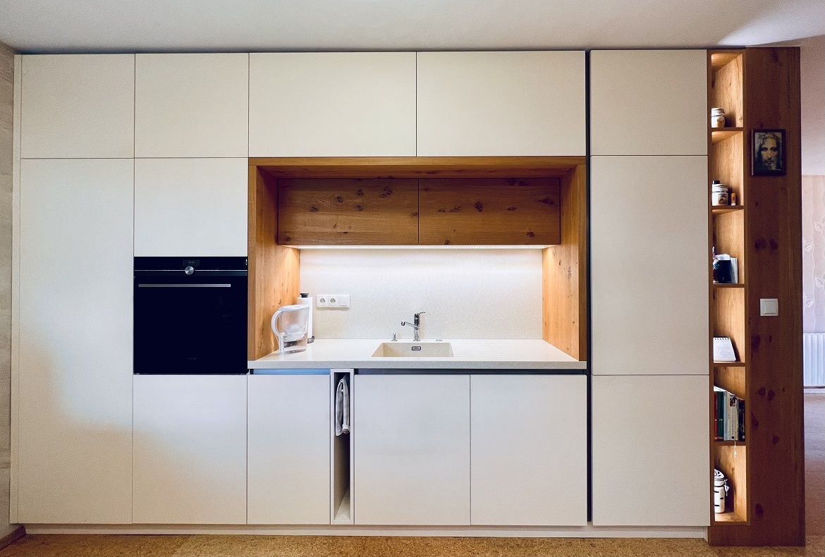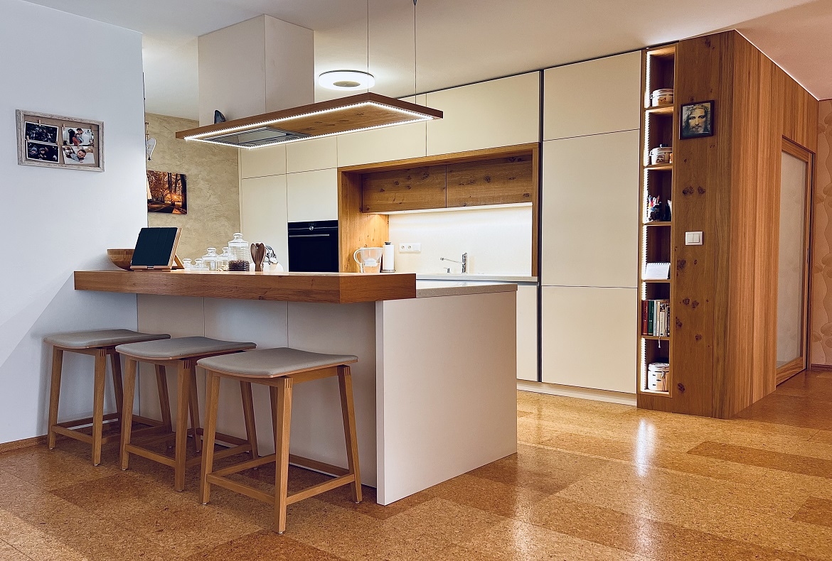 Interiér v přírodních tónech, kde plynule kuchyň navazuje na zádveří. V jídelně je dost prostoru na velký rozkládací stůl MAX.