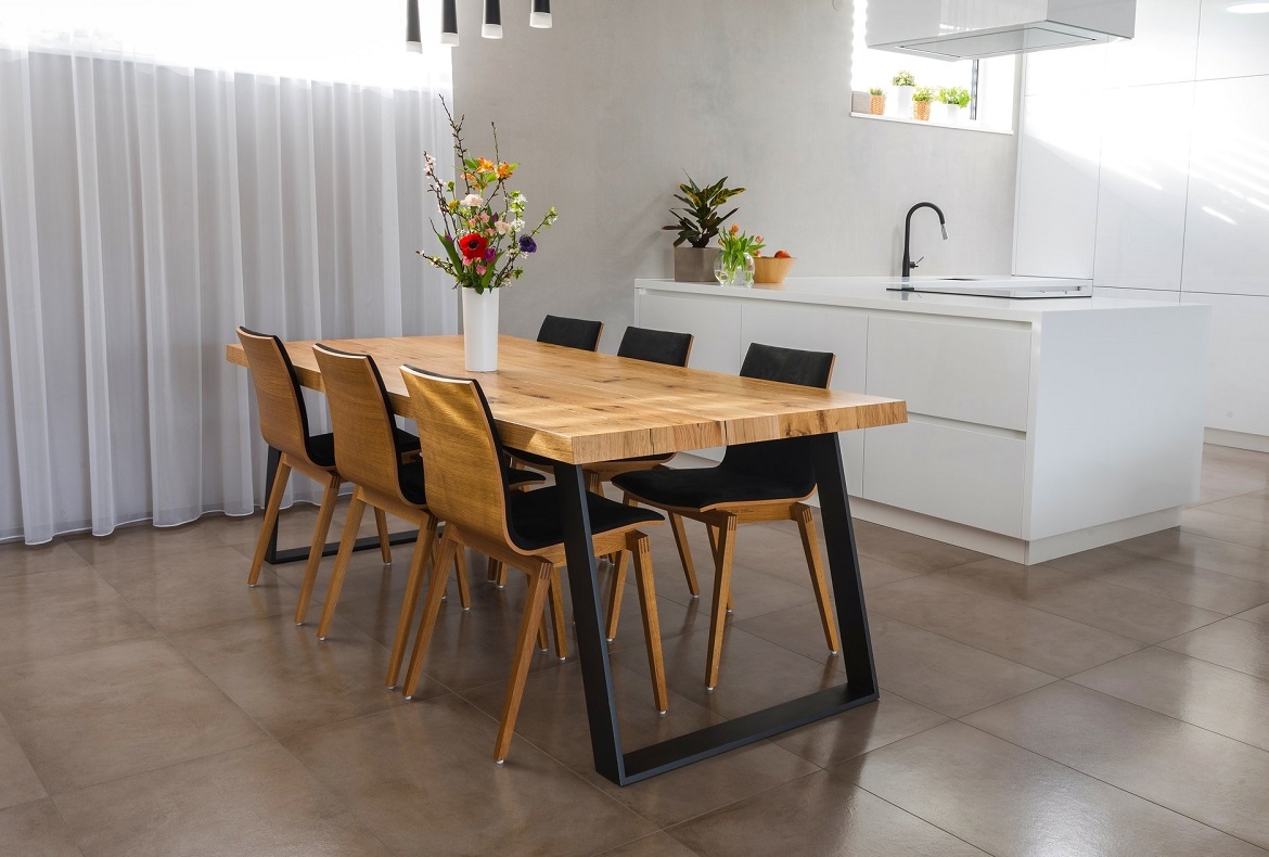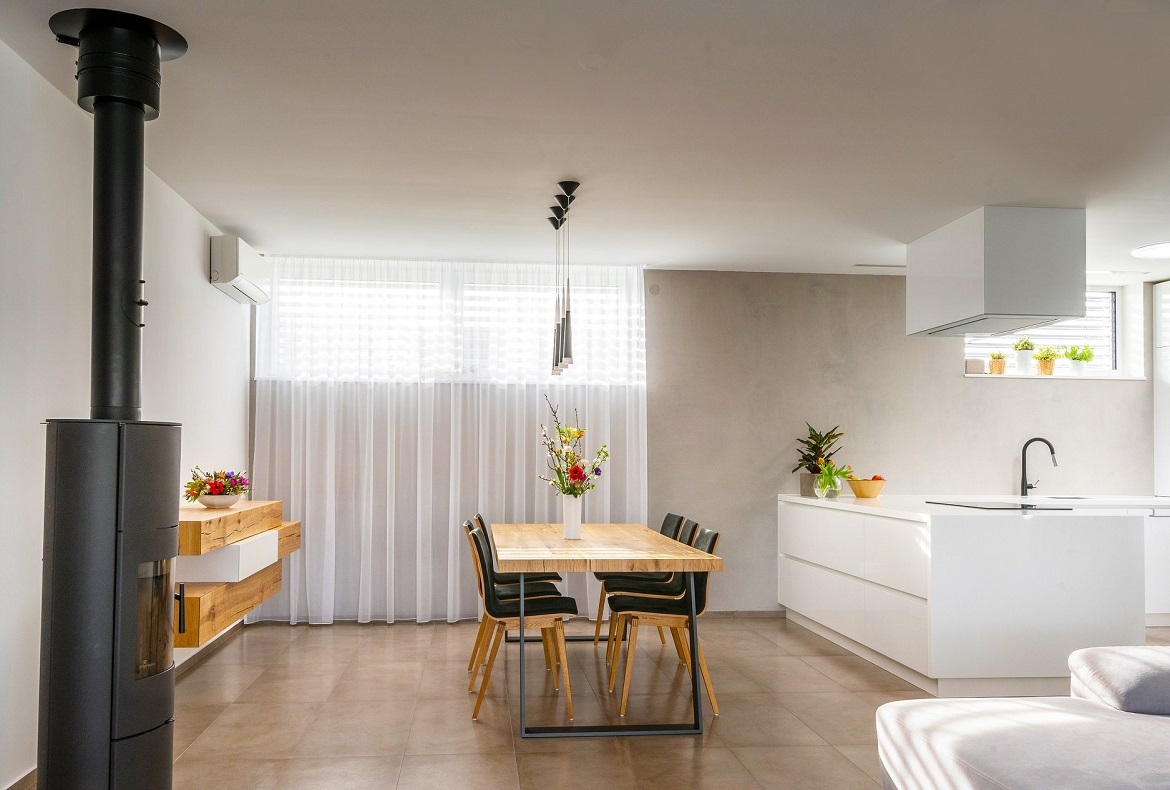 Originální nadčasový kompletní interiér, který nepodléhá trendům. Spojující originální prvek je použitá praskaná dubová dýha.