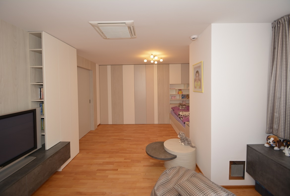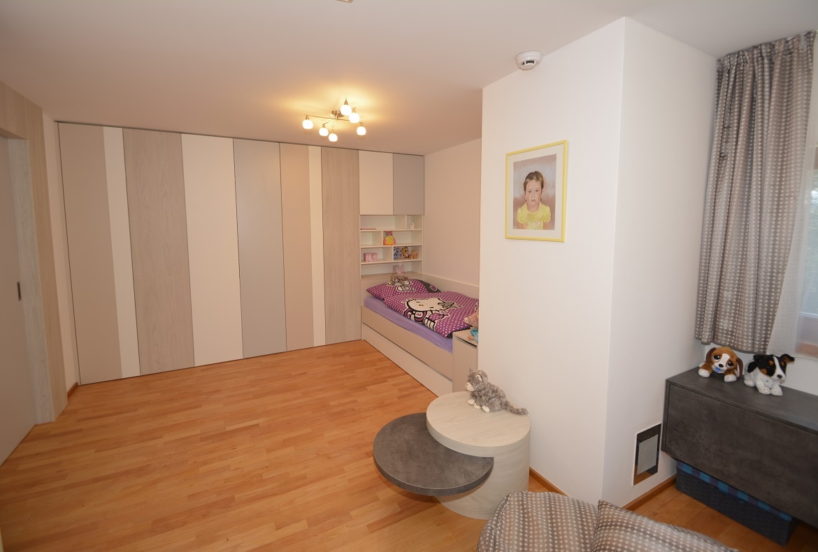 Dětský pokoj s velkým psacím stolem, který je napojený na jednoduchou komodu.