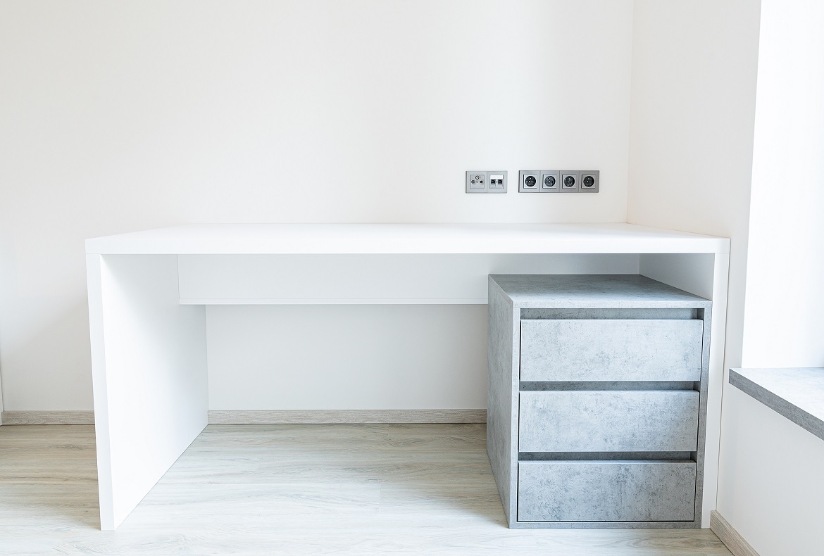 Světlý dětský pokoj s velkou vestavěnou skříní a středovou policí v betonu.