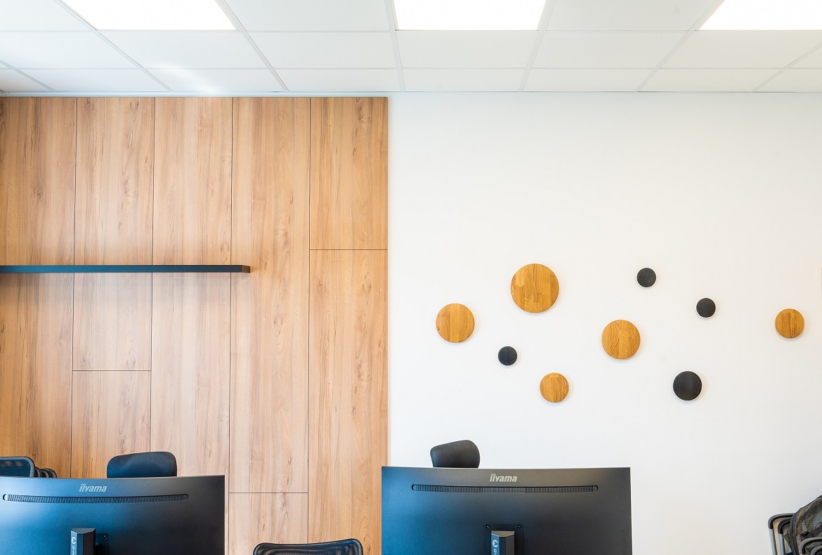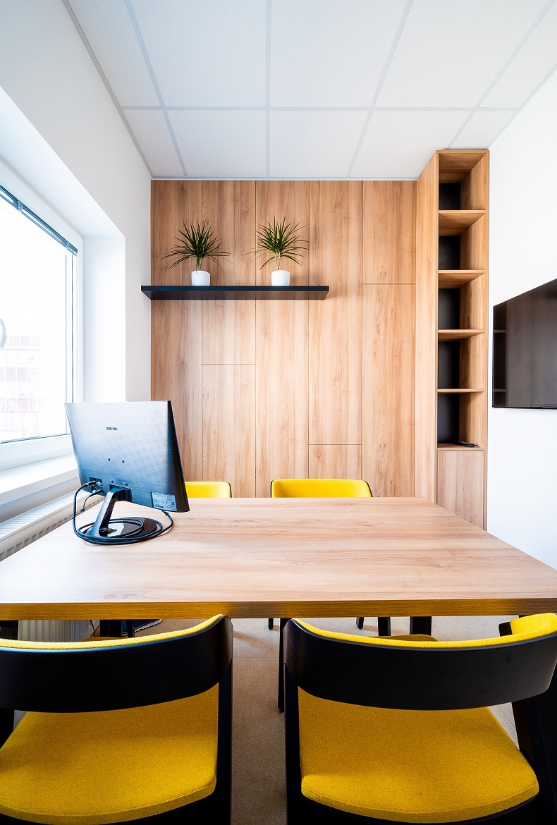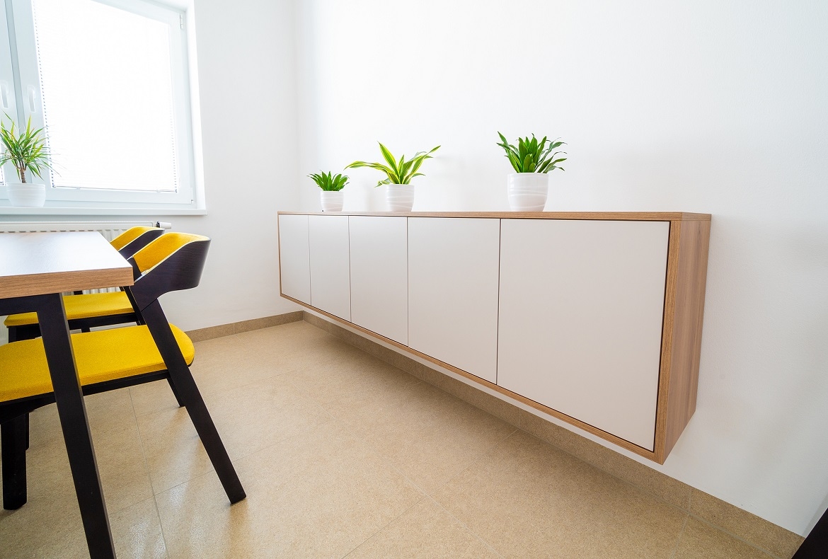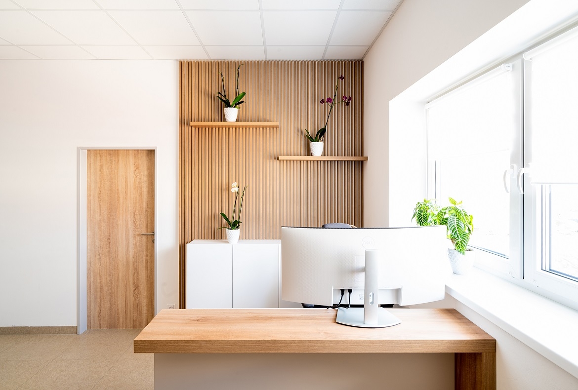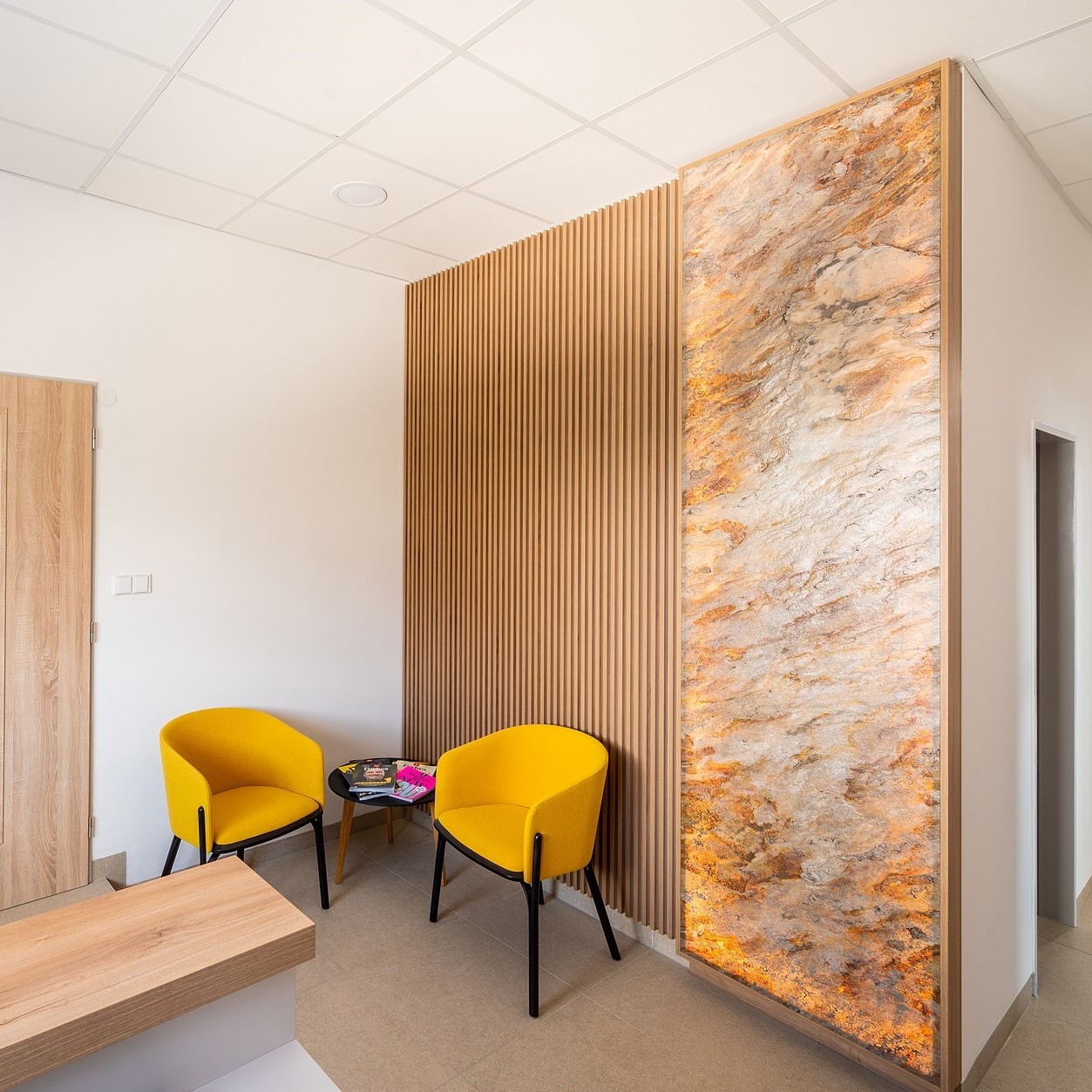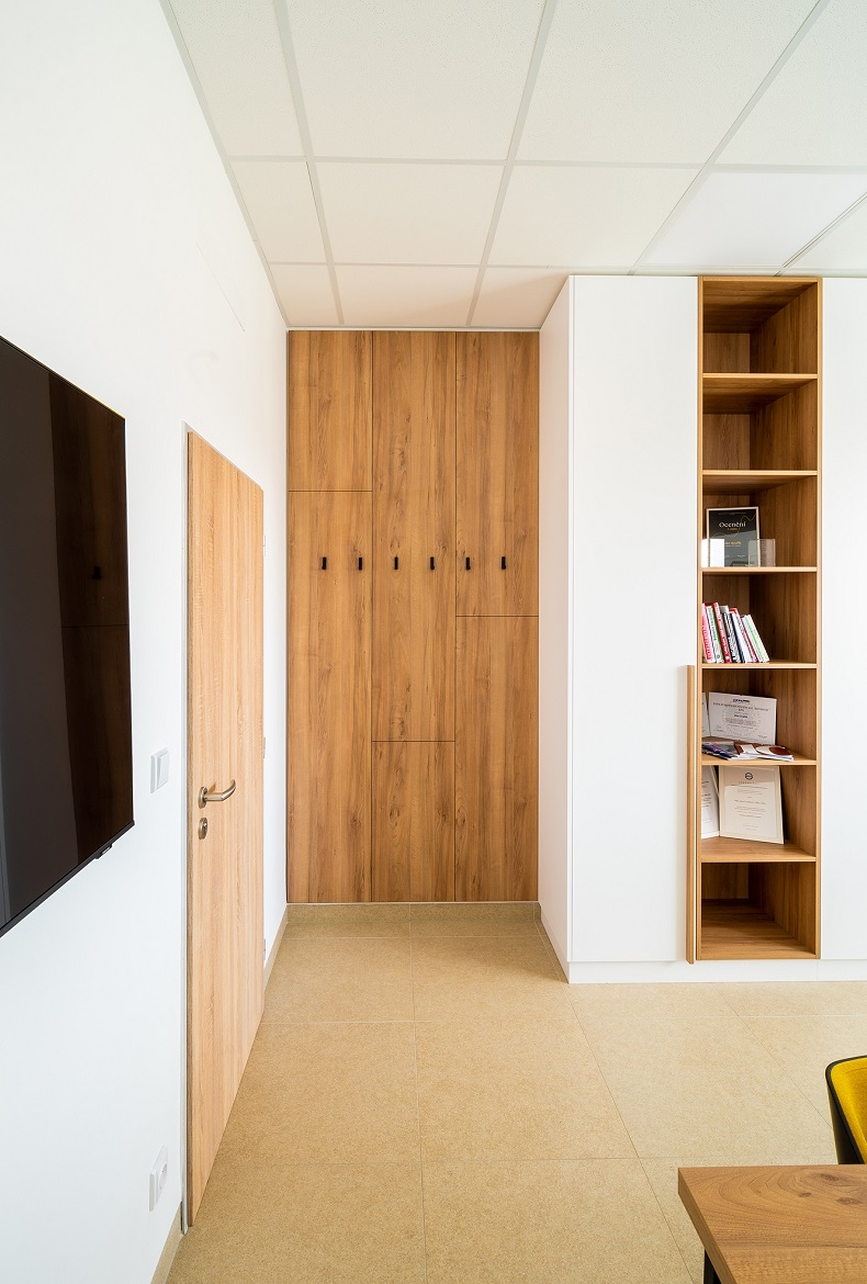 Moderní prostory, kde jsou kombinované nové prvky kamenná dýha, rastry a výraznější dekor ořechu.