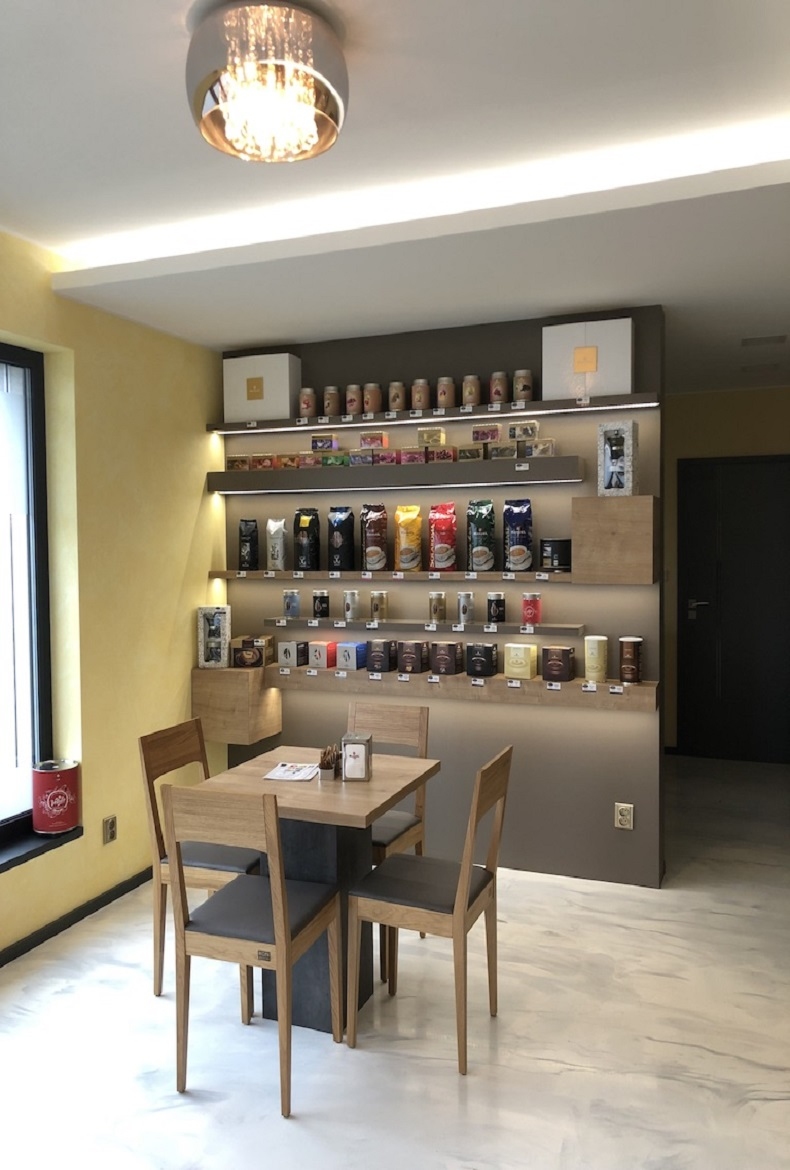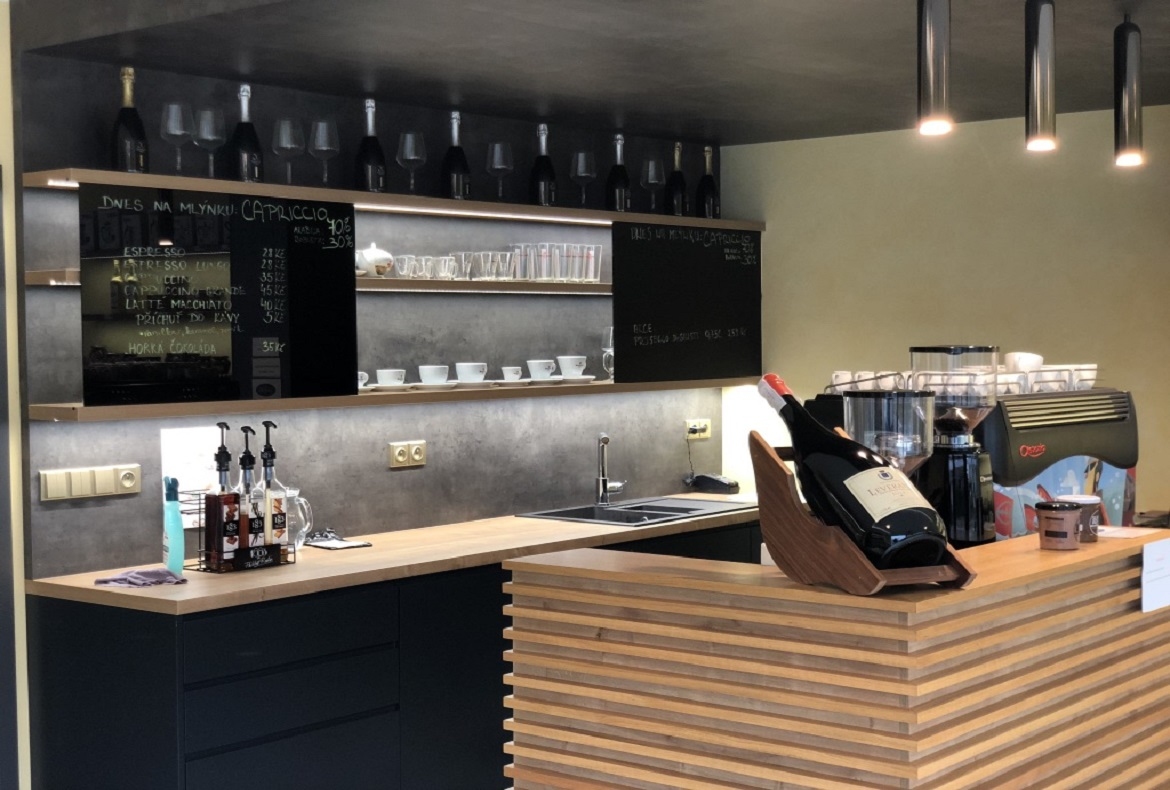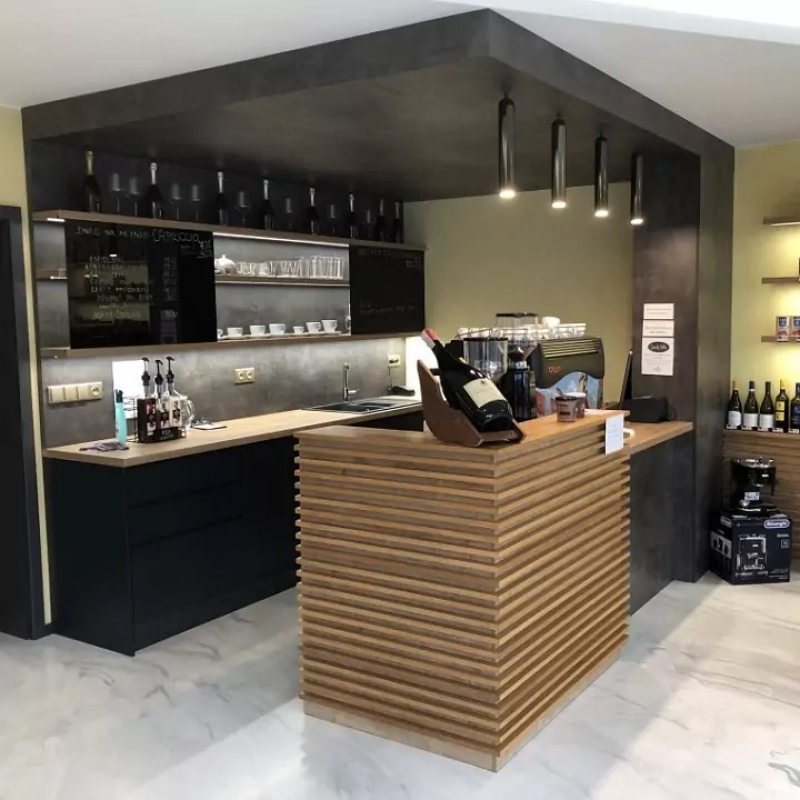 Menší kavárna s černým pohledem doplněná masivním dubem a rastry. Do kavárny jsme také vyráběli stoly, jídelní židle a věšák.