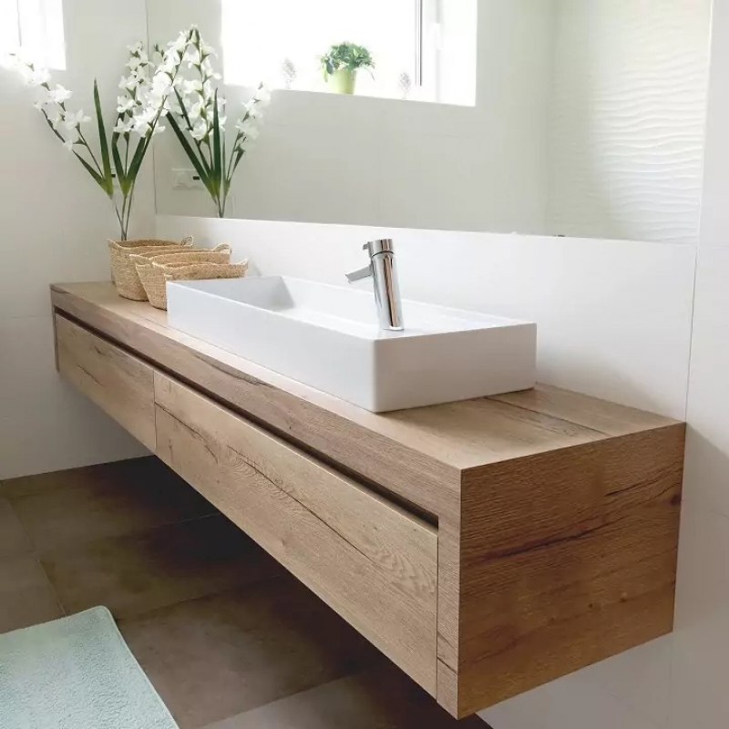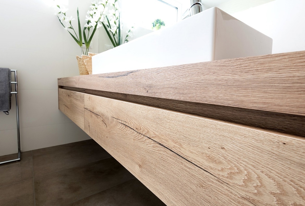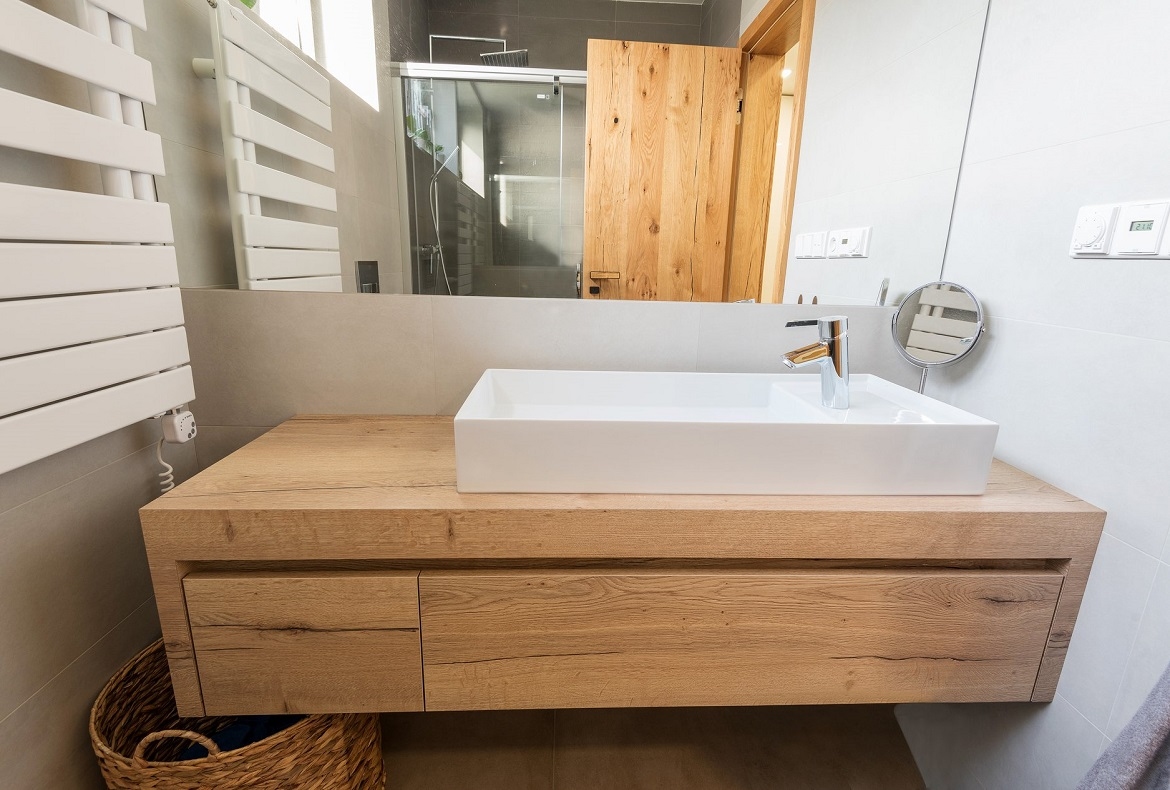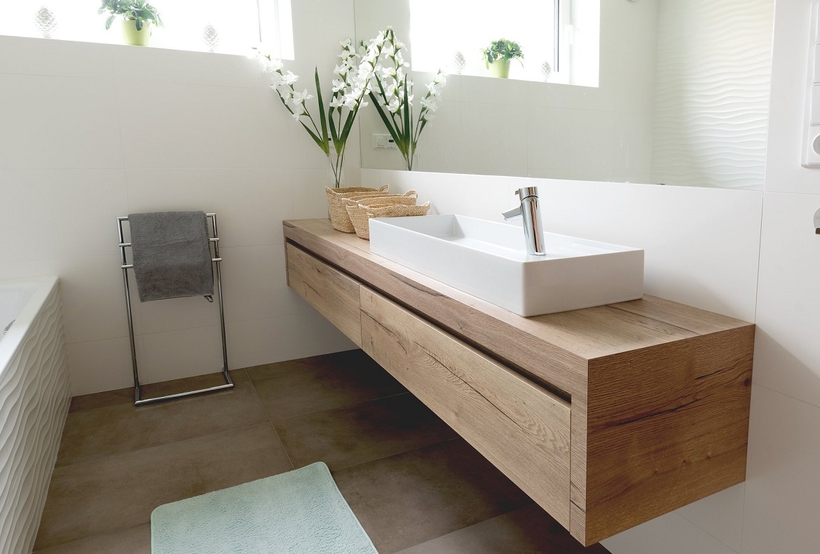 Čistý design koupelny, který je doplněn dubem a umyvadlem na desku.