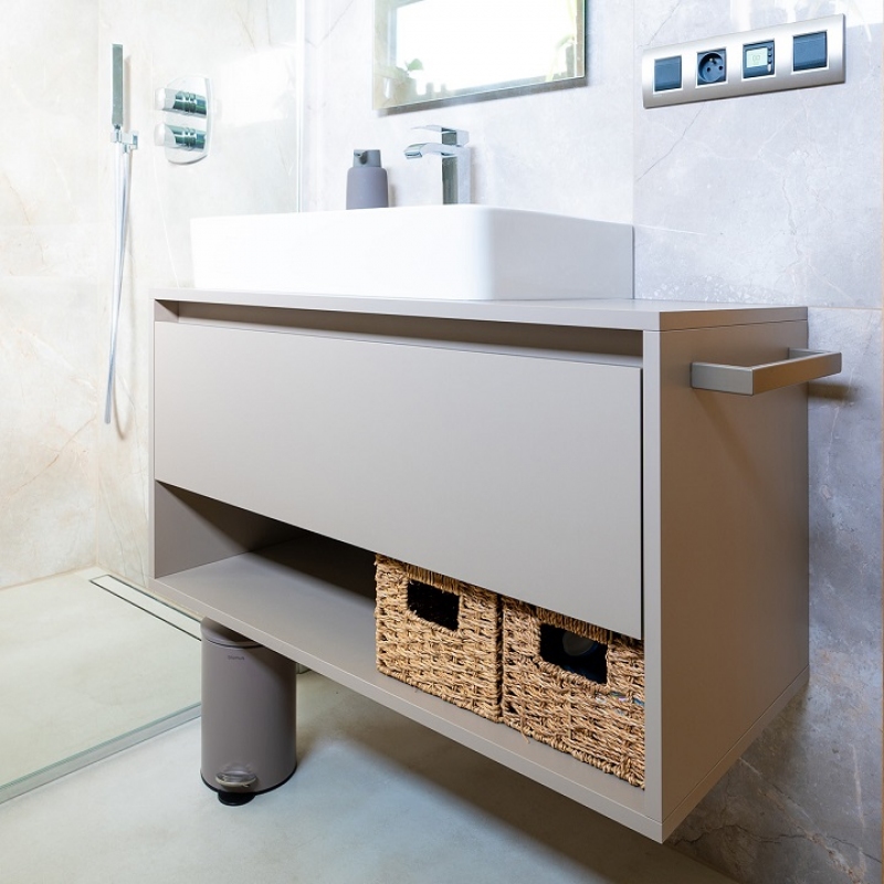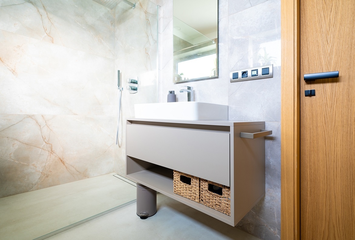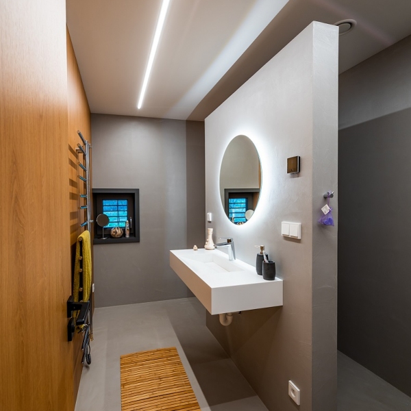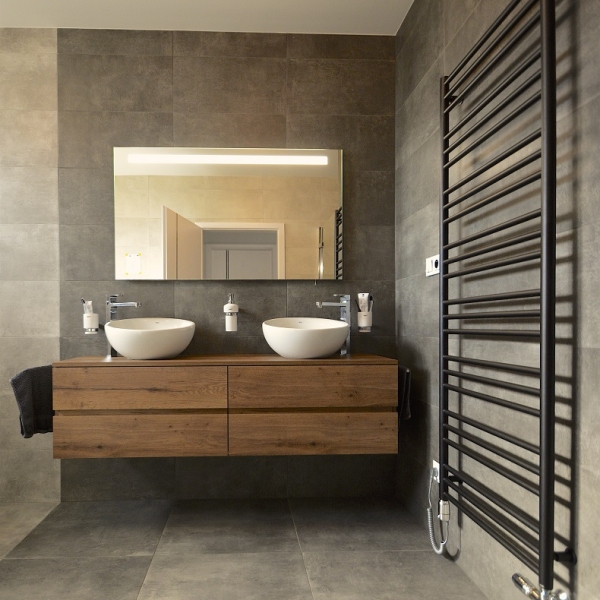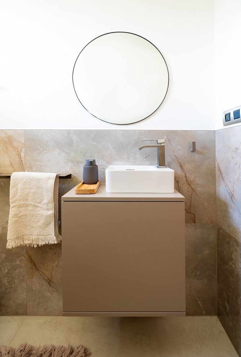 Jednoduchá koupelna v kašmírově šedé. Místo realizace: Vlkoš