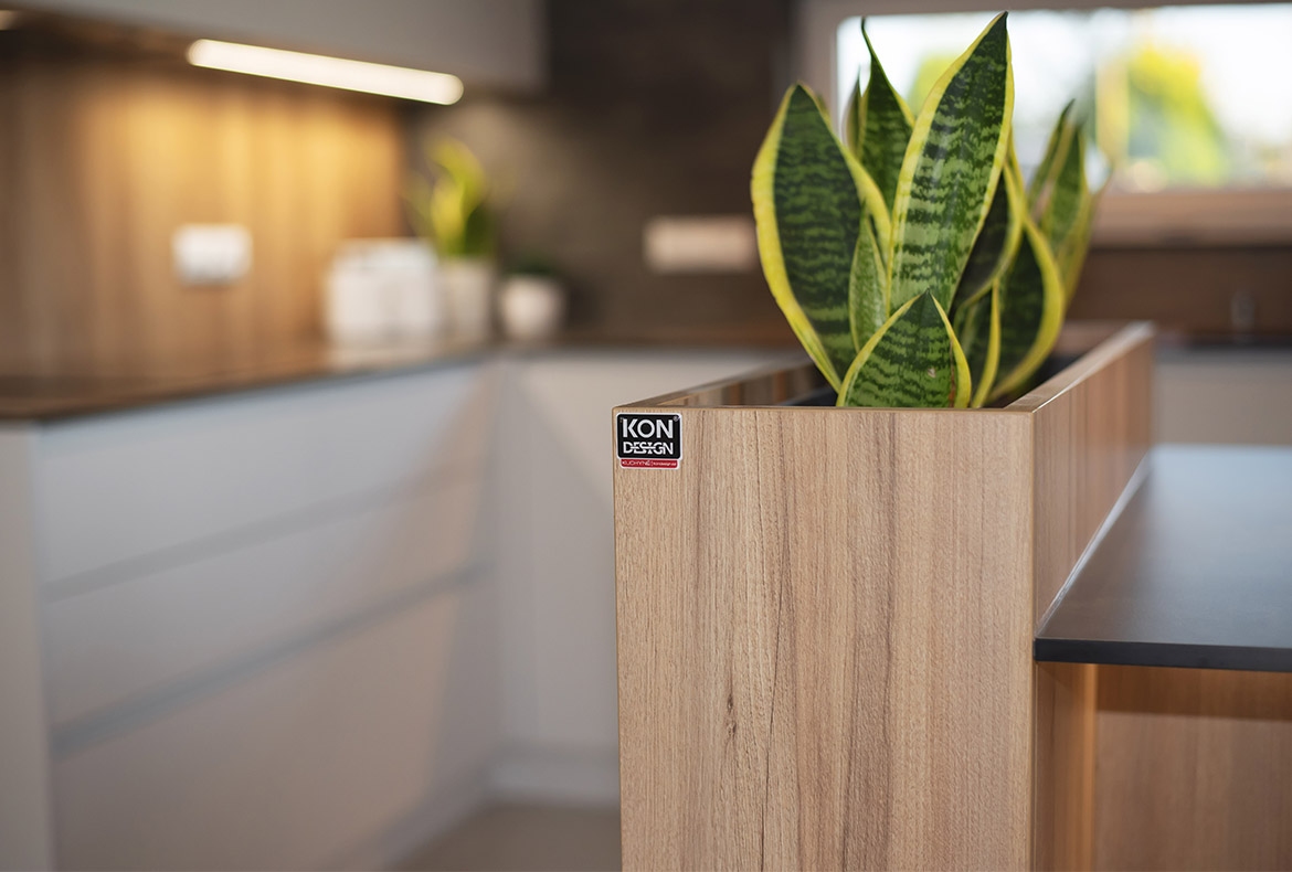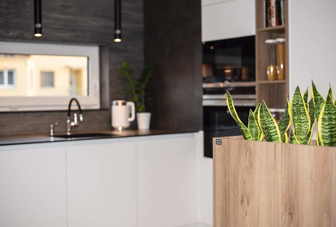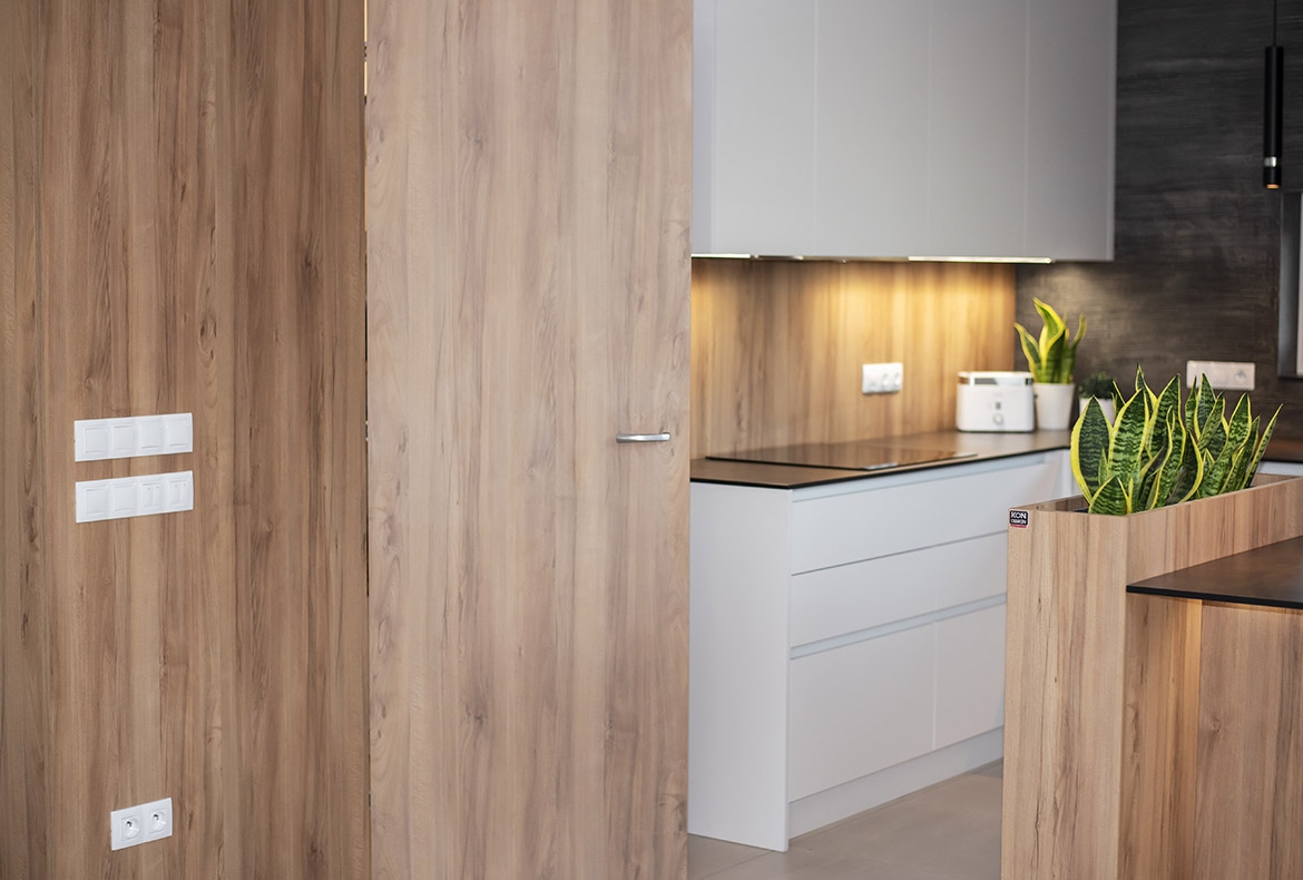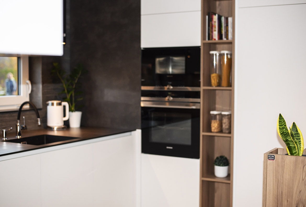 Netradiční ořech jsme realizovali s kompaktní pracovní desku se spodní montáží dřezu. Vstup do spíže je přes naše vyladěné bezfalcové dveře.