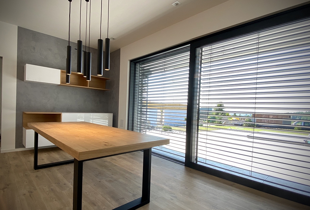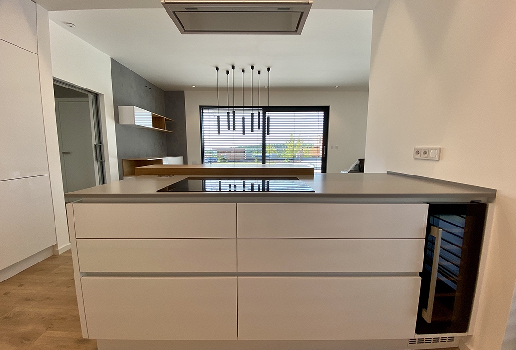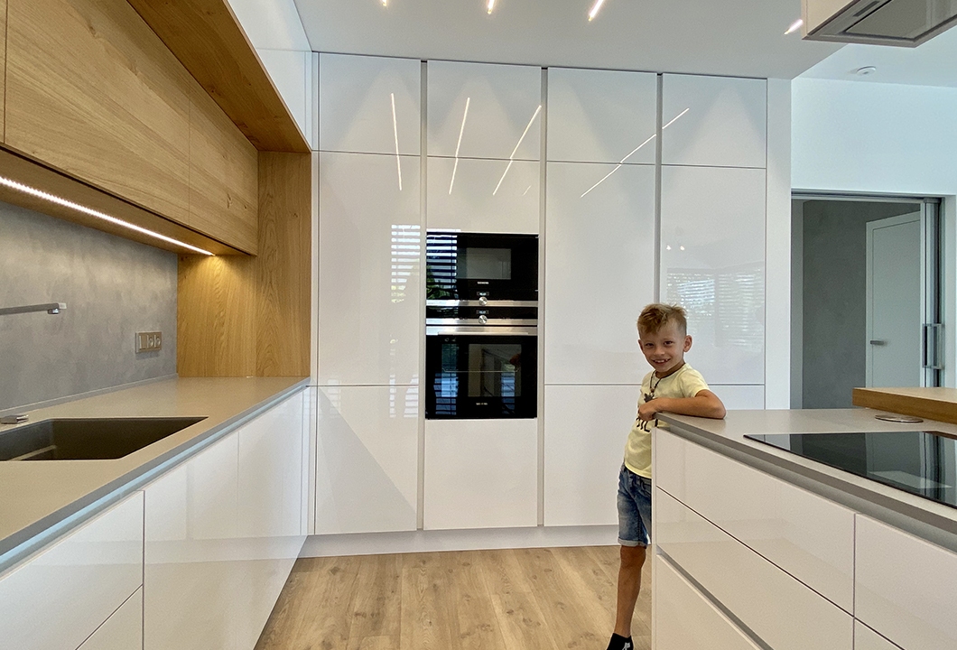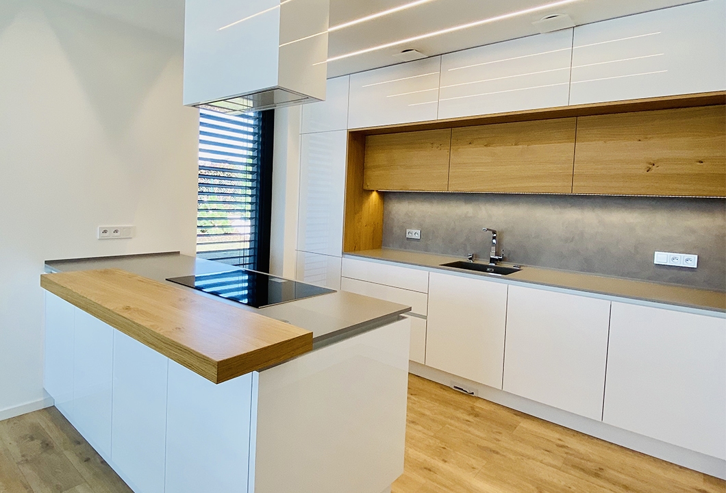 Bílá lesklá kuchyně s přírodní dýhou, stěrkou a pracovní deskou z umělého kamene.