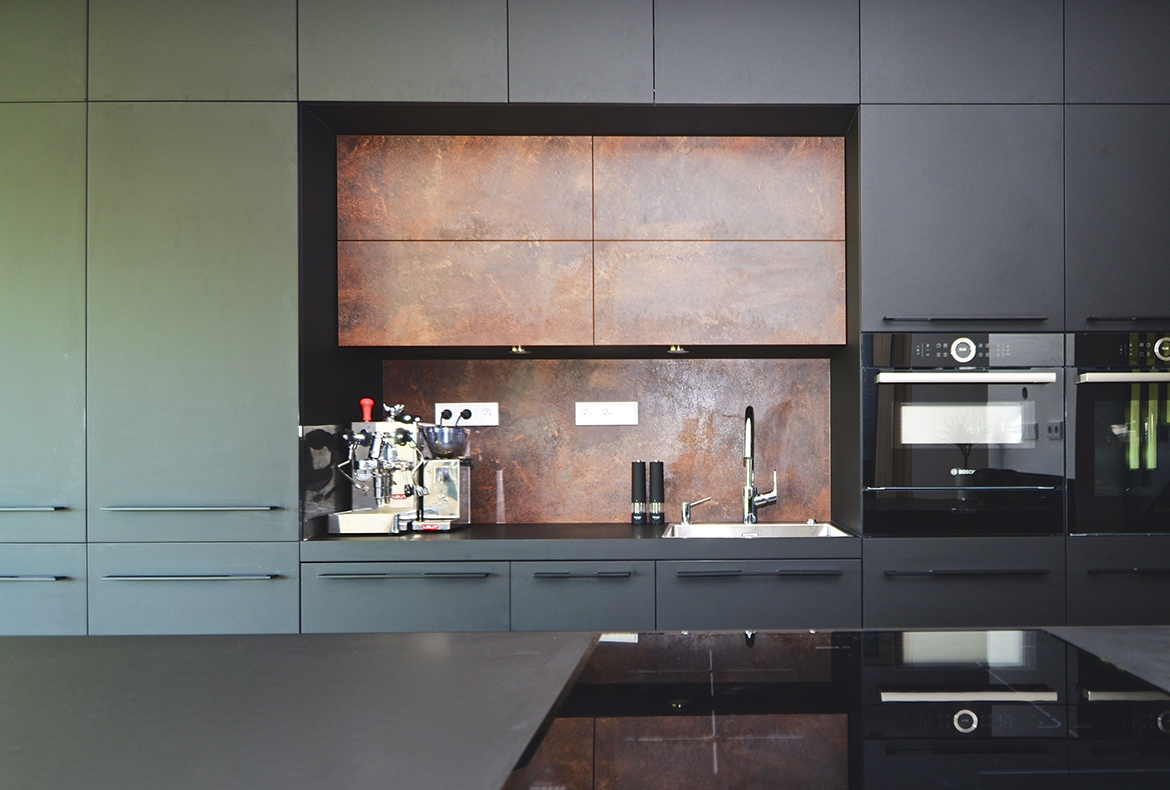 Černá kuchyně s bronzem a velkým ostrůvkem.