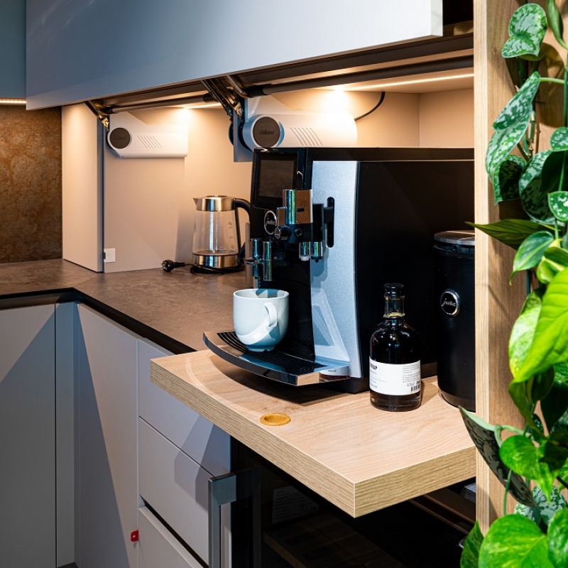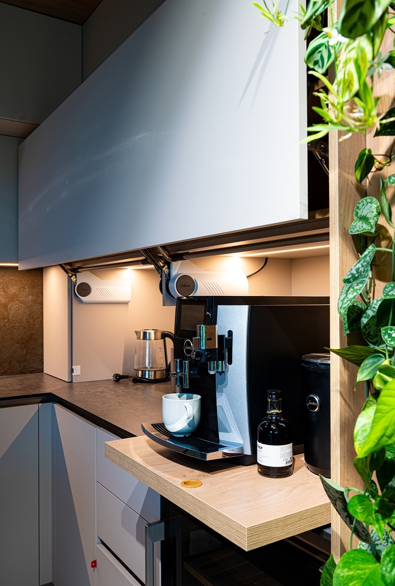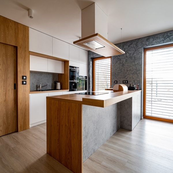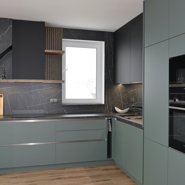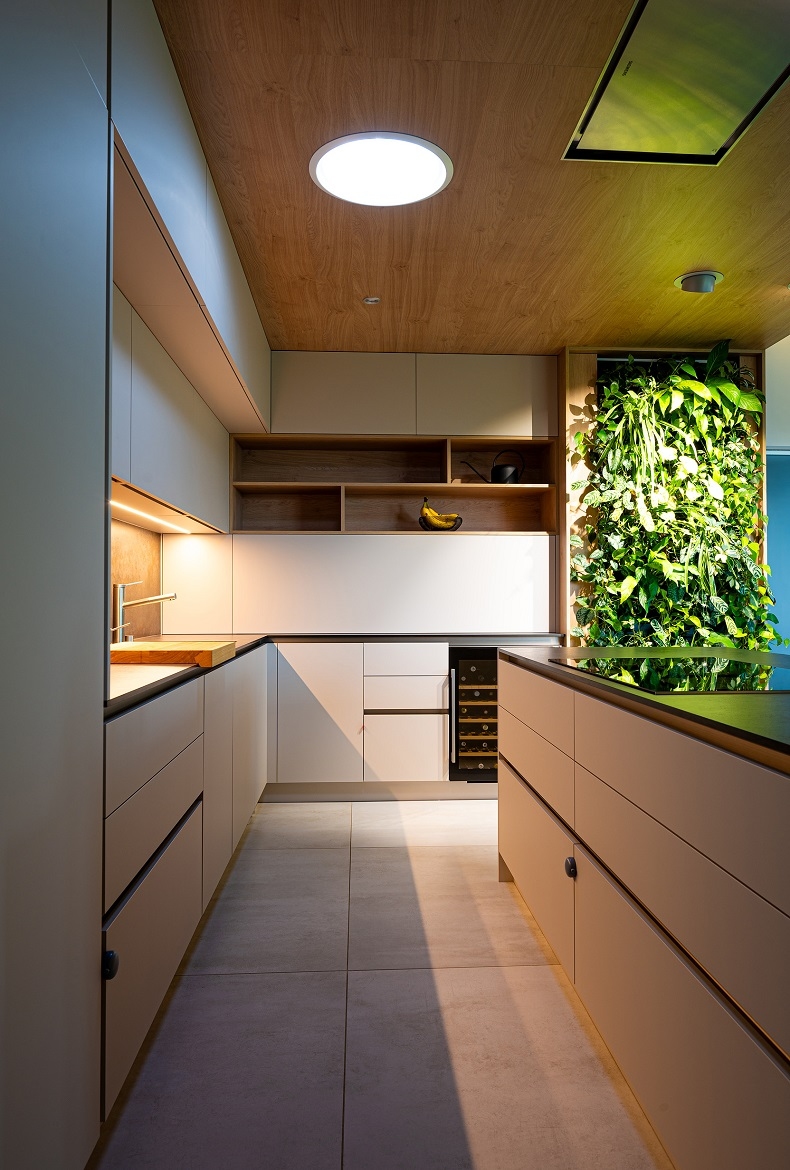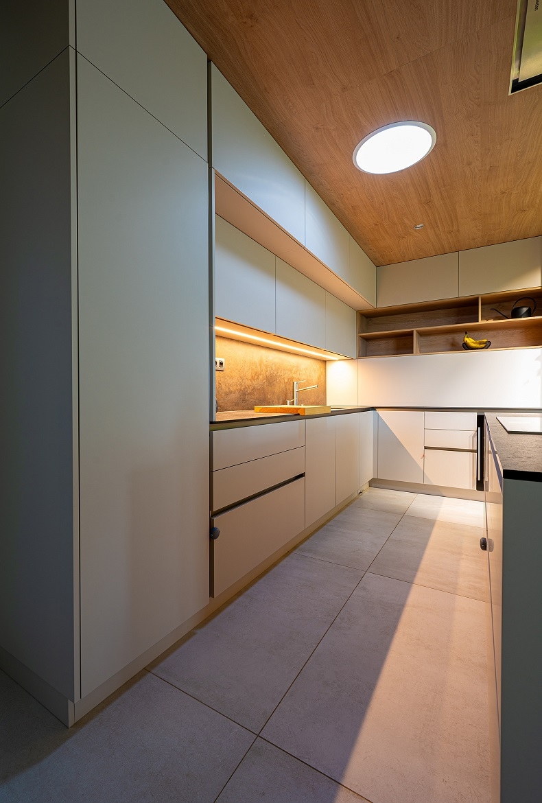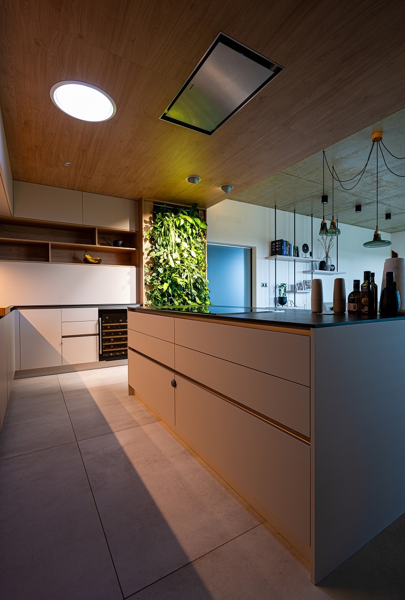 Prostorná jednoduchá kuchyně se zajímavými detaily - obloženým stropem, zelenou stěnou a schovaným snídaňovým koutkem.