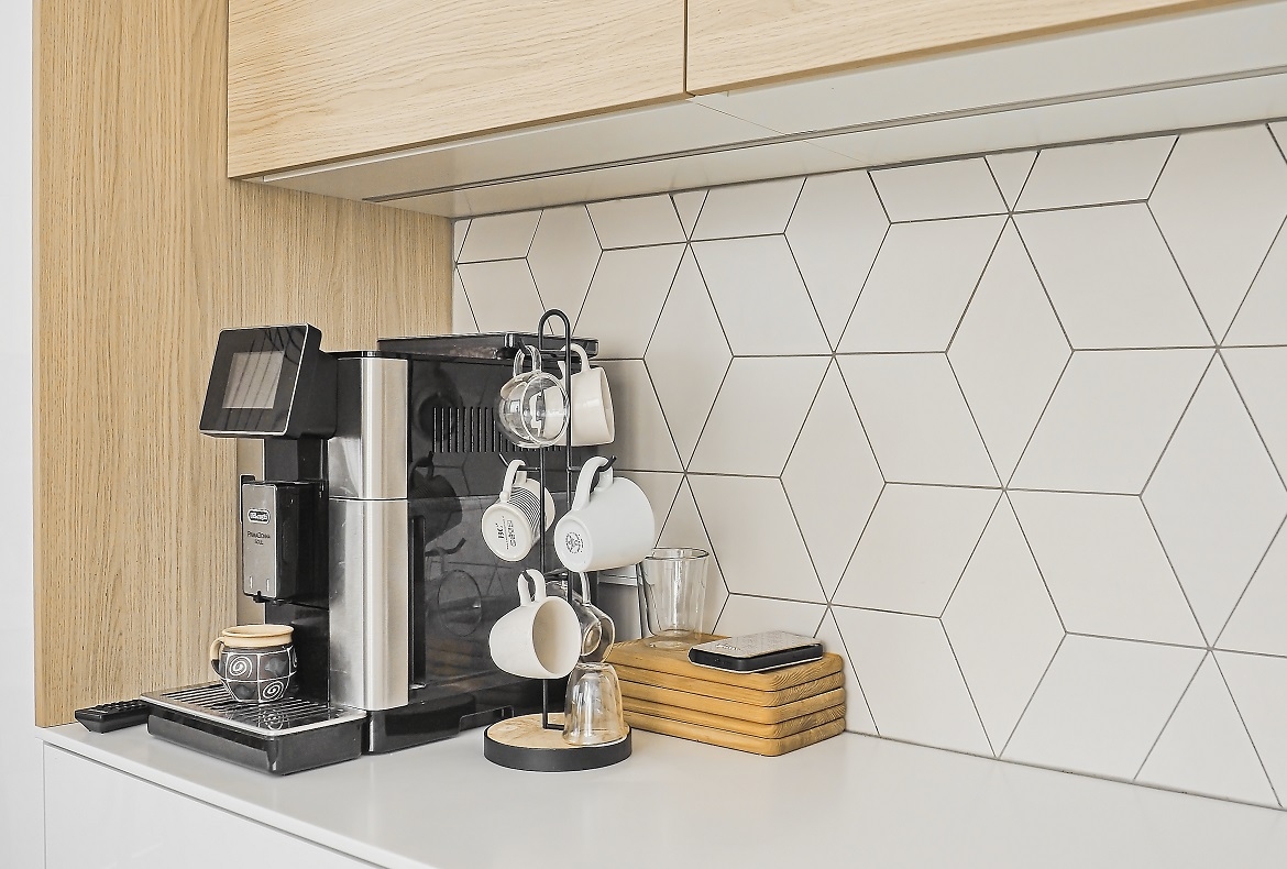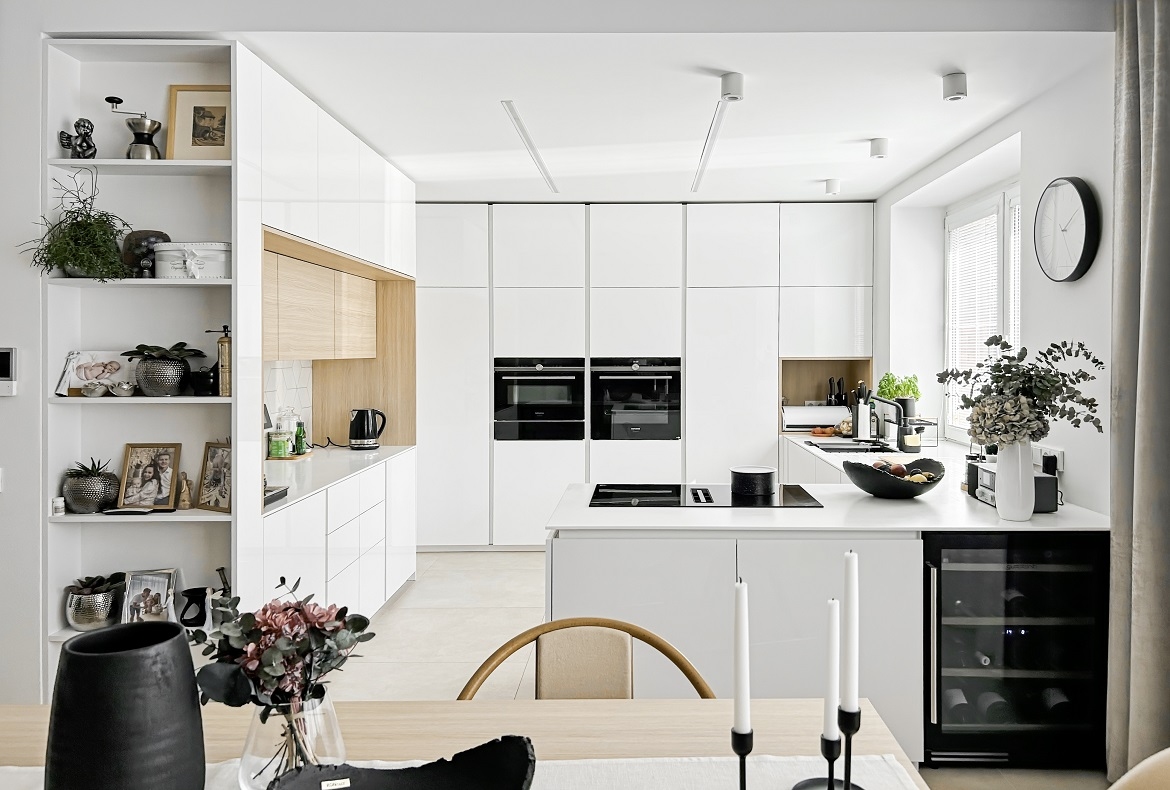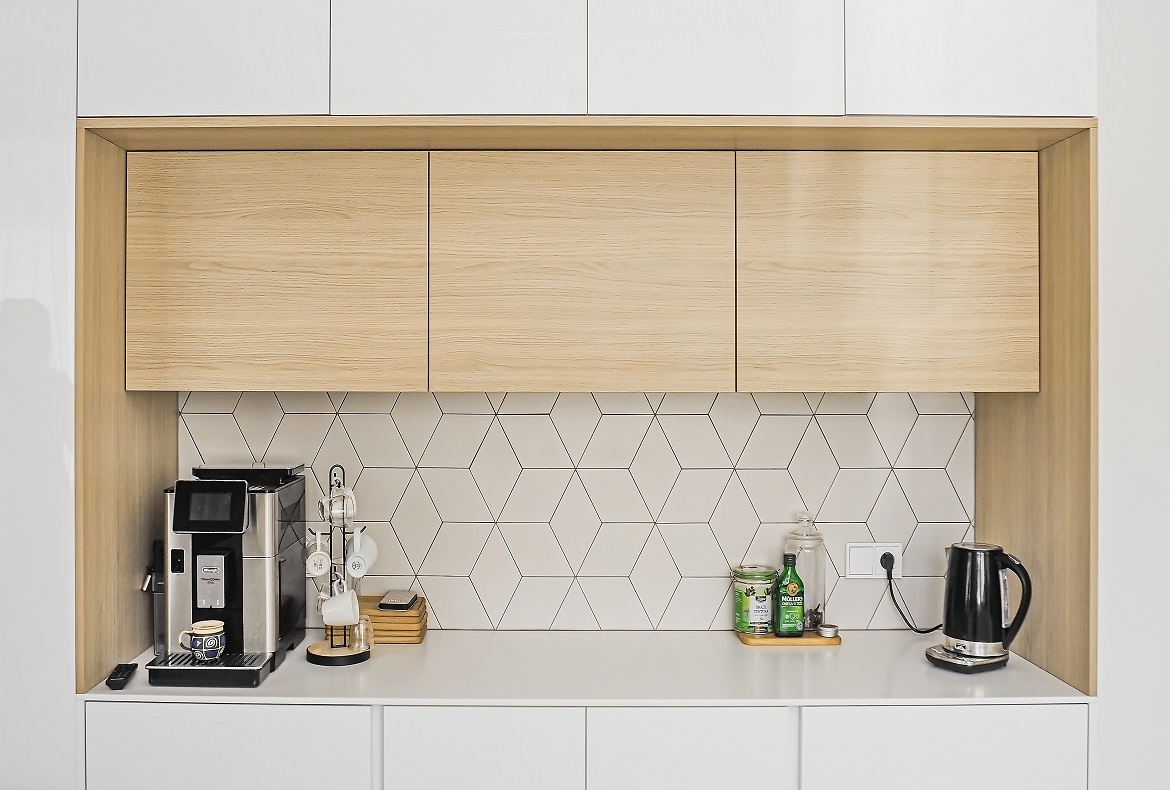 Kuchyně bílá s geometrickým obkladem.
