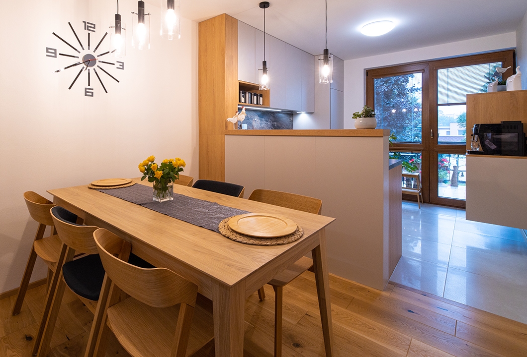 Praktická kuchyň s dominantní pracovní deskou a zástěnou.