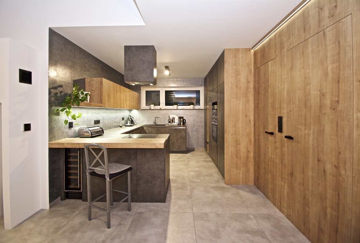 Kuchyně v dekoru betonu s barovým pultem a vinotékou.