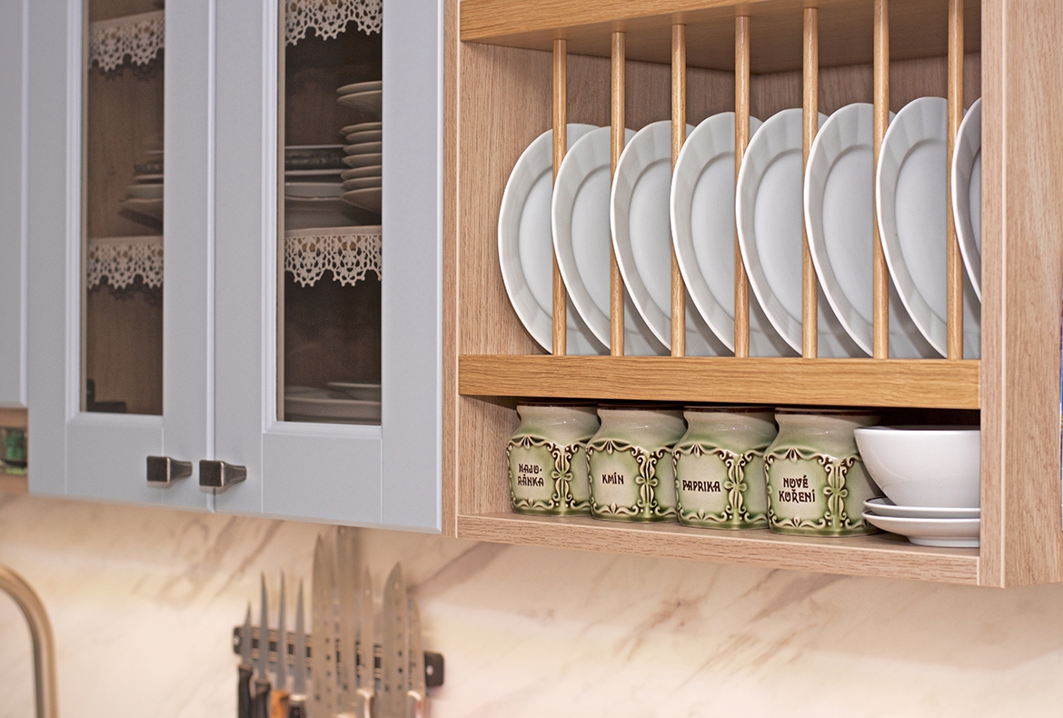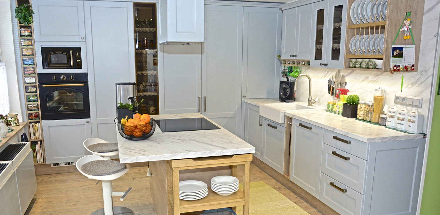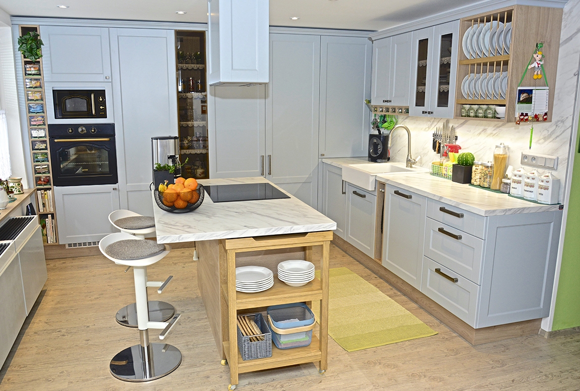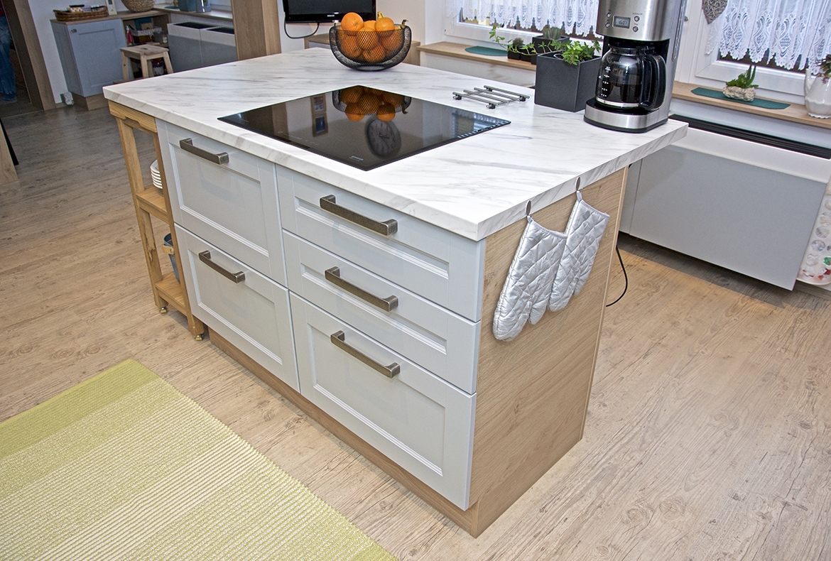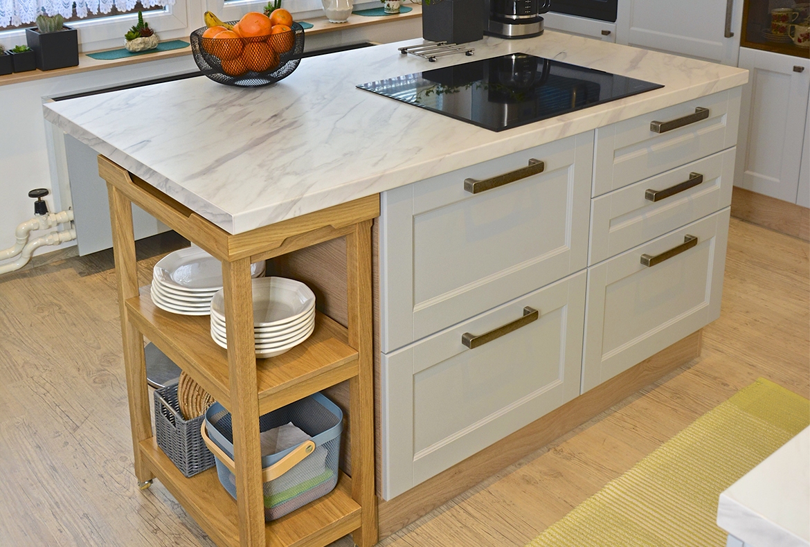 Kuchyně ve stylu vintage s ostrůvkem jsme ozvláštnily o menší pojezdný jídelní stolek, který se dá využít mnoha způsoby.