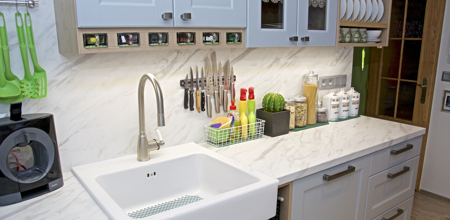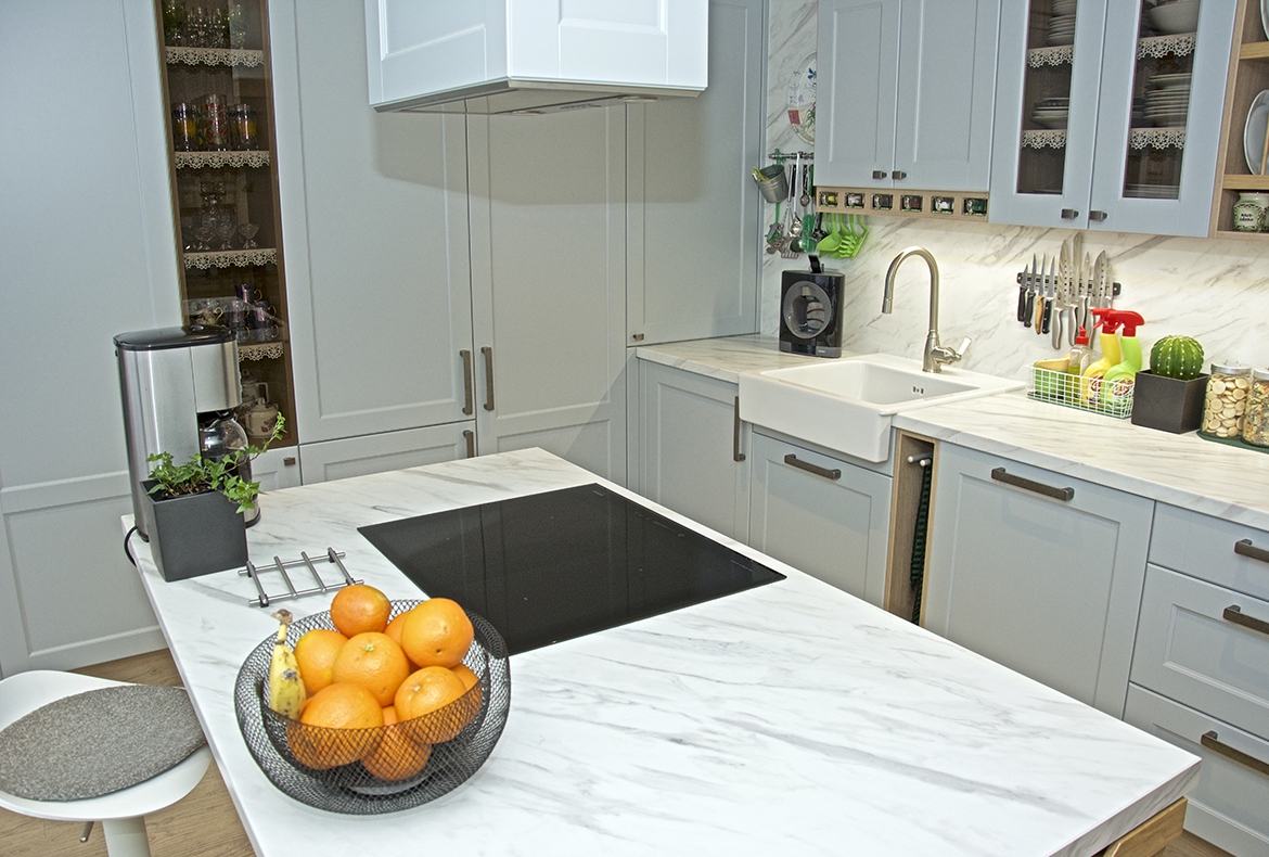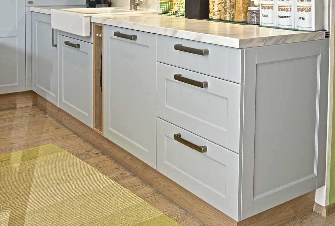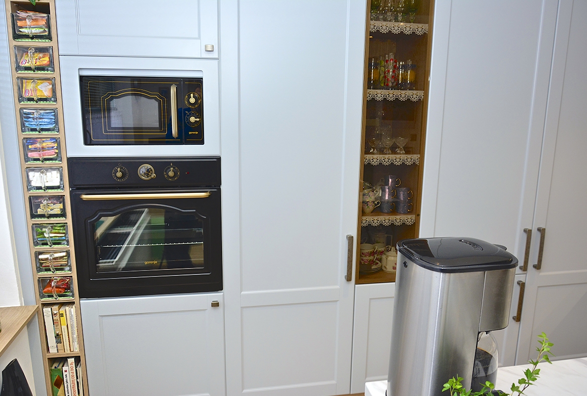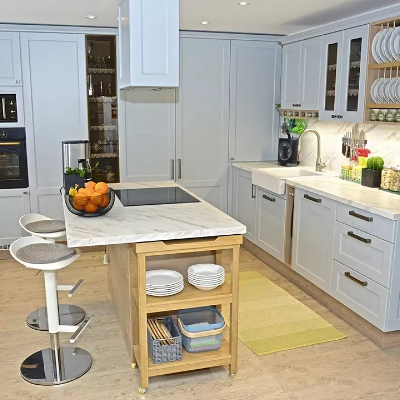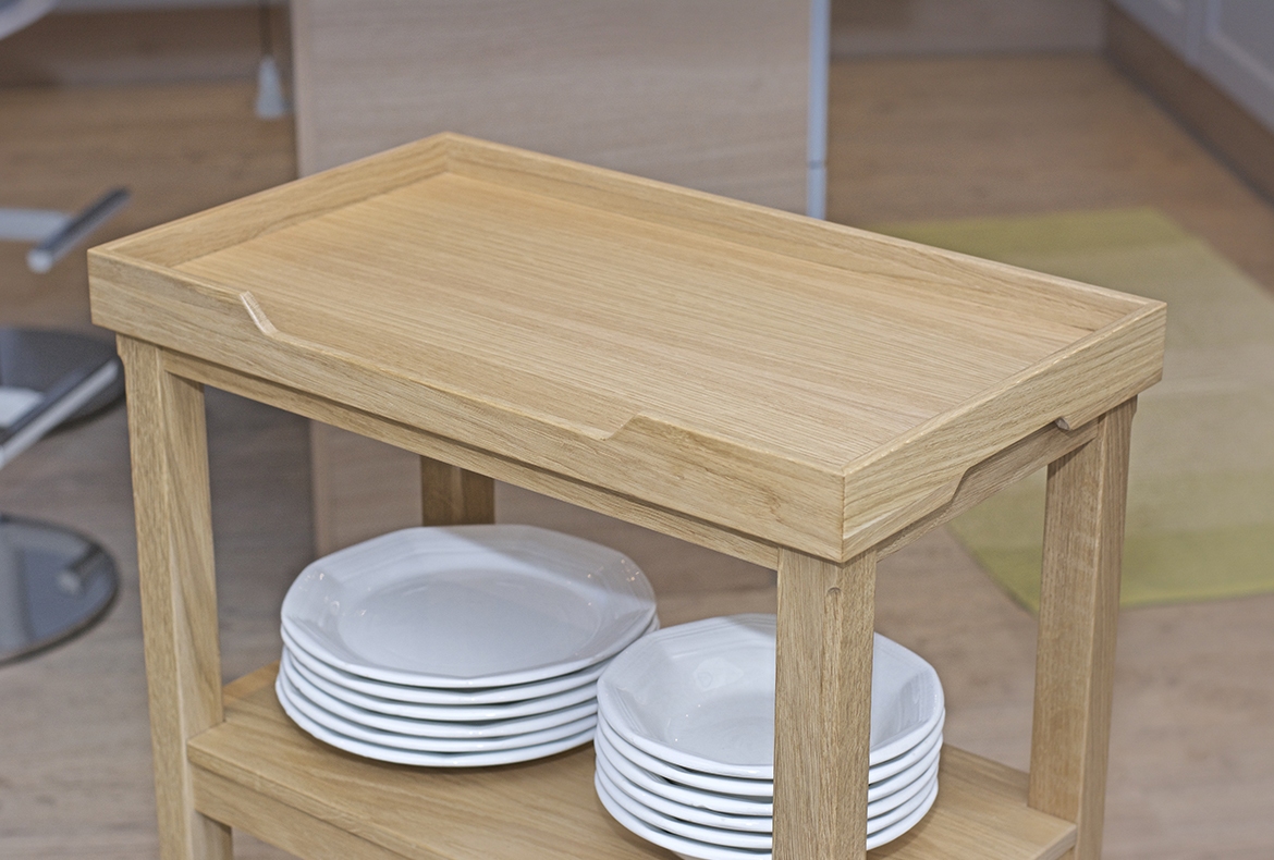 Kuchyně ve stylu vintage s ostrůvkem jsme ozvláštnily o menší pojezdný jídelní stolek, který se dá využít mnoha způsoby.